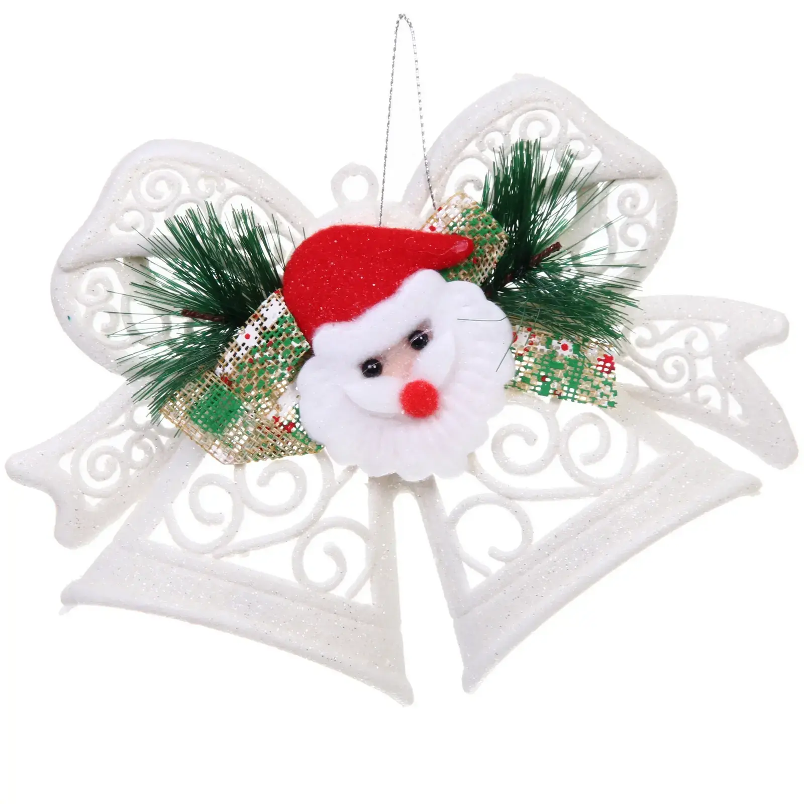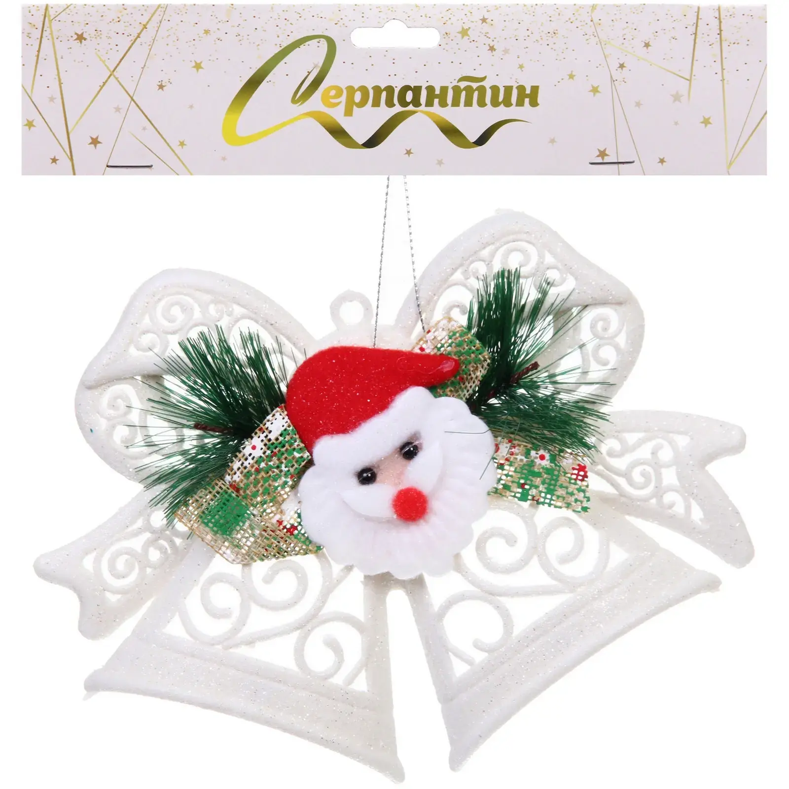 Преимущества данного украшения заключаются не только в его привлекательном дизайне, но и в высоком качестве материалов. Белый цвет колокольчиков с блестящей поверхностью прекрасно сочетается с яркими элементами, такими как фигурка Деда Мороза с красной шапкой и зеленые еловые веточки. Это создает гармоничный и праздничный вид, который будет радовать глаз в течение всего новогоднего сезона.