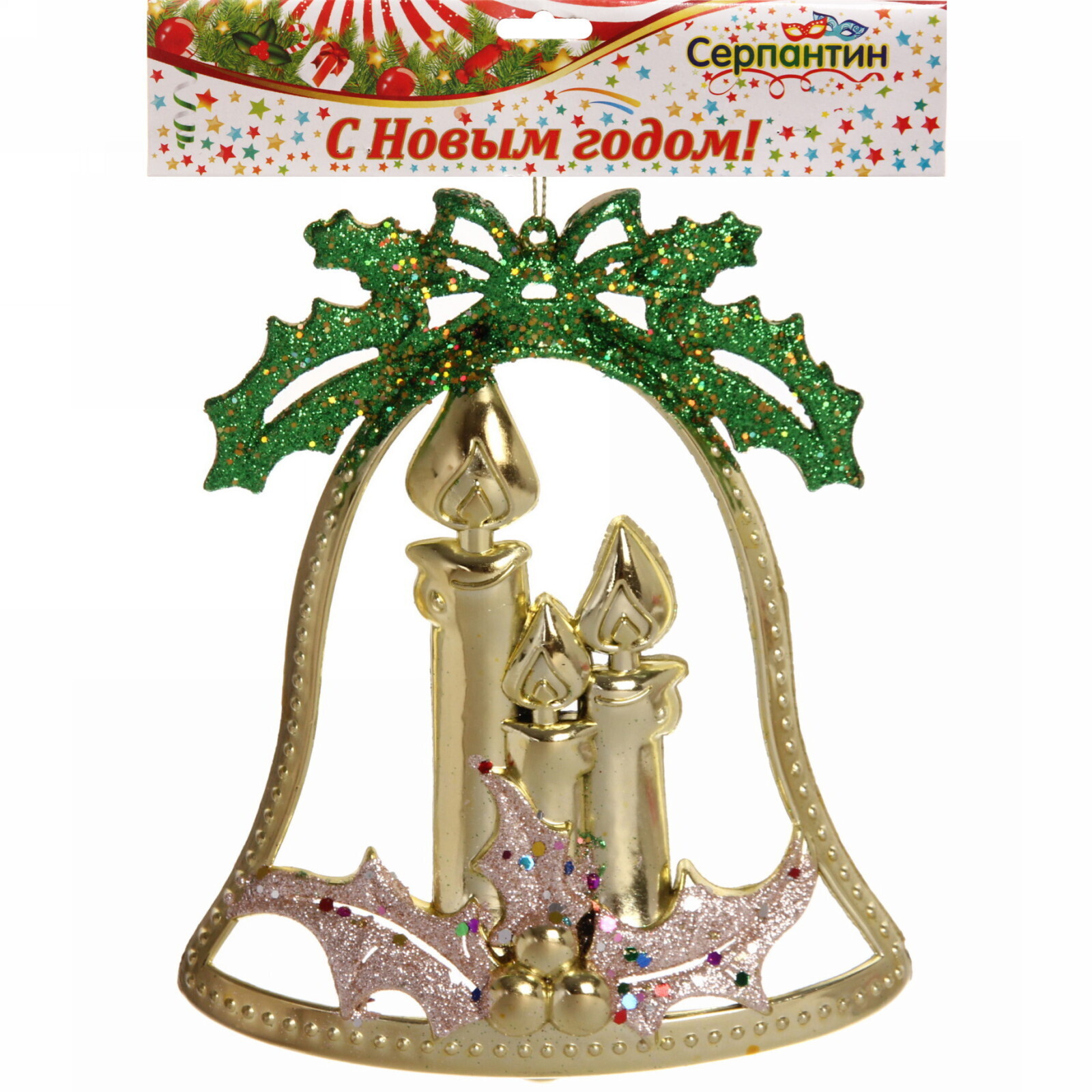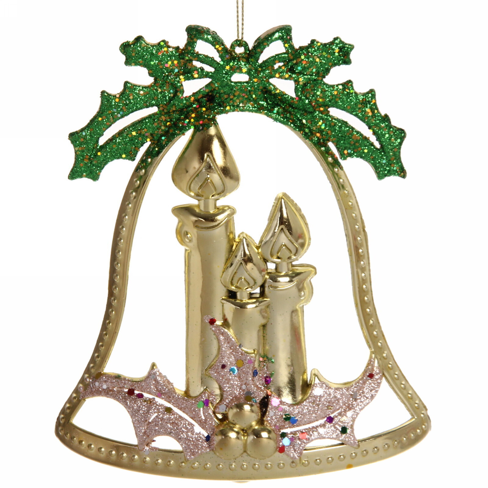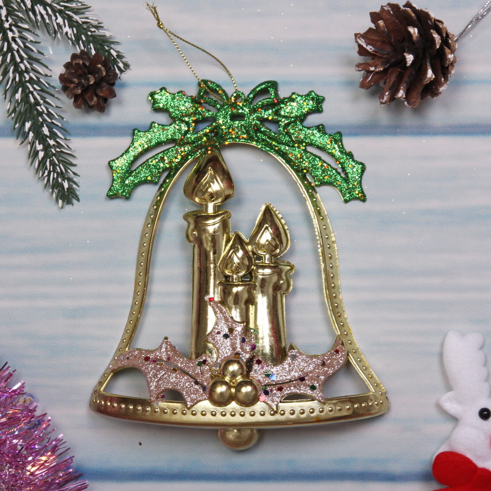 Это украшение выделяется своим качественным исполнением и стильным дизайном. Золотистый цвет колокольчика и блестящие детали создают эффектный вид, который привлечет внимание. Внутри колокольчика находятся три свечи, которые добавляют дополнительный уют и создают теплый свет. Листья остролиста и элементы, имитирующие ягоды, придают украшению праздничный вид и делают его идеальным для новогоднего декора.