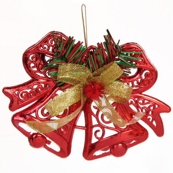 Размеры украшения составляют 13х10 см, что делает его компактным и удобным для размещения. Красный цвет колокольчиков отлично сочетается с золотыми и зелеными элементами, создавая гармоничный и праздничный вид. Не упустите возможность сделать ваш Новый год незабываемым с этим стильным украшением!