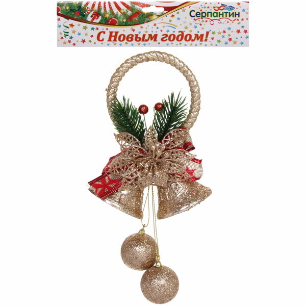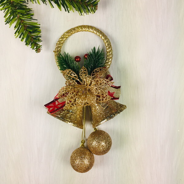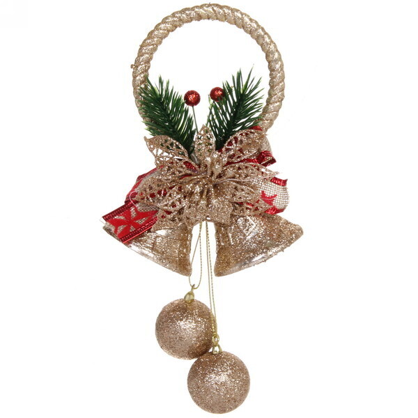Размеры украшения составляют 21 см в высоту и 12 см в ширину, что делает его компактным и удобным для размещения. Основной цвет — золотистый, с элементами красного и зеленого, что добавляет яркости и контраста. Декор включает два колокольчика, украшенных блестками, и дополнительные элементы, такие как хвойные ветки и ягодки, что делает его еще более привлекательным.