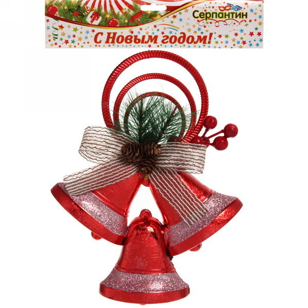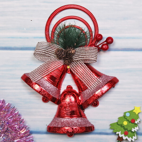 Размер украшения составляет 26х19 см, что делает его заметным, но не слишком громоздким. Красный цвет колокольчиков с блестящей поверхностью и декоративными элементами в виде зелени и ягод создают гармоничное сочетание, которое будет радовать глаз. Это украшение станет отличным подарком для друзей и близких, а также прекрасным дополнением к вашему новогоднему декору.