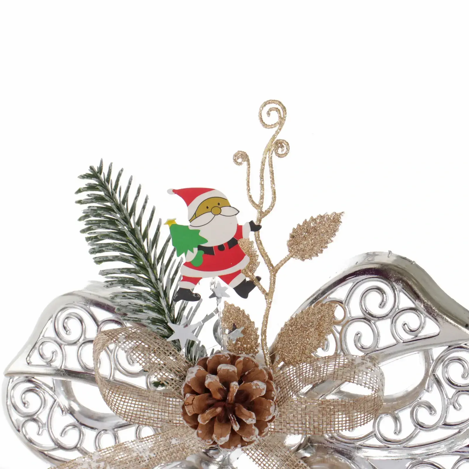 Преимущества этого украшения заключаются в его высоком качестве и долговечности. Изготовленное из пластика, оно устойчиво к повреждениям и легко очищается. Размеры 28х21 см делают его универсальным для различных стилей оформления. Элементы декора, такие как фигурка Санта-Клауса, шишка и зелёные веточки, добавляют изделию праздничный вид и делают его незаменимым атрибутом новогодних праздников.