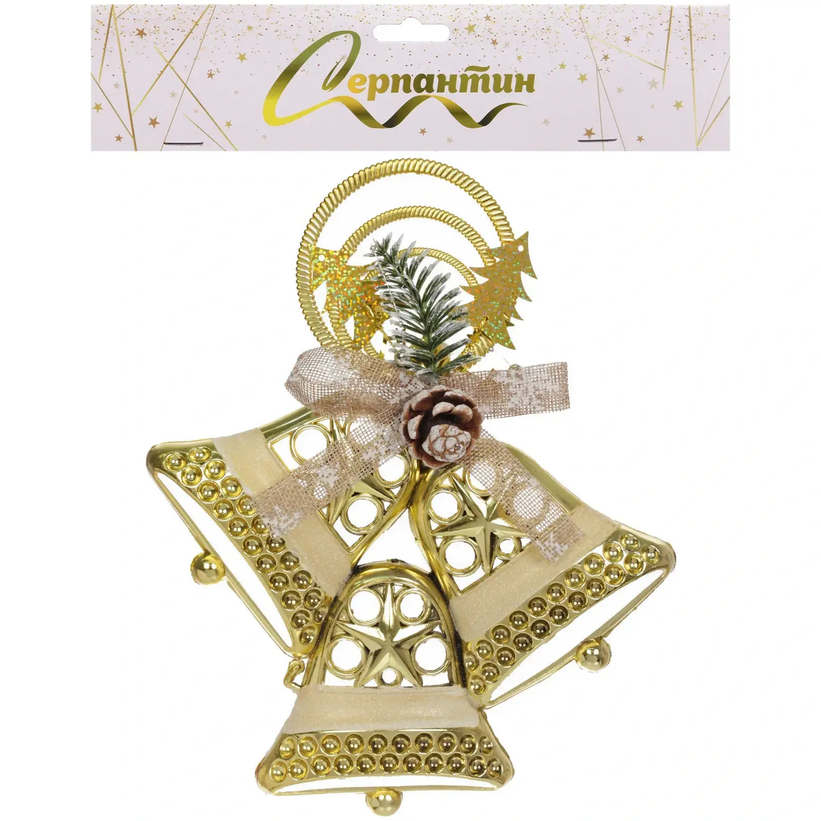 Размер украшения составляет 25х30 см, что делает его достаточно заметным, но не слишком громоздким. Оно выполнено из прочного пластика, что гарантирует его легкость и устойчивость к повреждениям. Золотой цвет колокольчиков придаёт изделию элегантный вид, а декоративные элементы, такие как шишки и зелёные веточки, добавляют натуральности и уюта.