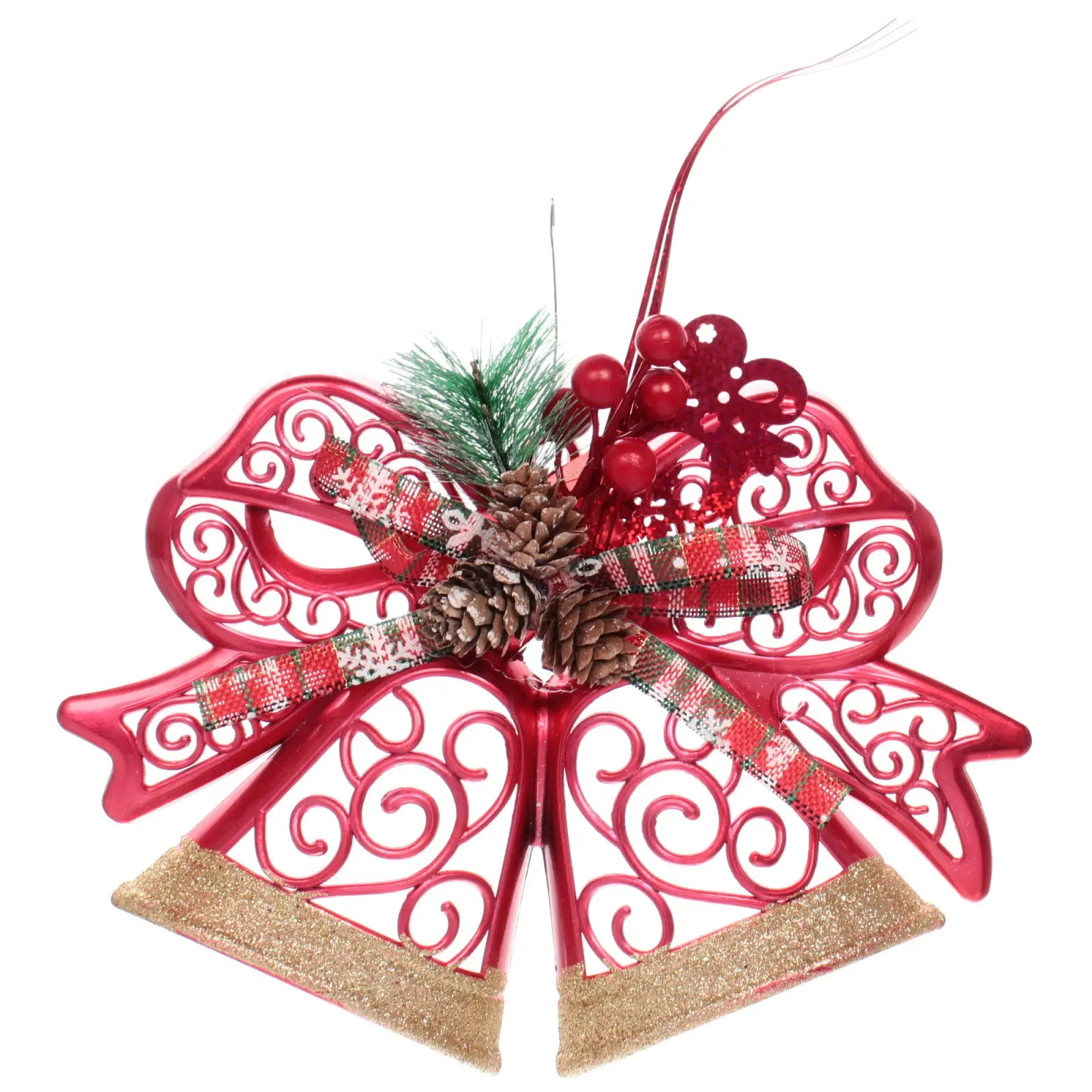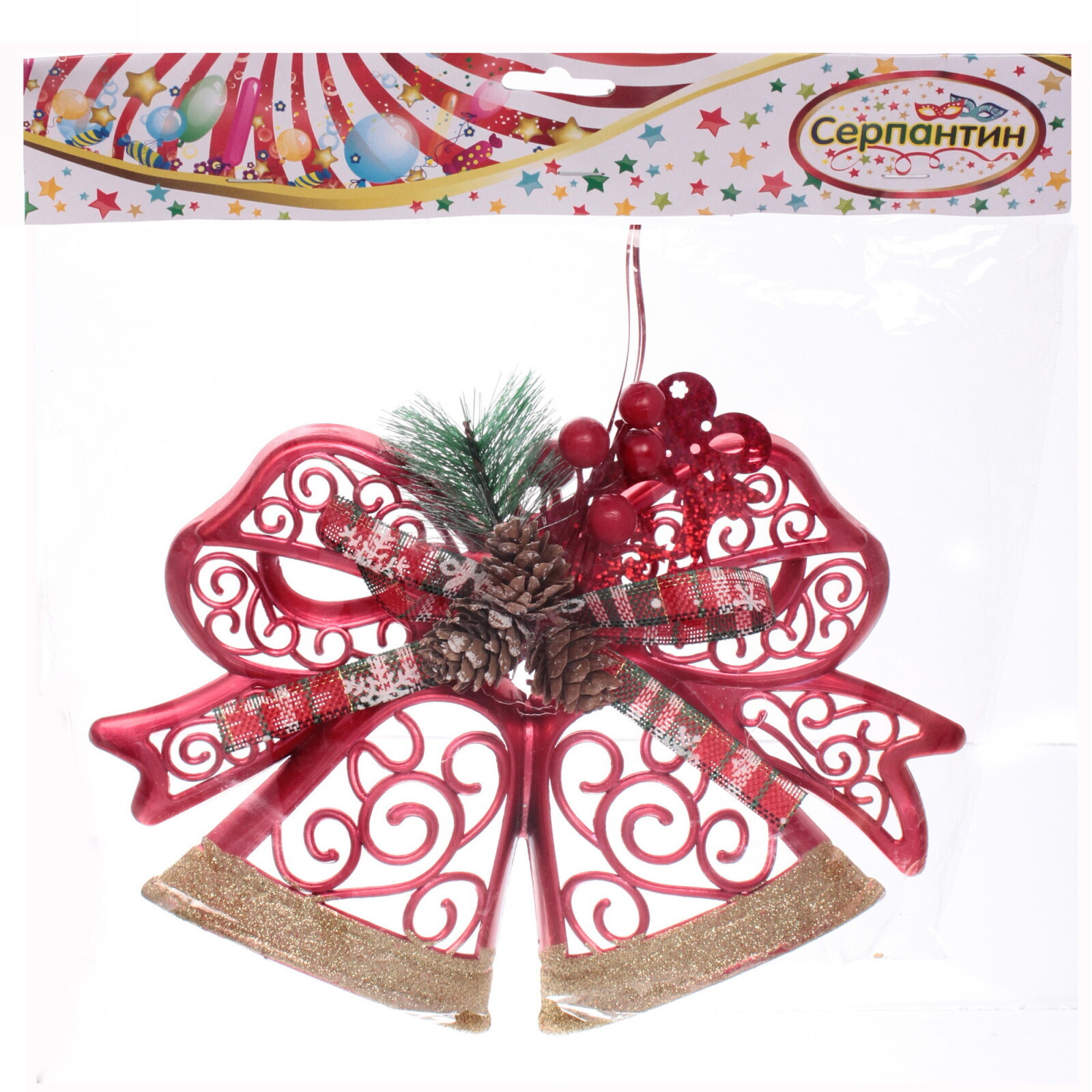 Размеры украшения составляют 27х23 см, что делает его заметным, но не слишком громоздким. Красный цвет с золотыми акцентами добавляет праздничного настроения, а декоративная лента с клетчатым узором придает изделию завершенный вид. «Лесной звон» станет отличным выбором для тех, кто ценит качество и стиль в новогоднем декоре.