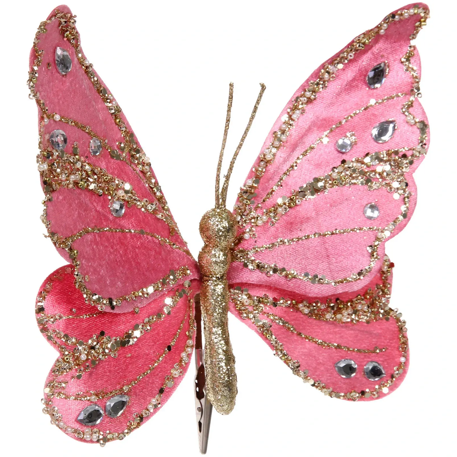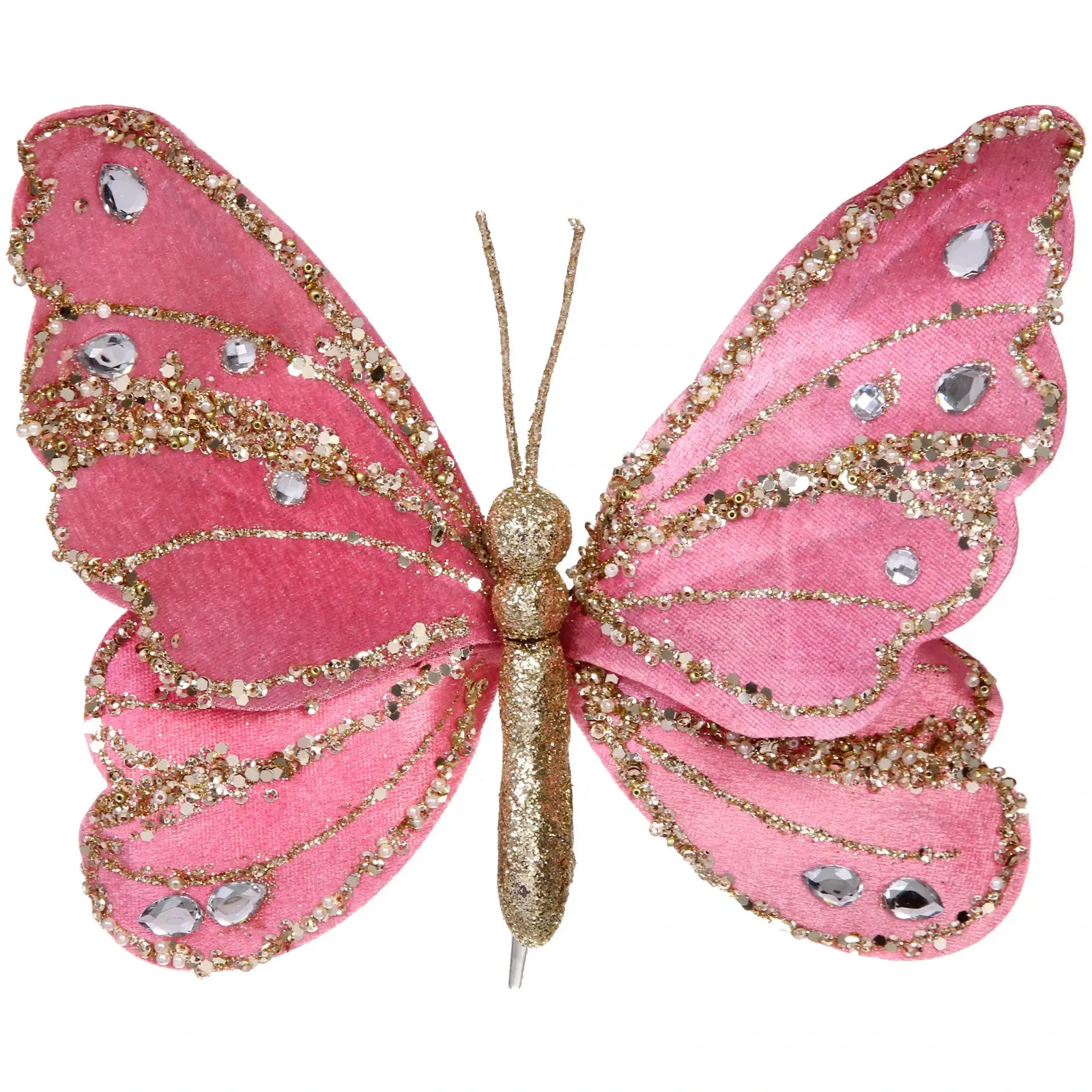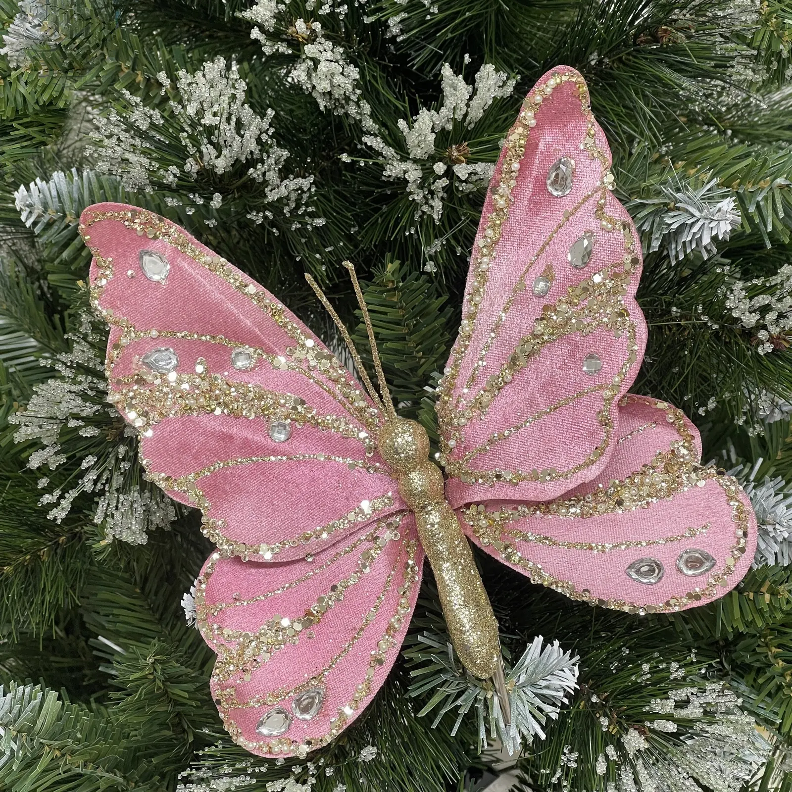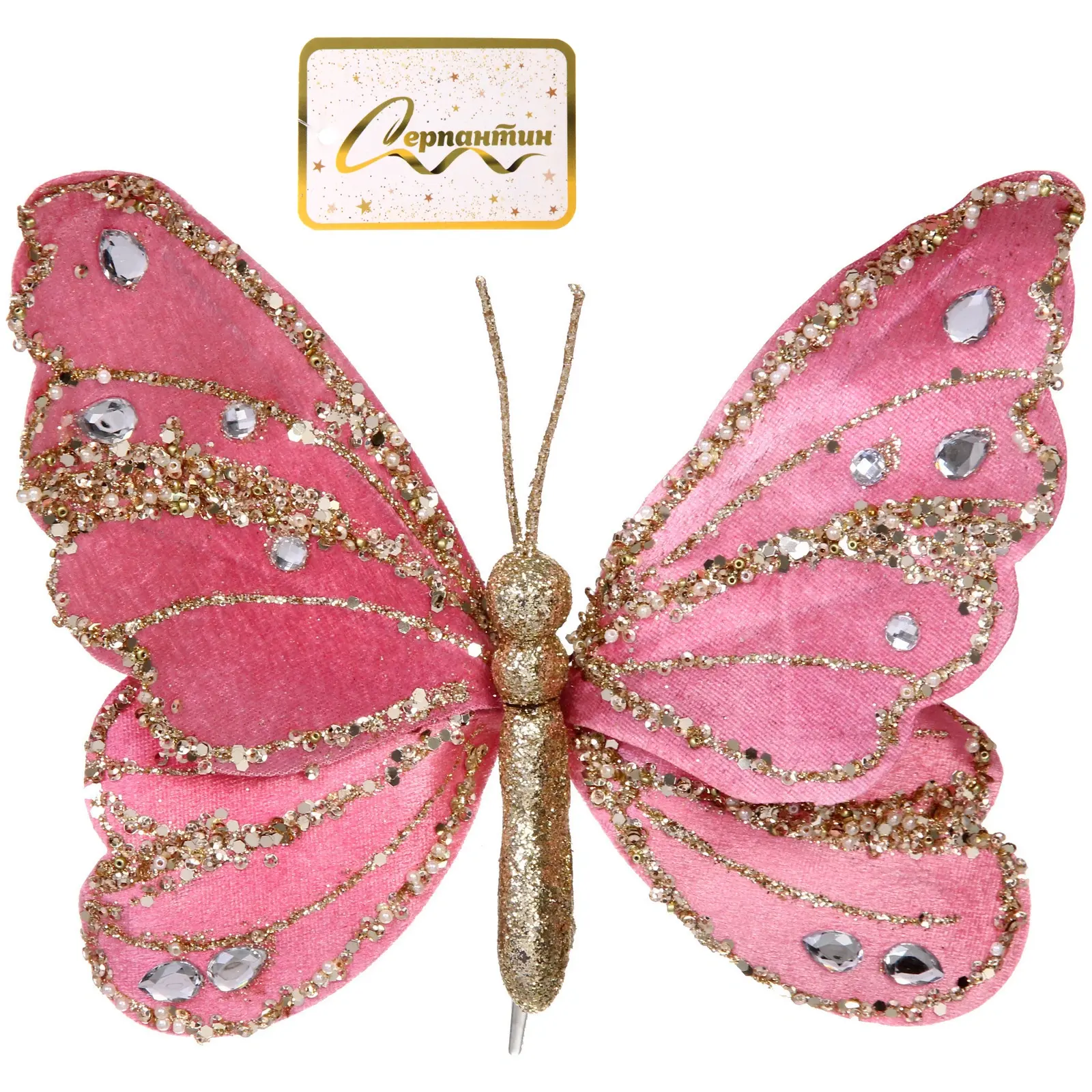 Добавьте утончённости и праздничного блеска интерьеру с декоративной бабочкой в нежных розовых оттенках. Её крылья украшены золотыми блёстками и сияющими прозрачными камнями, создавая ощущение роскоши и тепла. Такой аксессуар легко привлечёт внимание и станет ярким акцентом в новогоднем убранстве.