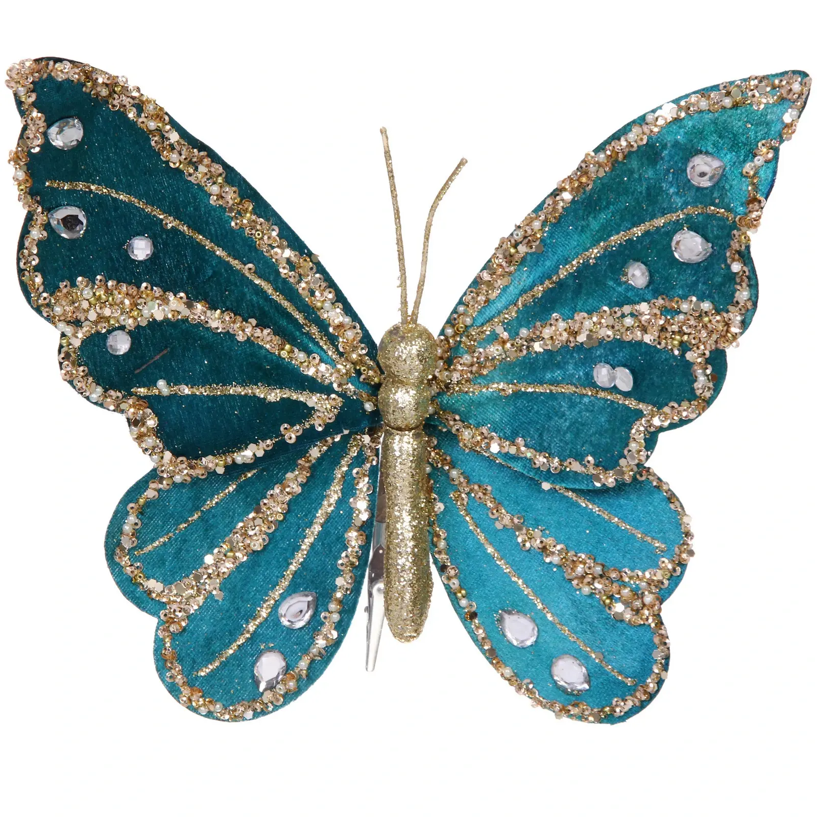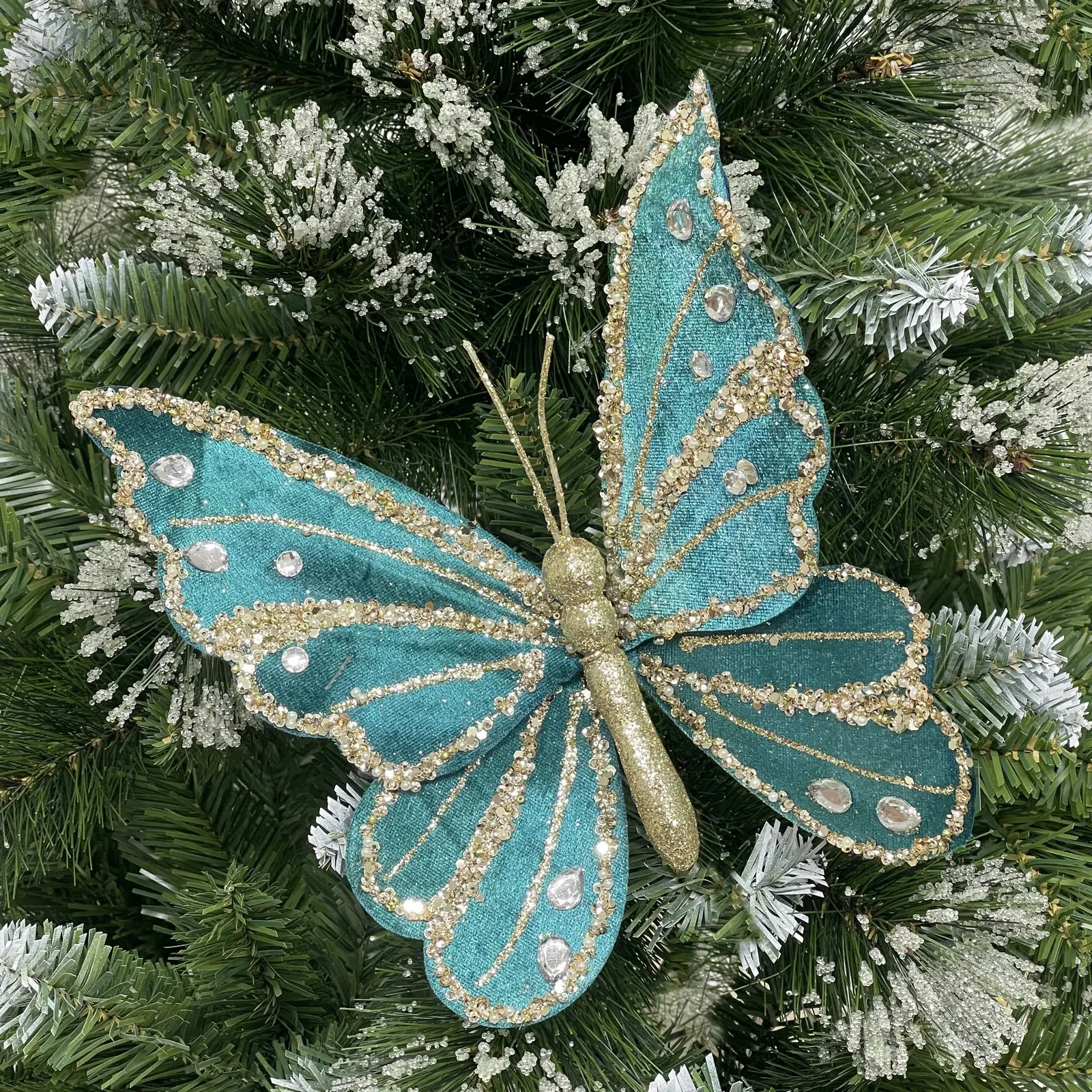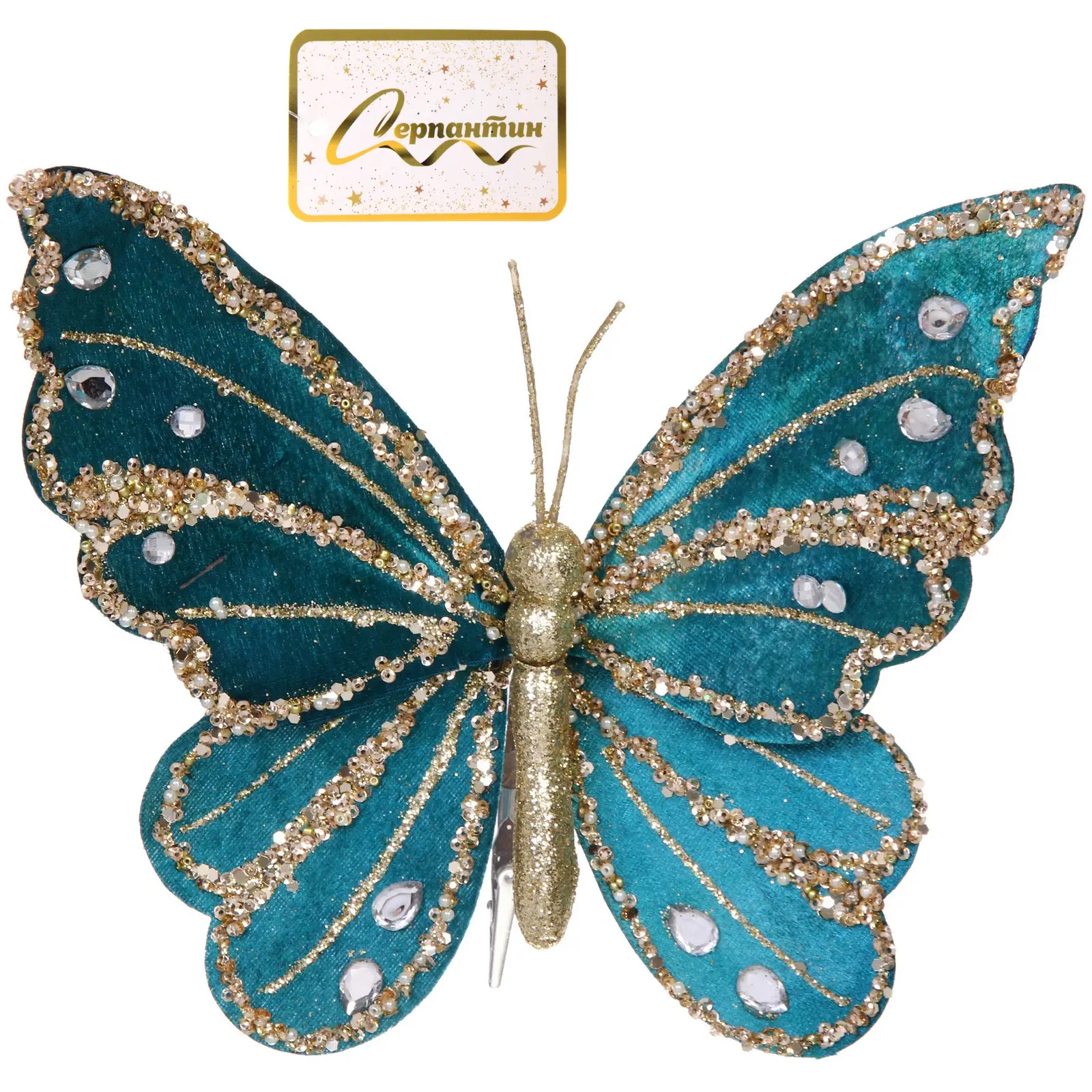 Добавьте утонченное сияние вашей ёлке или праздничной композиции с помощью декоративной бабочки в бирюзово-золотых тонах. Её изысканный дизайн, блестящие элементы и прозрачные стразы создают атмосферу торжества и уюта. Первое впечатление от неё — словно из зимней сказки, где каждая деталь продумана для максимальной красоты.