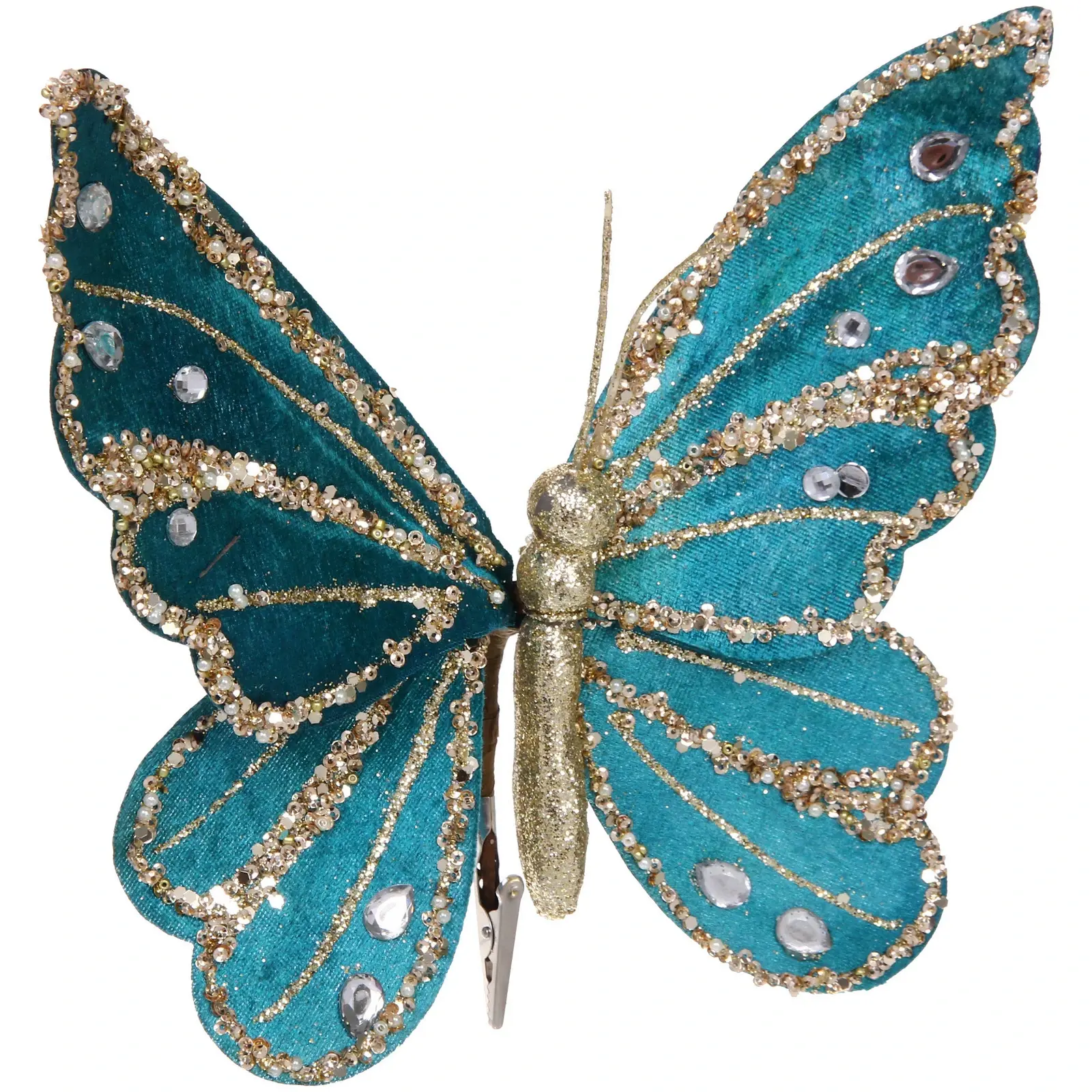 Крылья выполнены из текстильной основы с блестящим декоративным покрытием, тело — из пластика с золотистыми блёстками. Зажим металлический, серебристого цвета. Размер бабочки составляет 19х19 см, что делает её ярким, но не громоздким элементом декора. Отгружается один товар, цвет фиксированный — бирюзово-золотой.