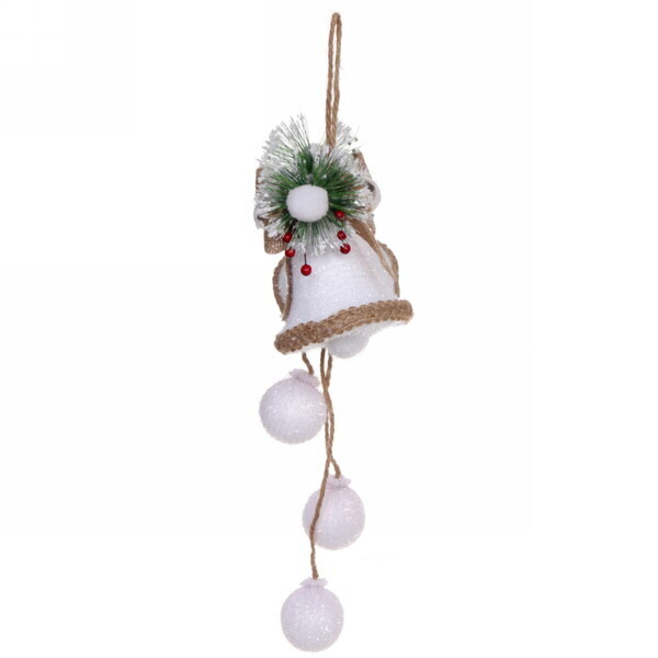 Это подвесное украшение станет идеальным дополнением к вашему новогоднему декору, придавая вашему интерьеру атмосферу уюта и праздника. С белыми колокольчиками, украшенными зелеными элементами и красными ягодами, вы сможете создать неповторимый стиль в вашем доме.