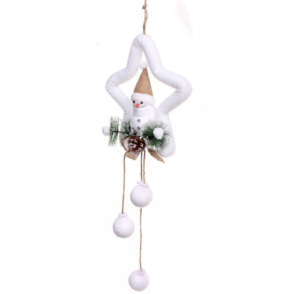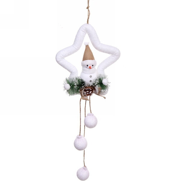 Это украшение выполнено из качественного полимерного материала, что обеспечивает его долговечность и устойчивость к внешним воздействиям. Белая звездообразная рамка с мягкой текстурой и улыбающийся снеговик с оранжевым носом создают гармоничное сочетание, которое будет радовать глаз. Искусственные зеленые веточки и шишка добавляют натуральности и делают декор более живым.