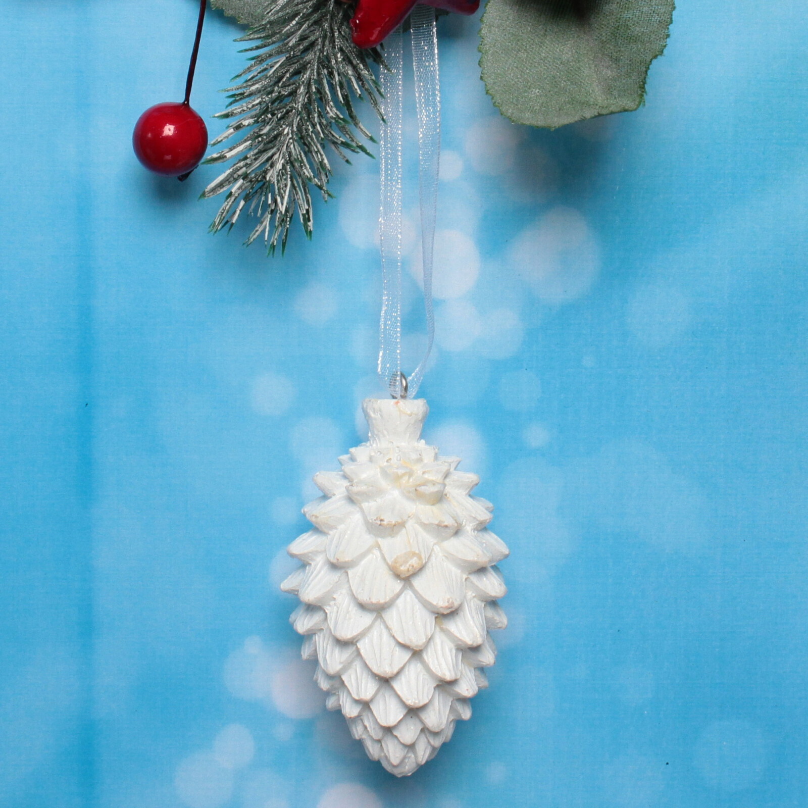 Подвесное украшение в форме шишки — это идеальный элемент для вашего новогоднего декора. Оно добавит уют и волшебство в ваш дом, создавая атмосферу праздника и радости. Белый цвет и текстурированная поверхность, имитирующая чешуйки шишки, делают это украшение универсальным для любого интерьера.