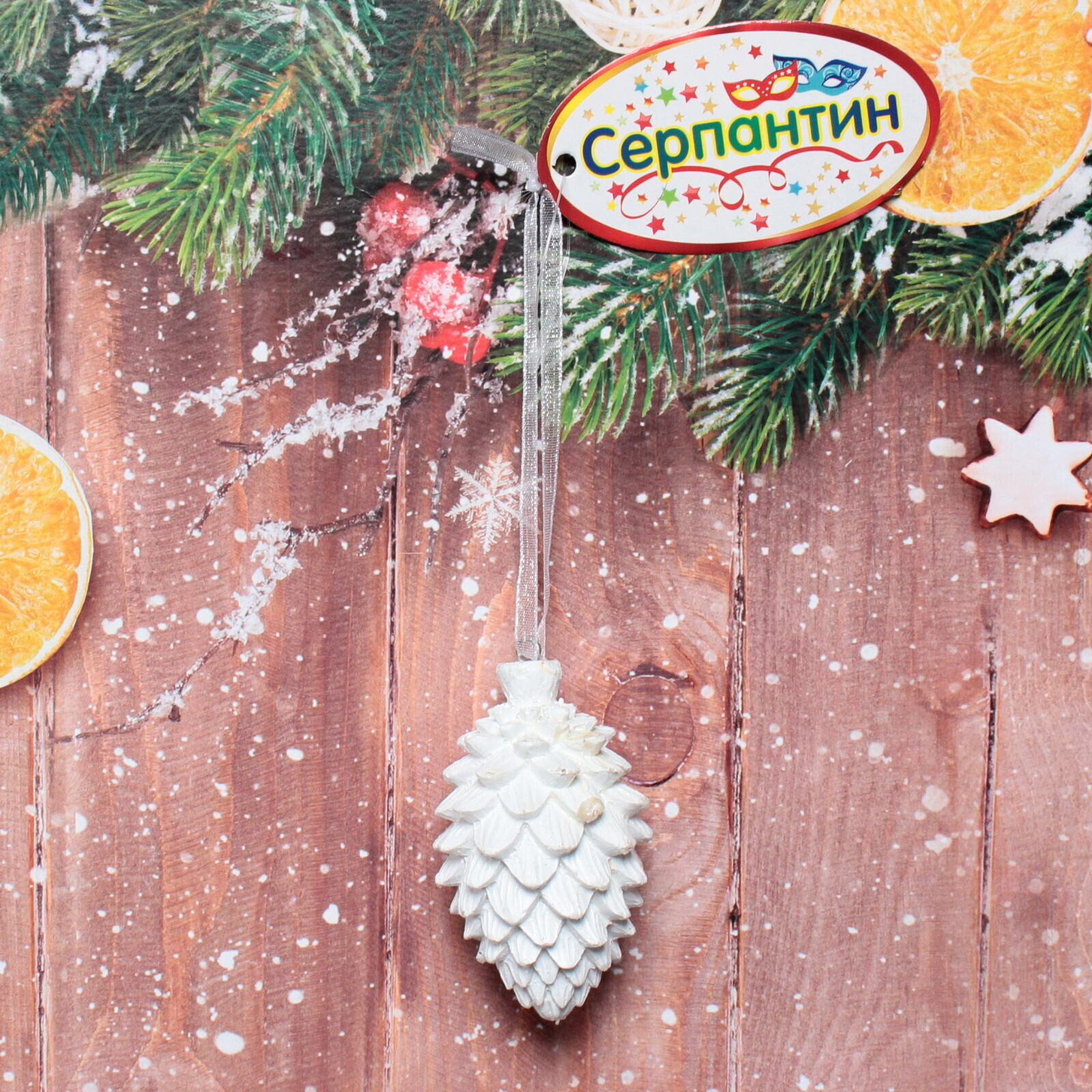 Это украшение подходит для использования как в доме, так и на улице. Вы можете повесить его на елку, использовать в качестве декора для окон или стен, а также добавить в композиции с другими новогодними элементами. Благодаря петельке из белой ленты, шишка легко подвешивается в любом месте.