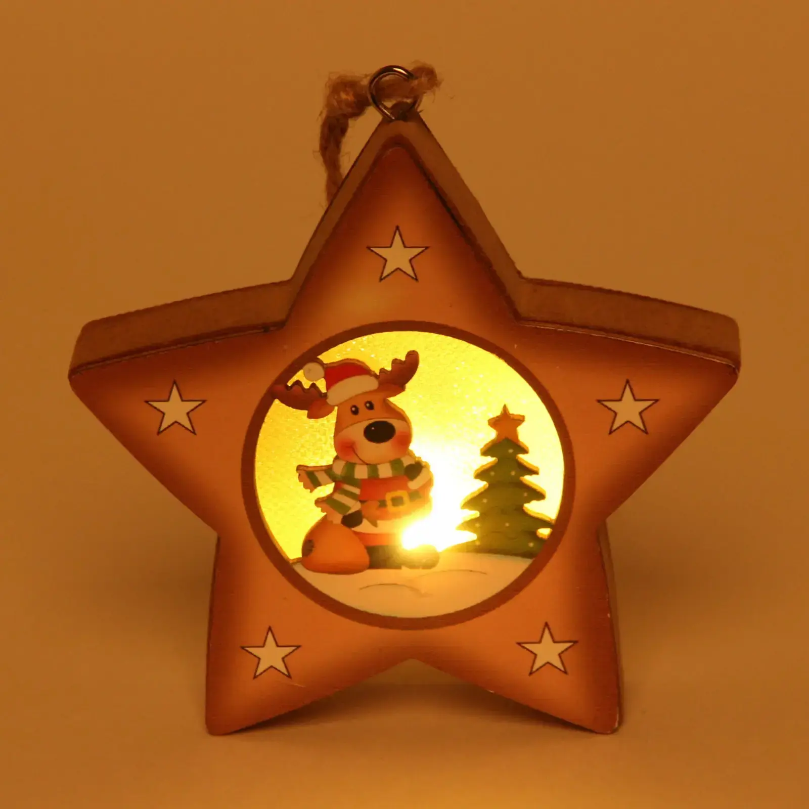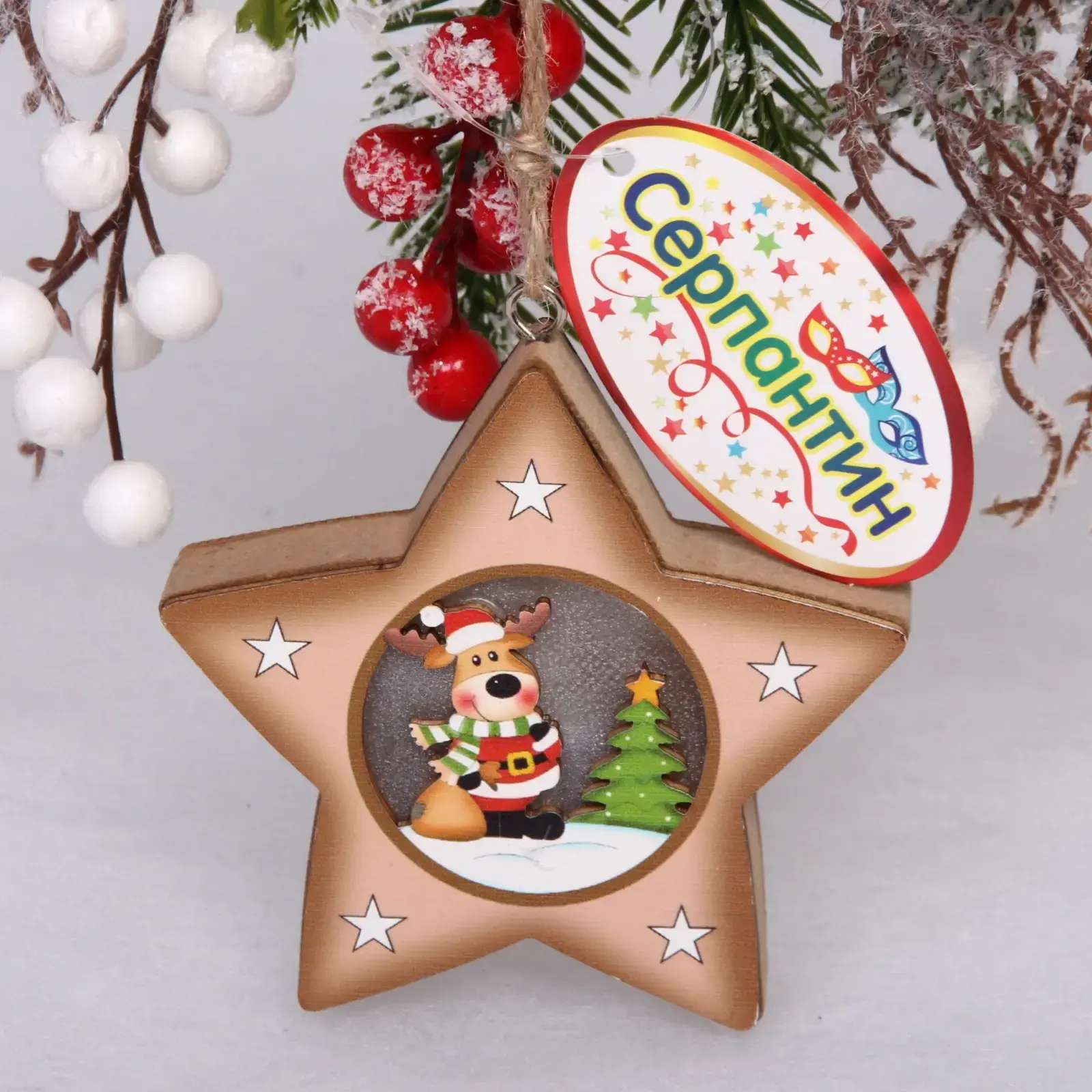 Подвесное украшение новогоднее "Оленёнок в звёздочке", 9,5 см, дерево, с подсветкой
