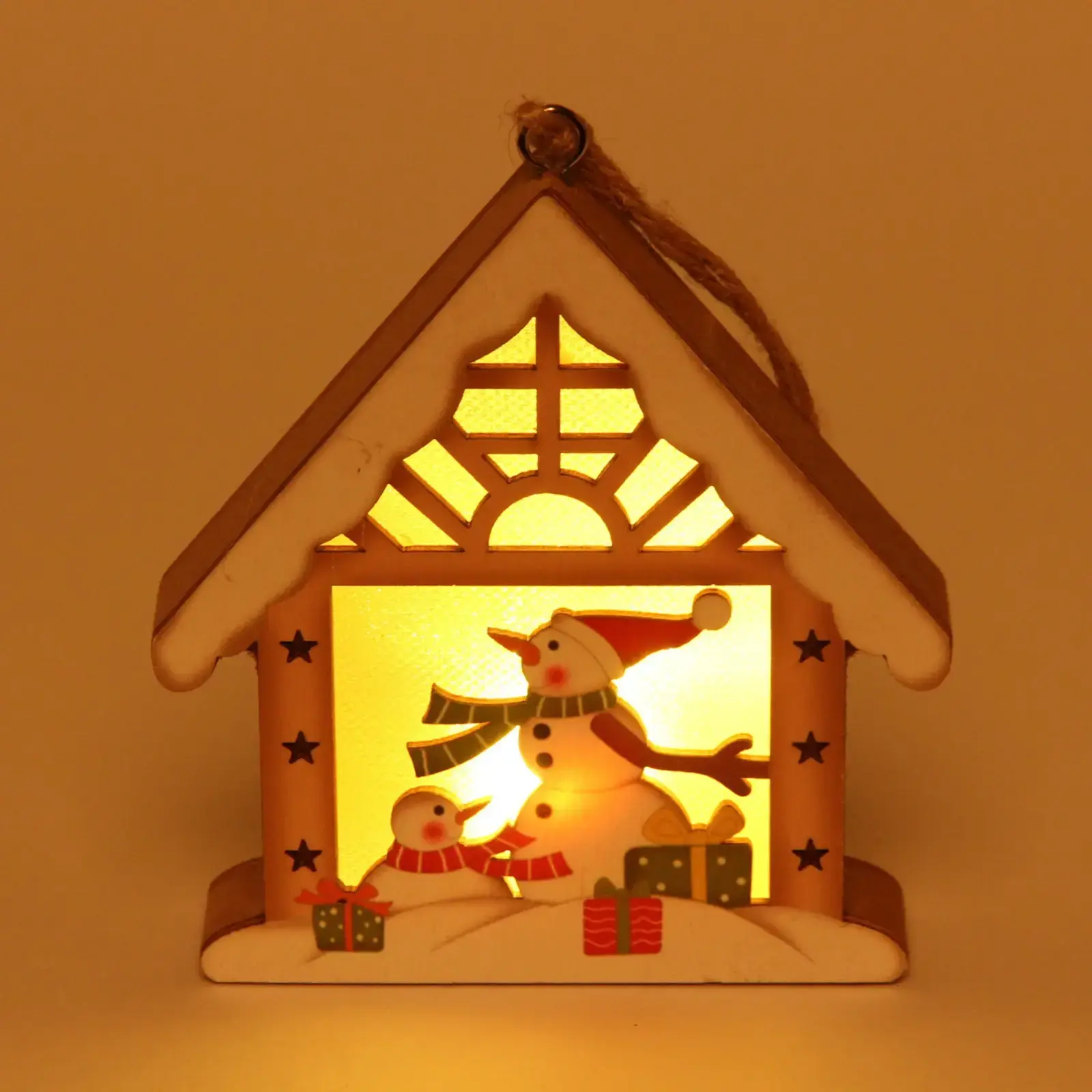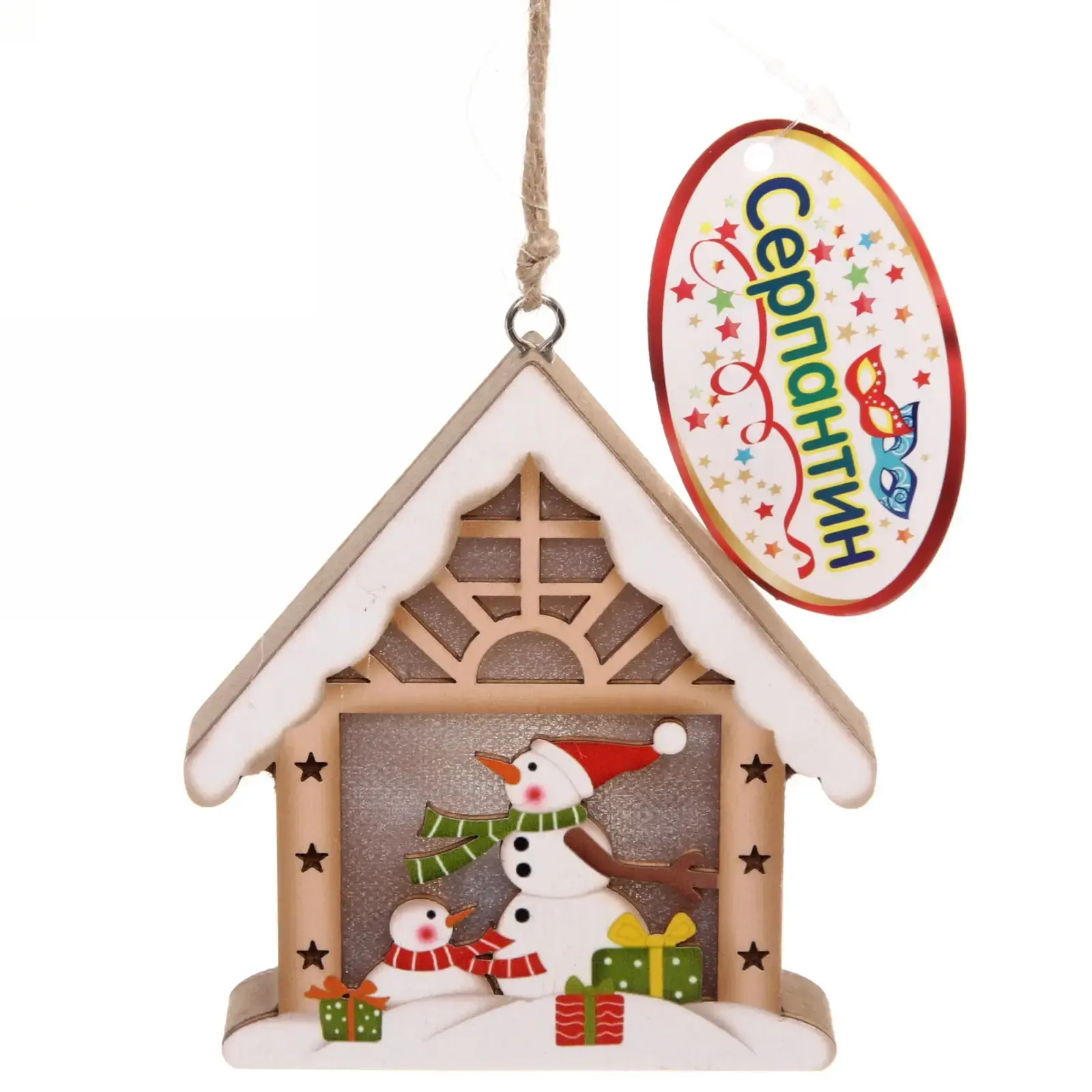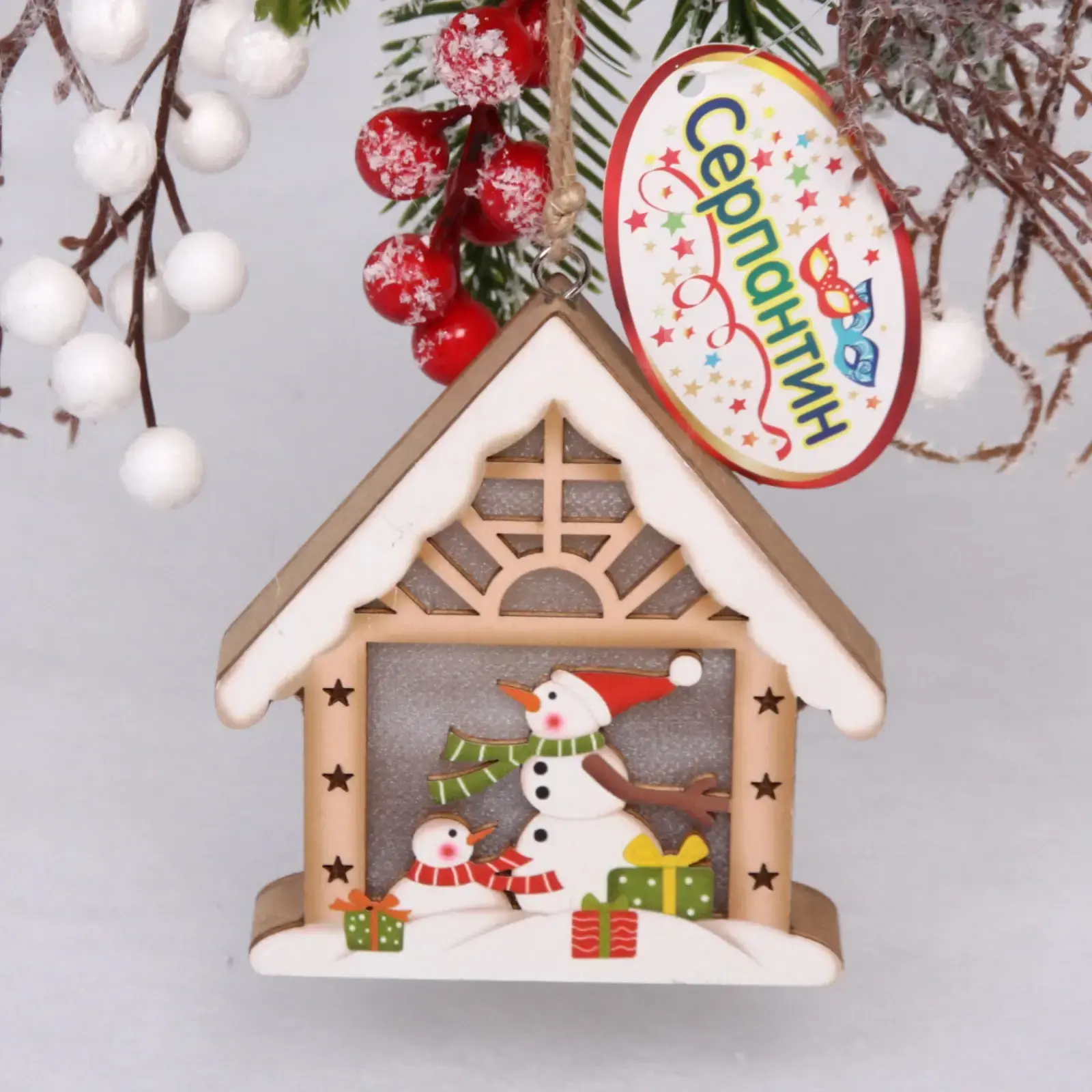 Декор новогодний подвесной "Снеговички в домике", 10см, дерево, с подсветкой