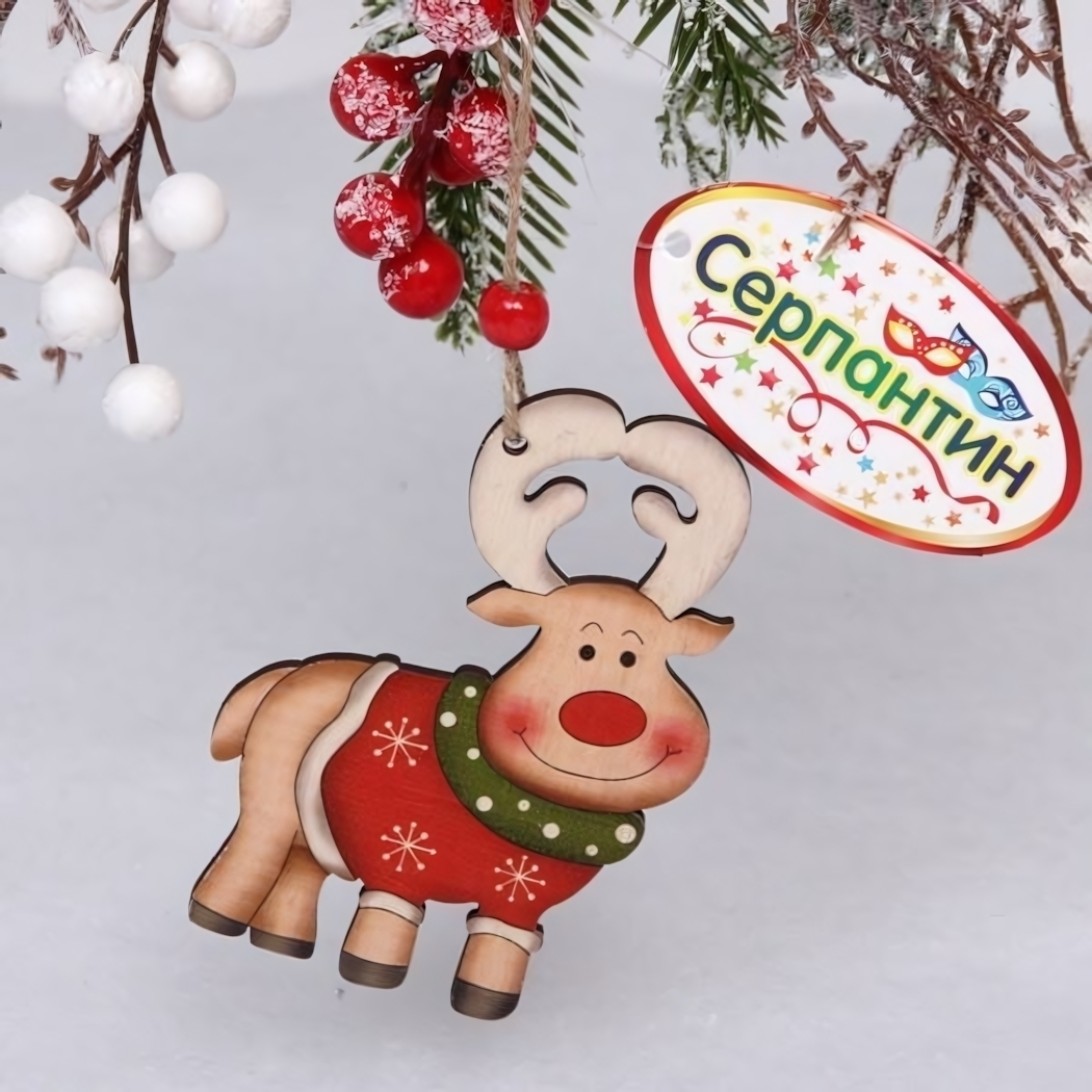Украшение новогоднее подвесное «счастливый оленёнок», 10 см, красный‑зелёный, деревянный, создаёт уютную атмосферу
