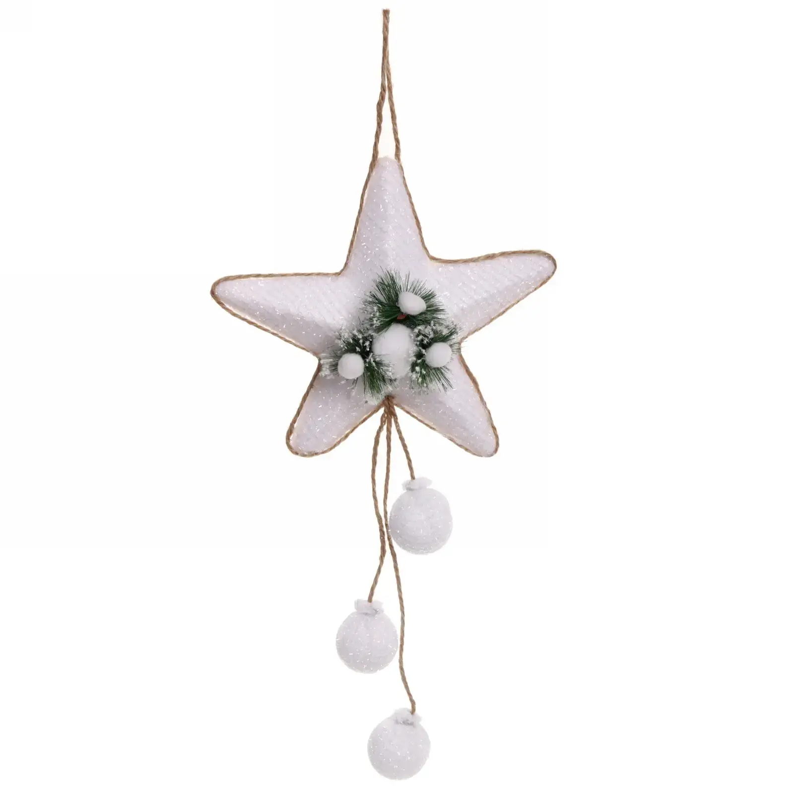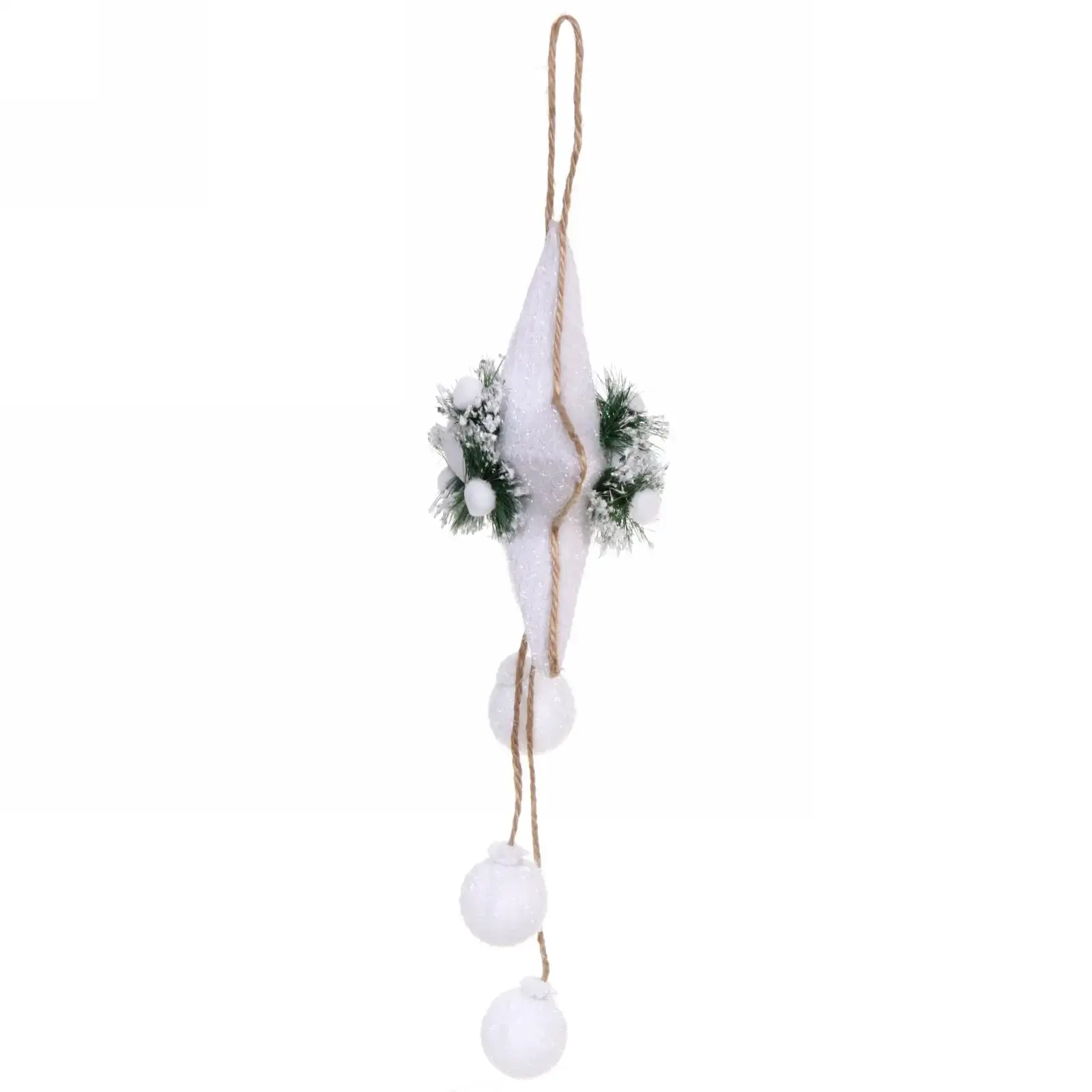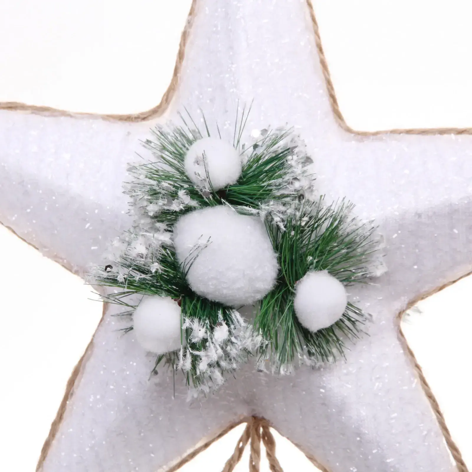 Это подвесное украшение станет ярким акцентом в вашем новогоднем декоре. Его изящная форма звезды и белоснежный цвет создают ощущение зимней сказки, а зеленые элементы, имитирующие хвойные иголки, добавляют натуральности и свежести. Подвеска идеально подходит для украшения елки, дверей или стен, придавая вашему интерьеру праздничный вид.