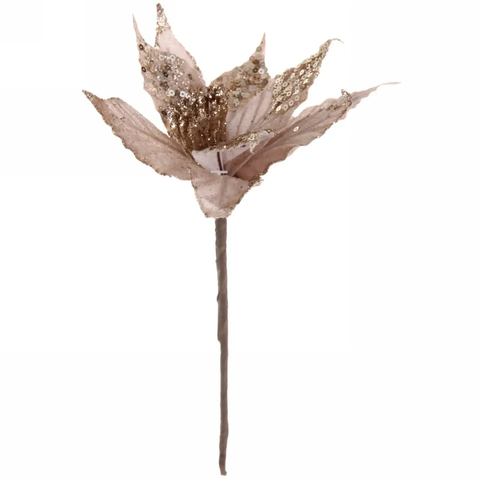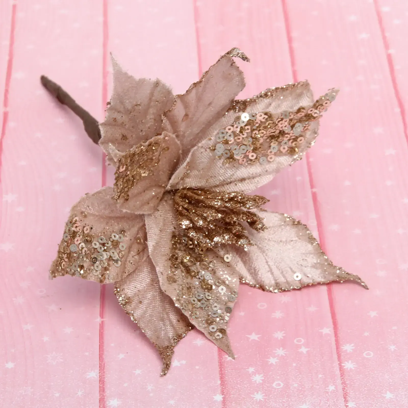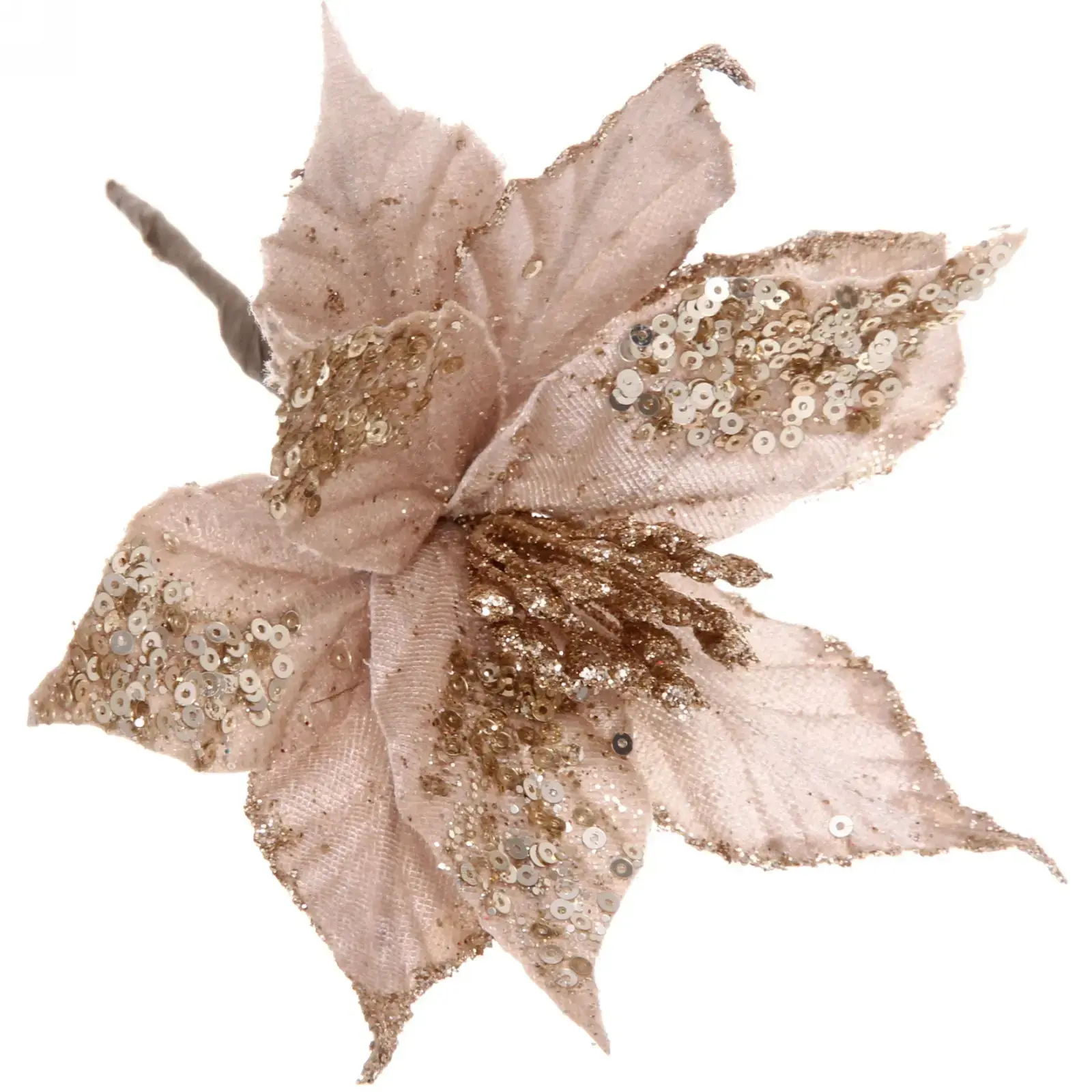Новогоднее украшение «Пуансеттия-Блеск» станет идеальным дополнением к вашему праздничному декору. Это искусственное украшение выполнено в нежных шампань-оттенках и украшено блестками, что придаёт ему особый шарм и элегантность. С его помощью вы сможете легко создать уютную и праздничную атмосферу в вашем доме или на мероприятии.