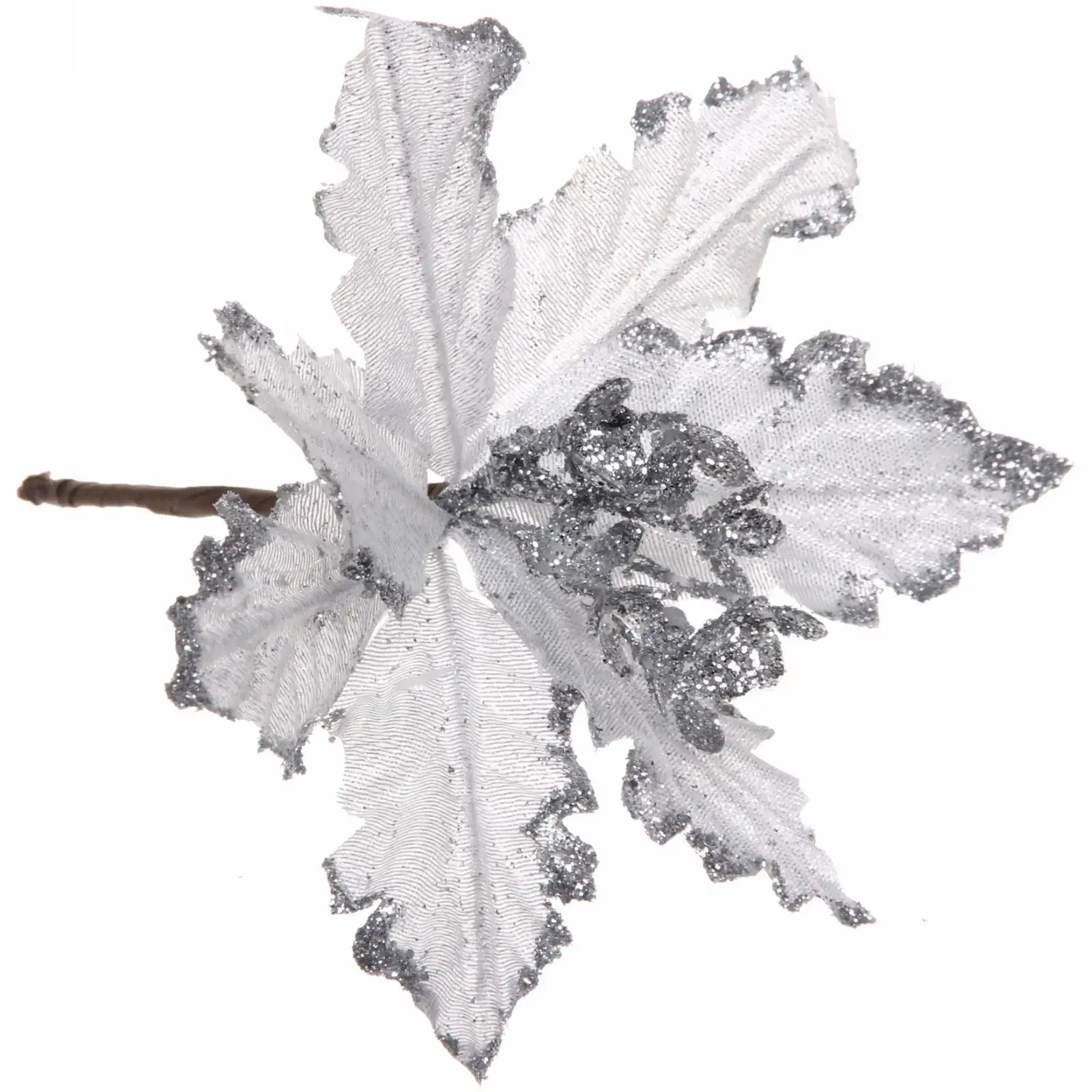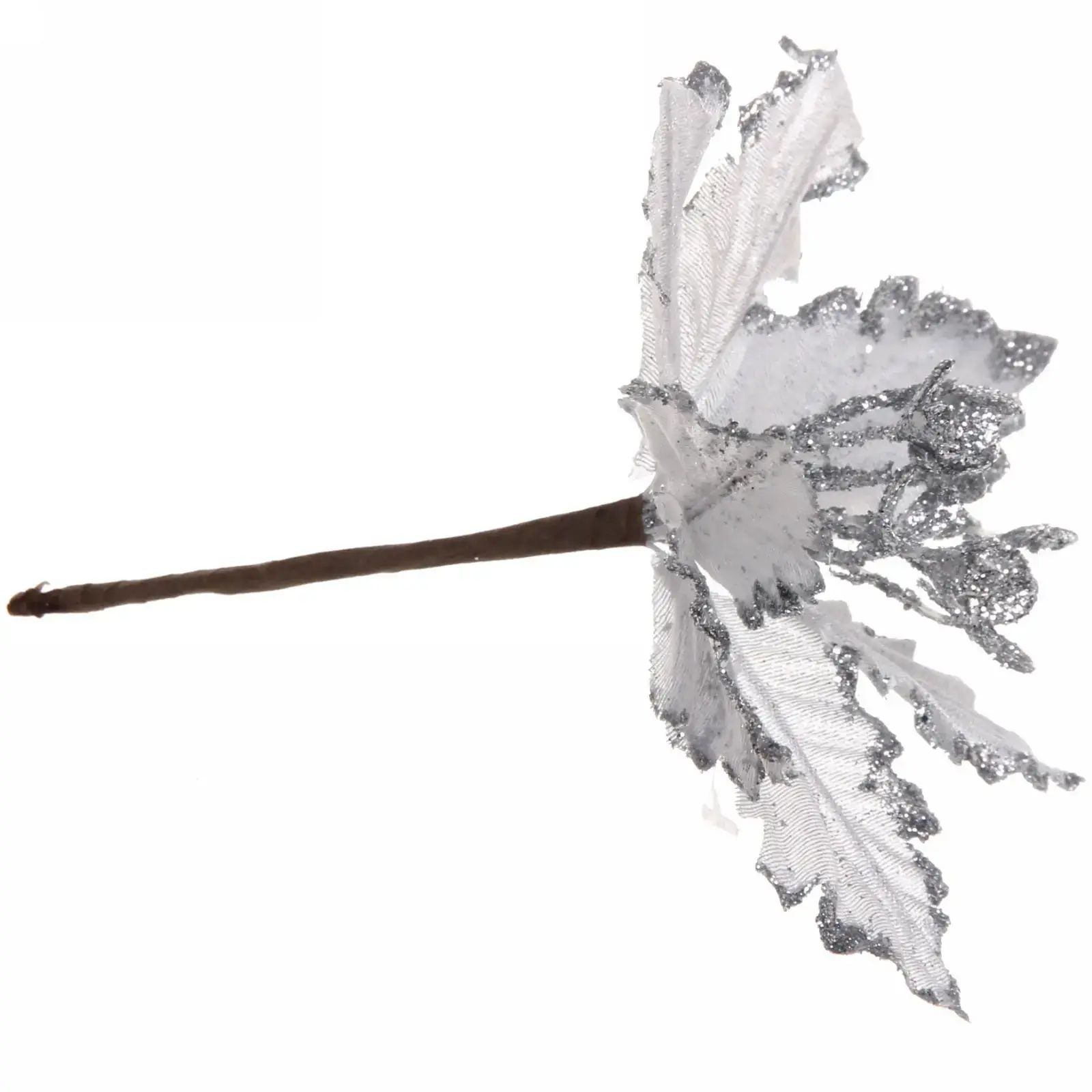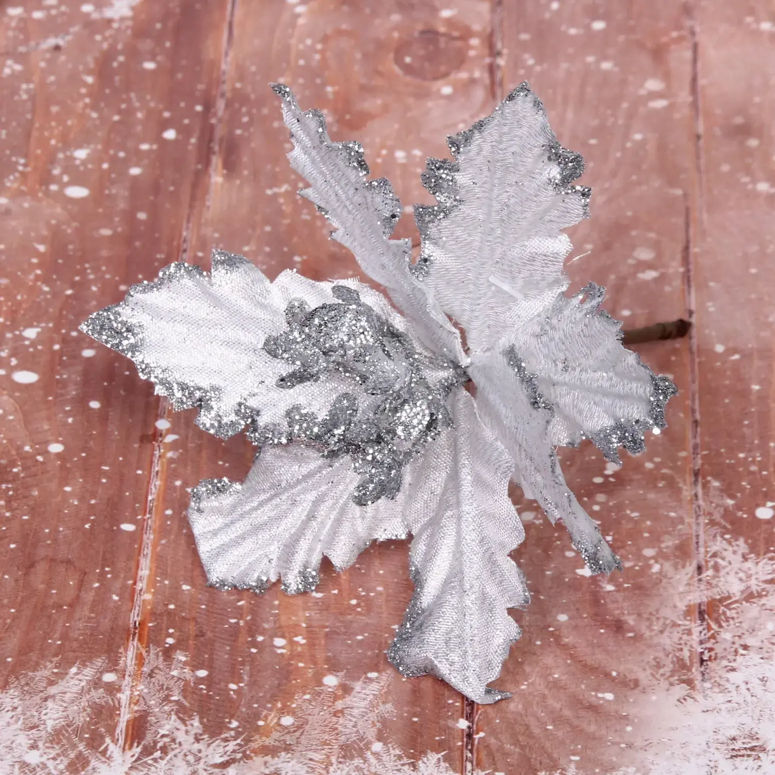 Каждый элемент изготовлен из многослойного текстиля с серебристым напылением. Гибкий стебель позволяет придавать нужный изгиб, а мелкие блёстки создают эффект инея на лепестках. Совместимо с искусственным снегом и светодиодными гирляндами.