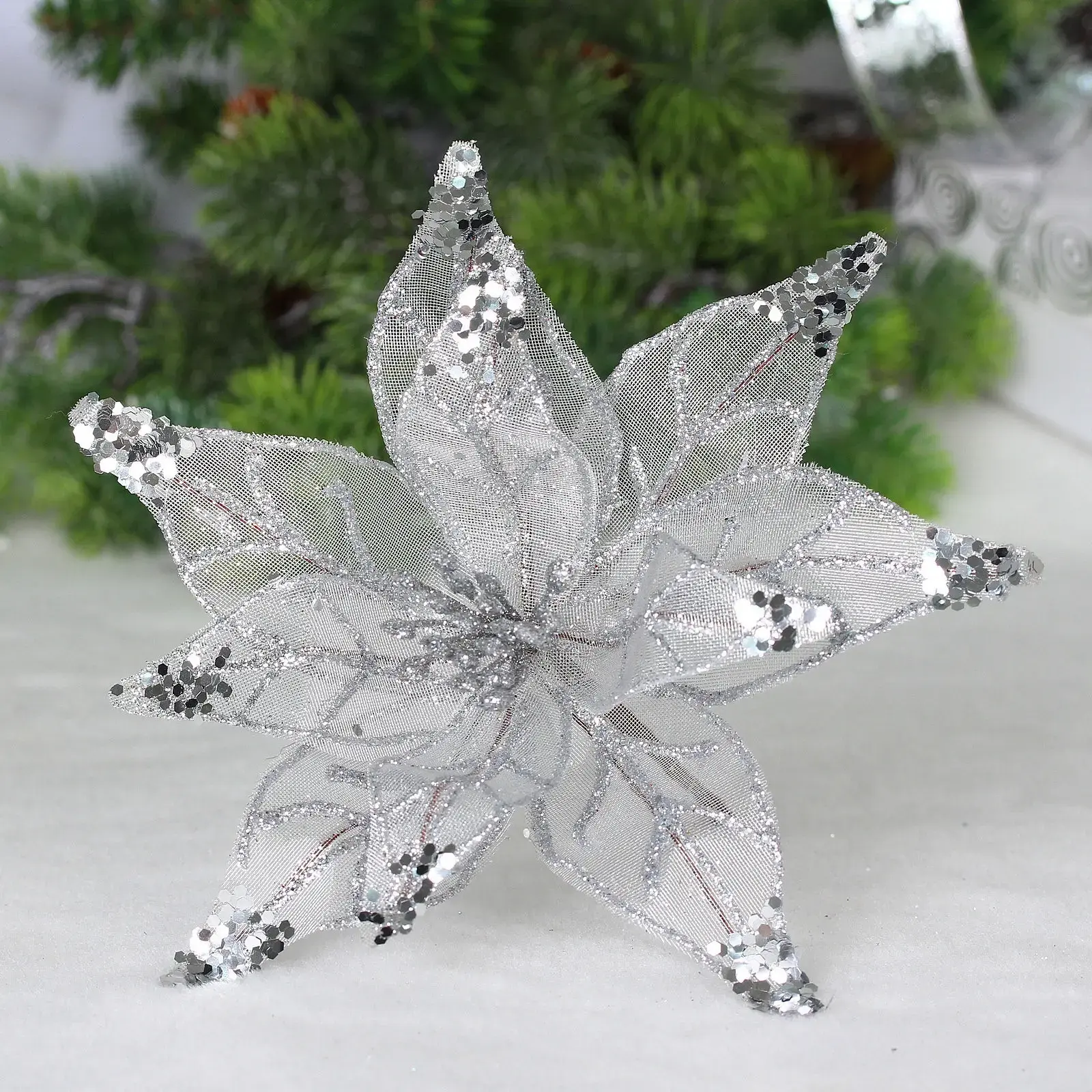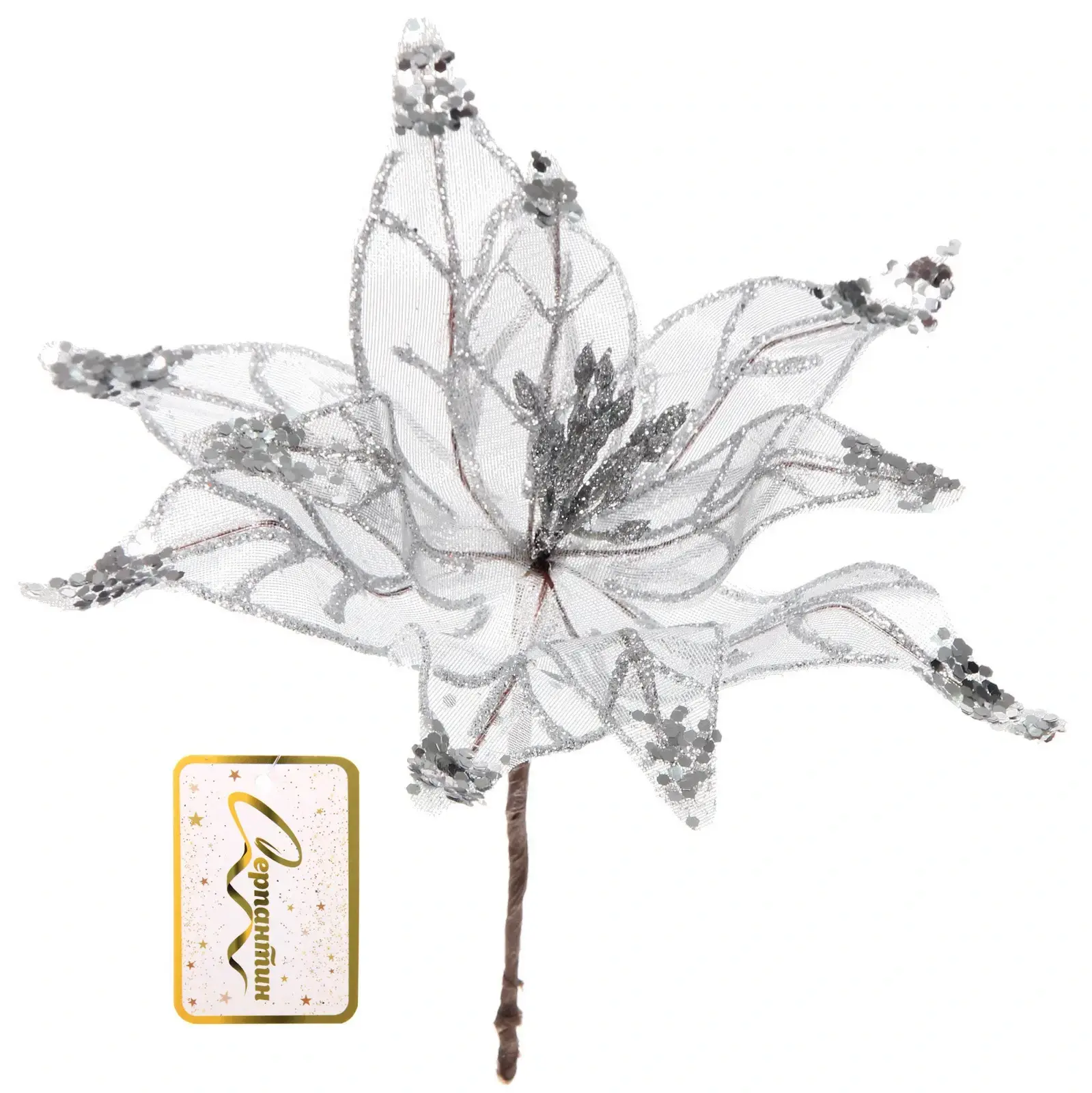 Диаметр цветка составляет 20 см — оптимальный размер для точечного декора. Серебристо-серый оттенок гармонично сочетается с классическими новогодними цветами. Для очистки достаточно протереть поверхность сухой салфеткой. Храните украшение в оригинальной упаковке с фирменным логотипом для защиты от пыли.
