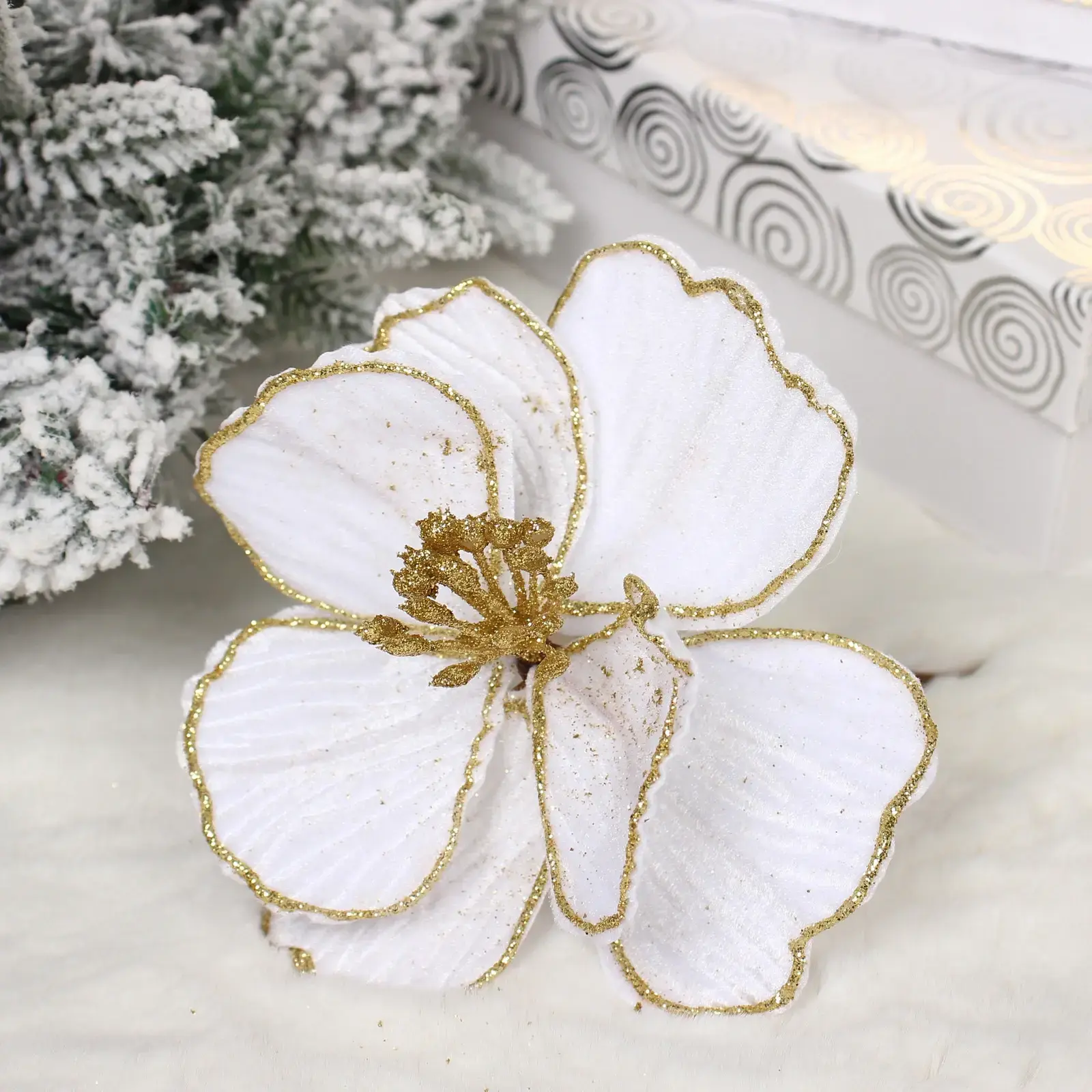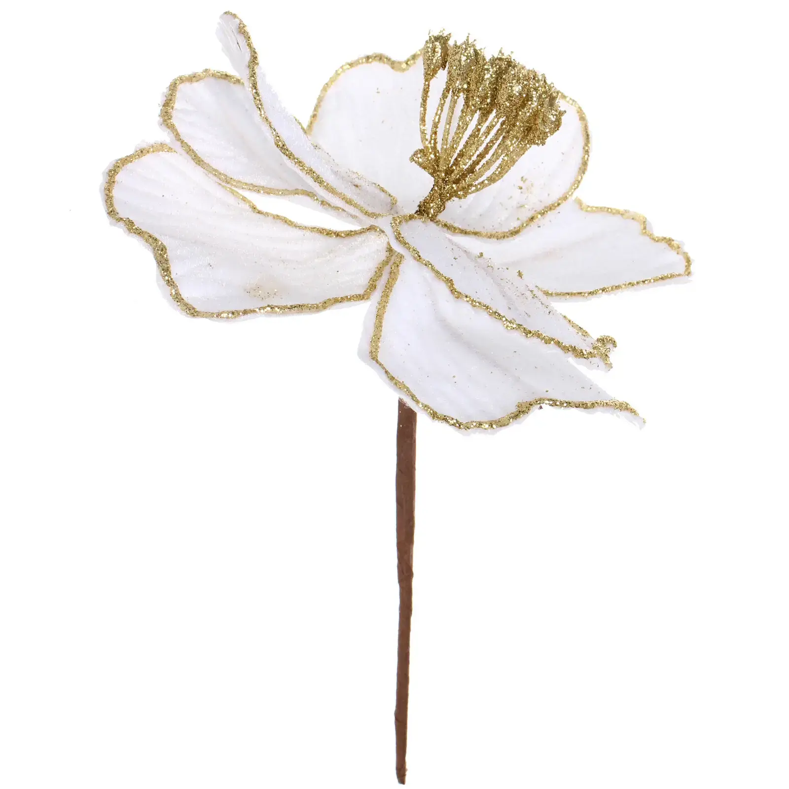 Цветок закреплен на коричневой стебле-держателе для удобной установки. Сочетание белоснежных лепестков с золотистыми деталями создает эффект морозного сияния, а тычинки с позолотой добавляют реалистичности. Материалы безопасны для использования в жилых помещениях и не требуют специального ухода.