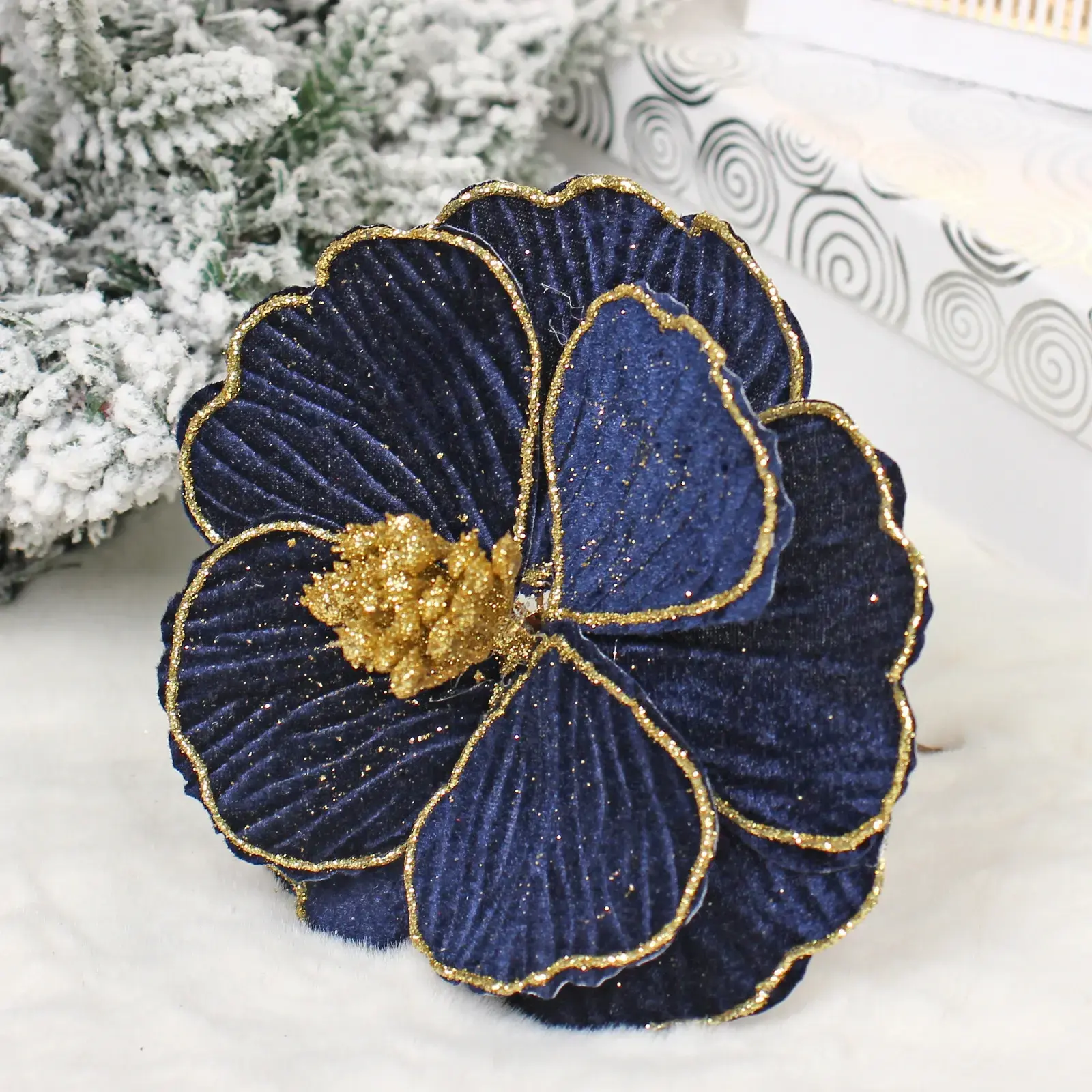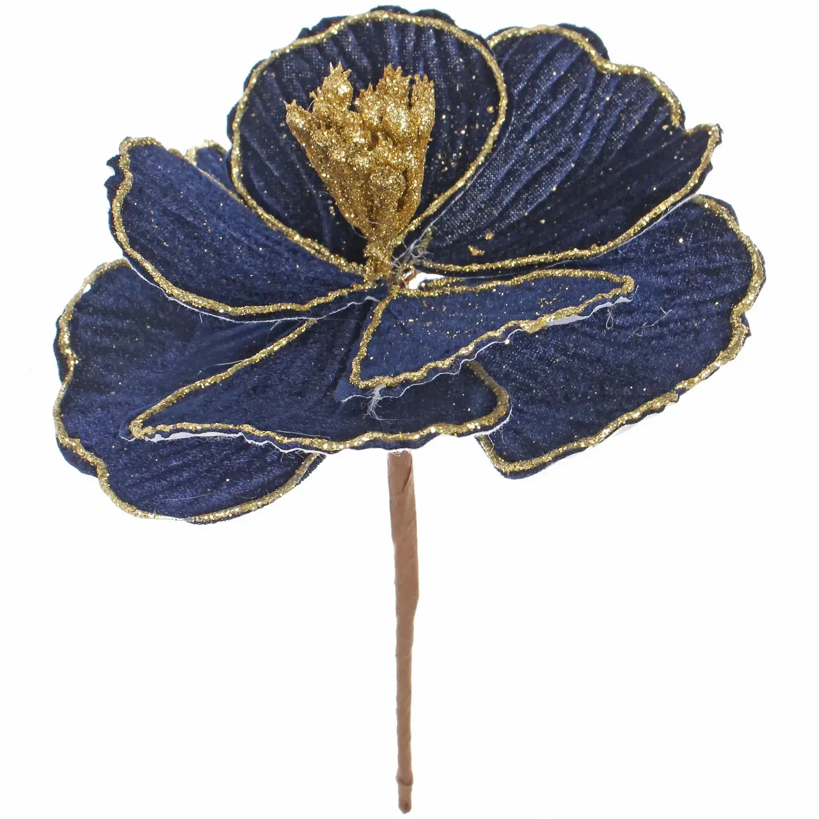 Искусственный цветок пуансеттия в глубоких сине-золотых тонах станет центральным элементом вашего новогоднего интерьера. Сочетание благородного сапфирового оттенка с позолоченными деталями придаст помещению торжественный вид и настроение зимней сказки.