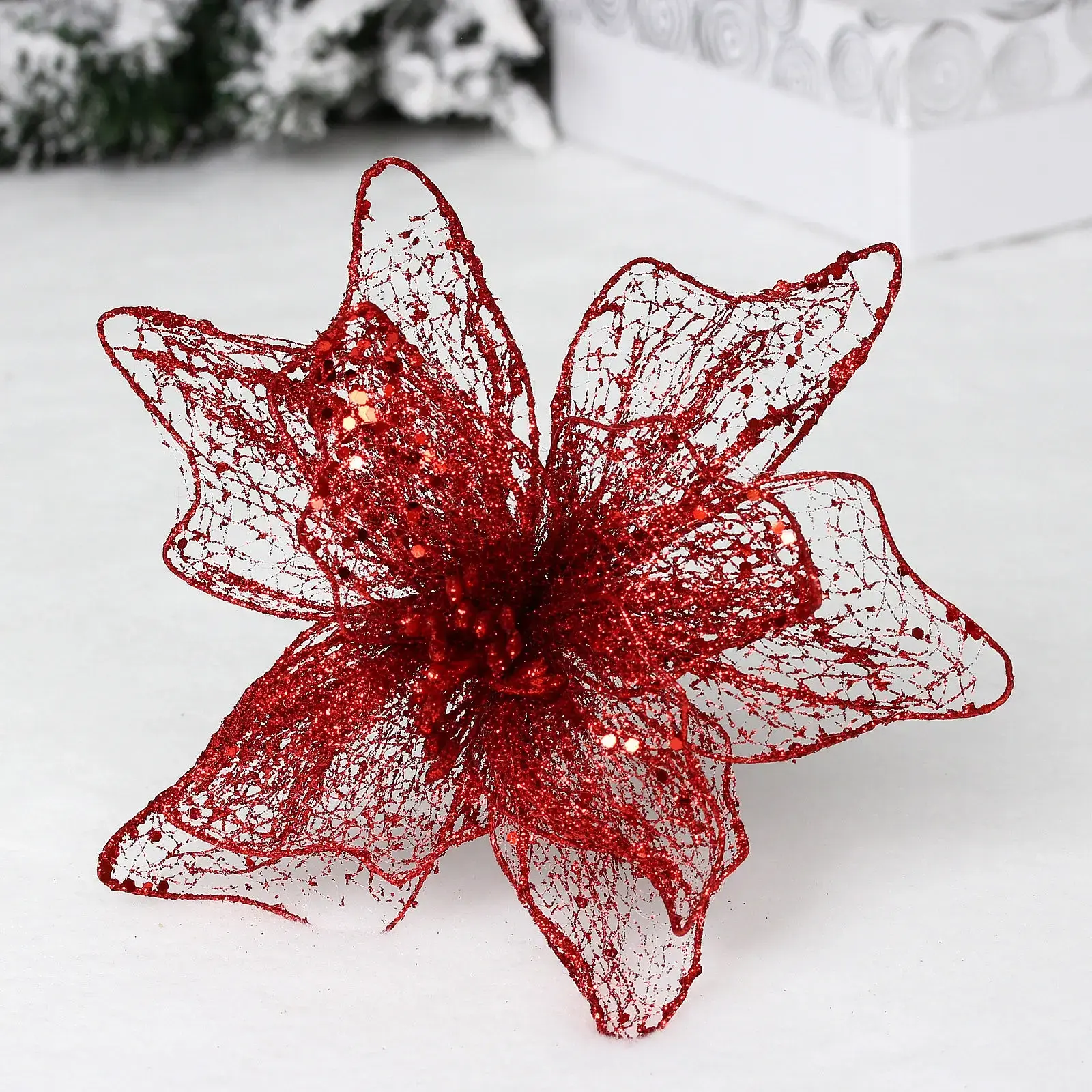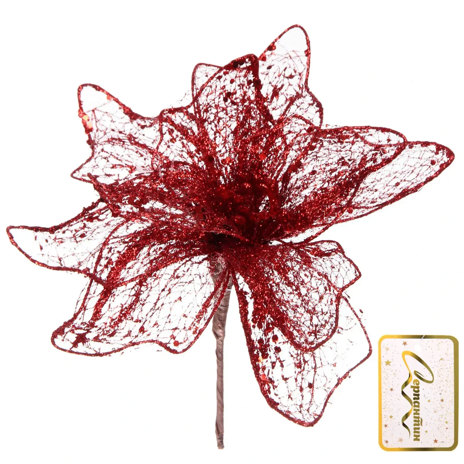 Яркий декоративный цветок "Пуансеттия - Лунная ночь" станет изысканным акцентом в вашем праздничном интерьере. Его благородный красный цвет с мерцающими блестками создает атмосферу зимней сказки.