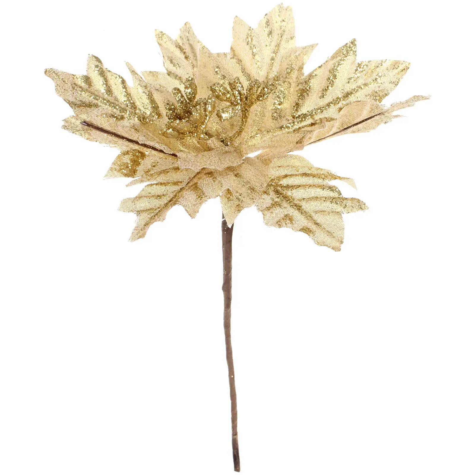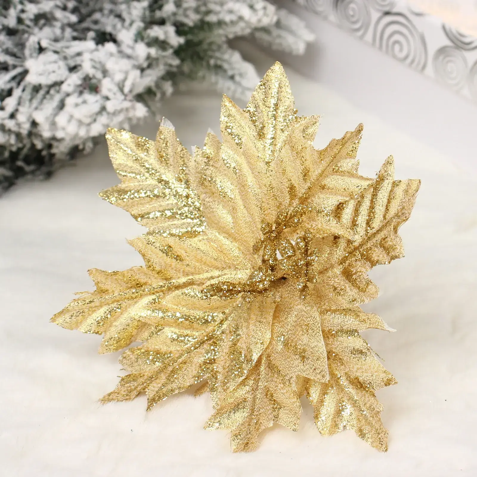 Новогоднее украшение «Пуансеттия - Мерцание» — это идеальный способ добавить в ваш интерьер атмосферу праздника и уюта. С его помощью вы сможете создать уникальный декор, который будет радовать глаз и поднимать настроение в зимние вечера. Золотистый цвет и блестящая текстура делают это украшение настоящим акцентом в любом интерьере.