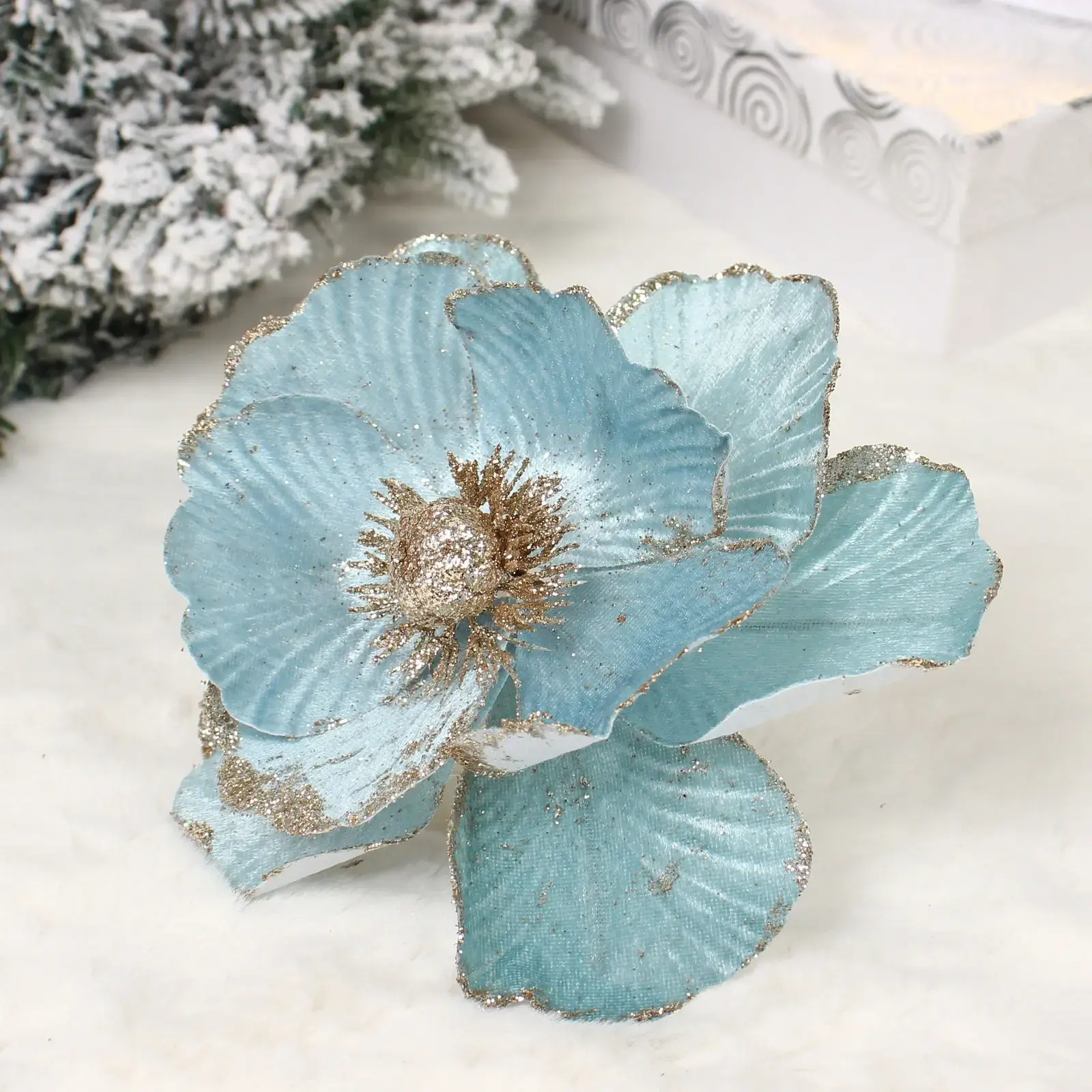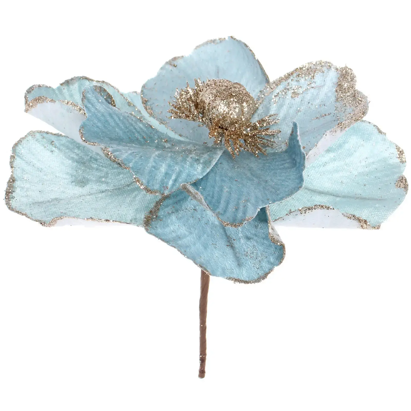 Новогоднее украшение «Пуансеттия» в нежно-голубых тонах с золотистыми акцентами станет изысканным дополнением вашего праздничного интерьера. Идеальный баланс деликатности и выразительности позволяет создать уютную зимнюю сказку в любом помещении.