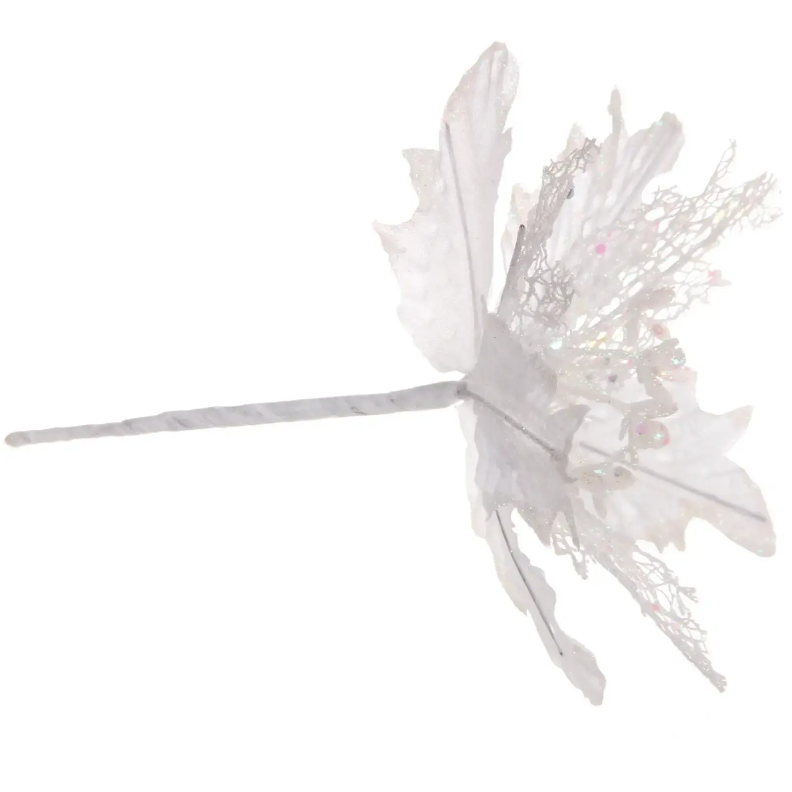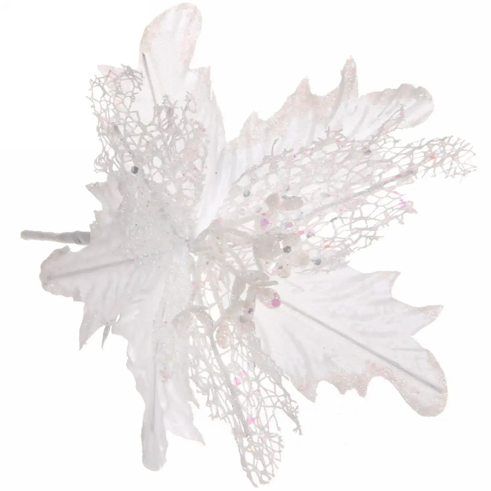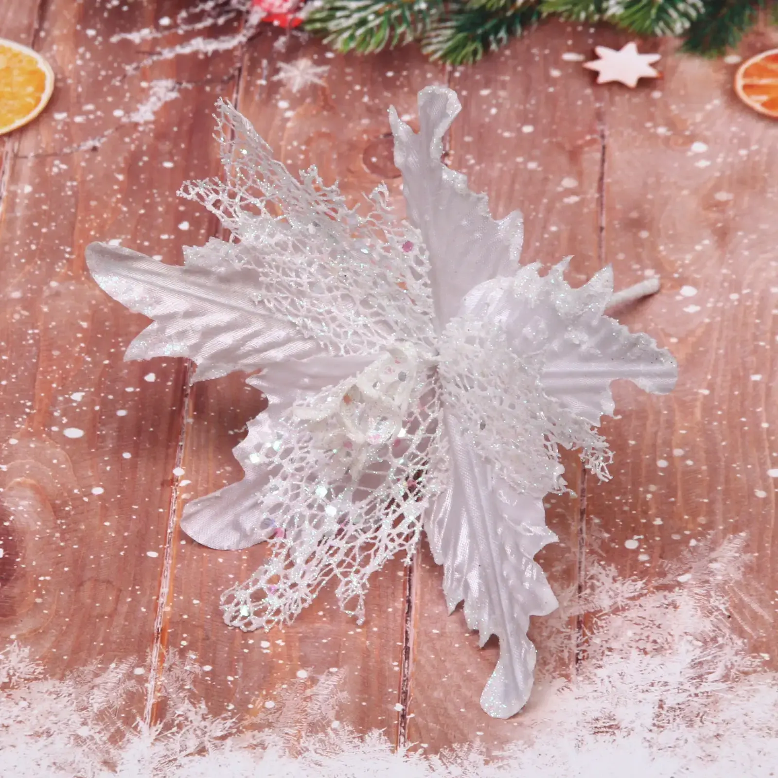Новогоднее украшение «Пуансеттия-Нежность» — это идеальный способ добавить волшебства в ваш интерьер. С его помощью вы сможете создать уютную и праздничную атмосферу, которая порадует вас и ваших близких. Белый цвет с нежными переливами серебристого и блестящий эффект делают это украшение универсальным для любого стиля оформления.