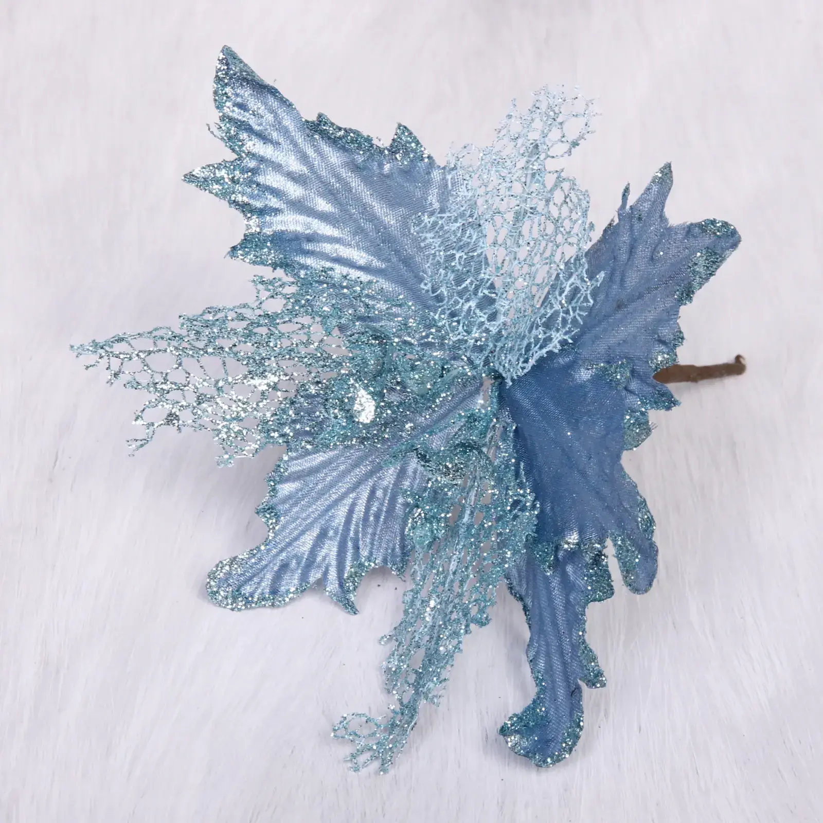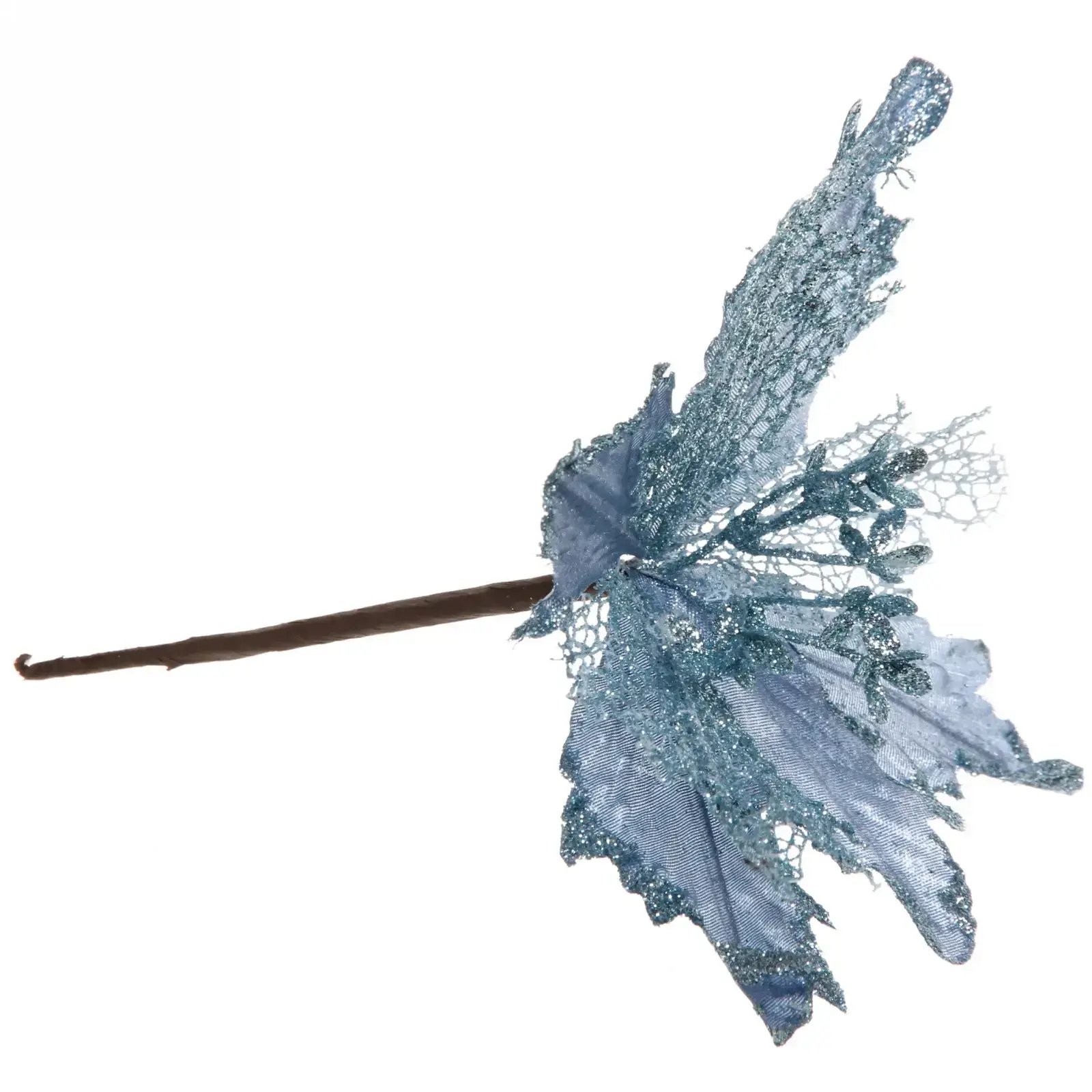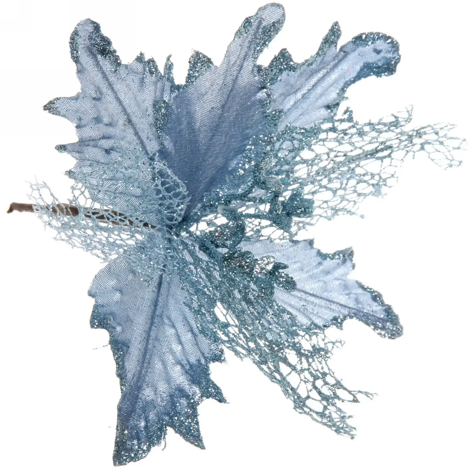 Декоративный элемент 'Пуансеттия-Нежность' станет изысканным дополнением вашего новогоднего интерьера. Его нежно-голубой цвет и блестящие детали добавят волшебства в оформление дома.