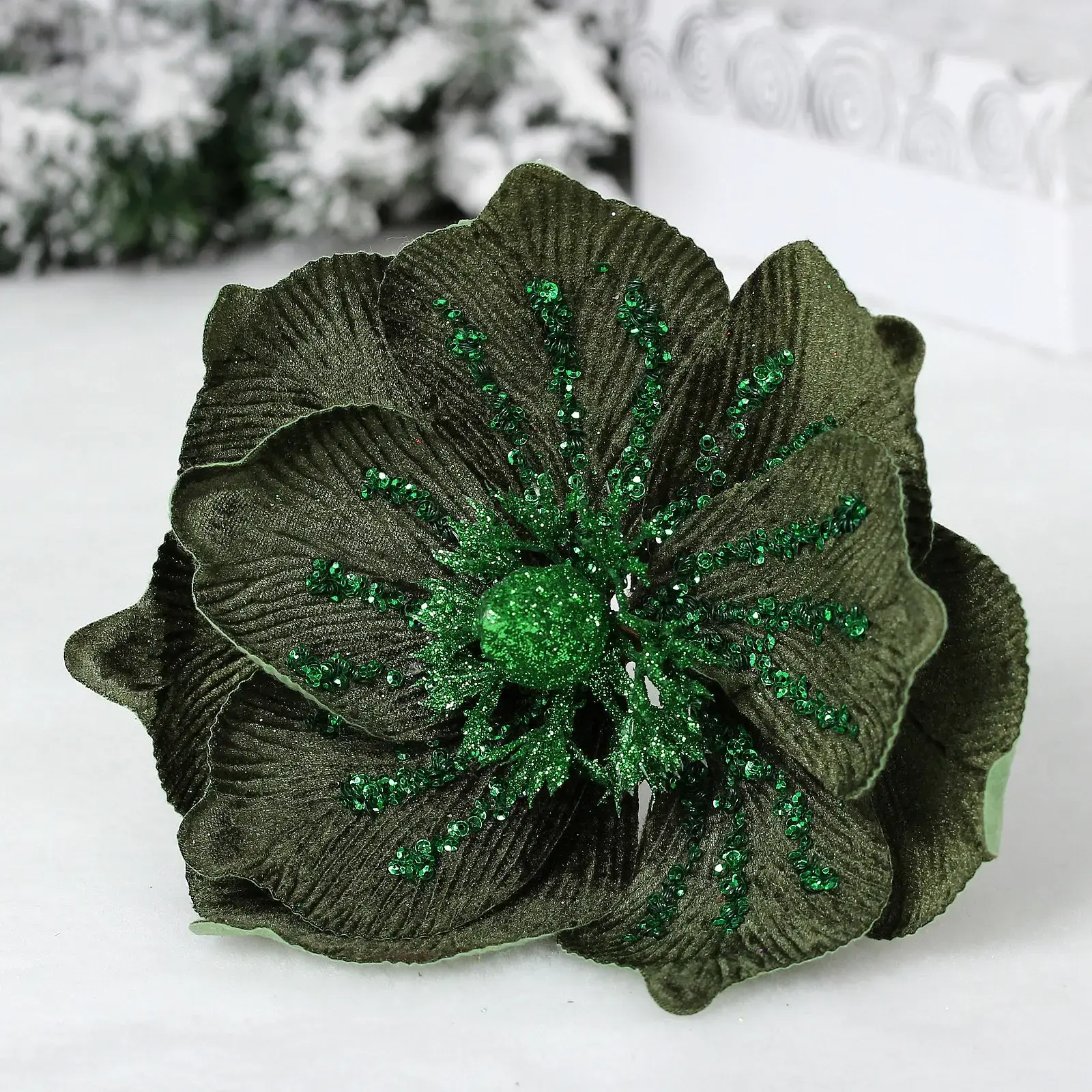 Декоративный цветок 'Пуансеттия - Ночное сияние' станет ярким акцентом в вашем новогоднем декоре. Благодаря сочетанию темно-зеленых лепестков с блестящими элементами, он создает эффект мерцающего сияния.