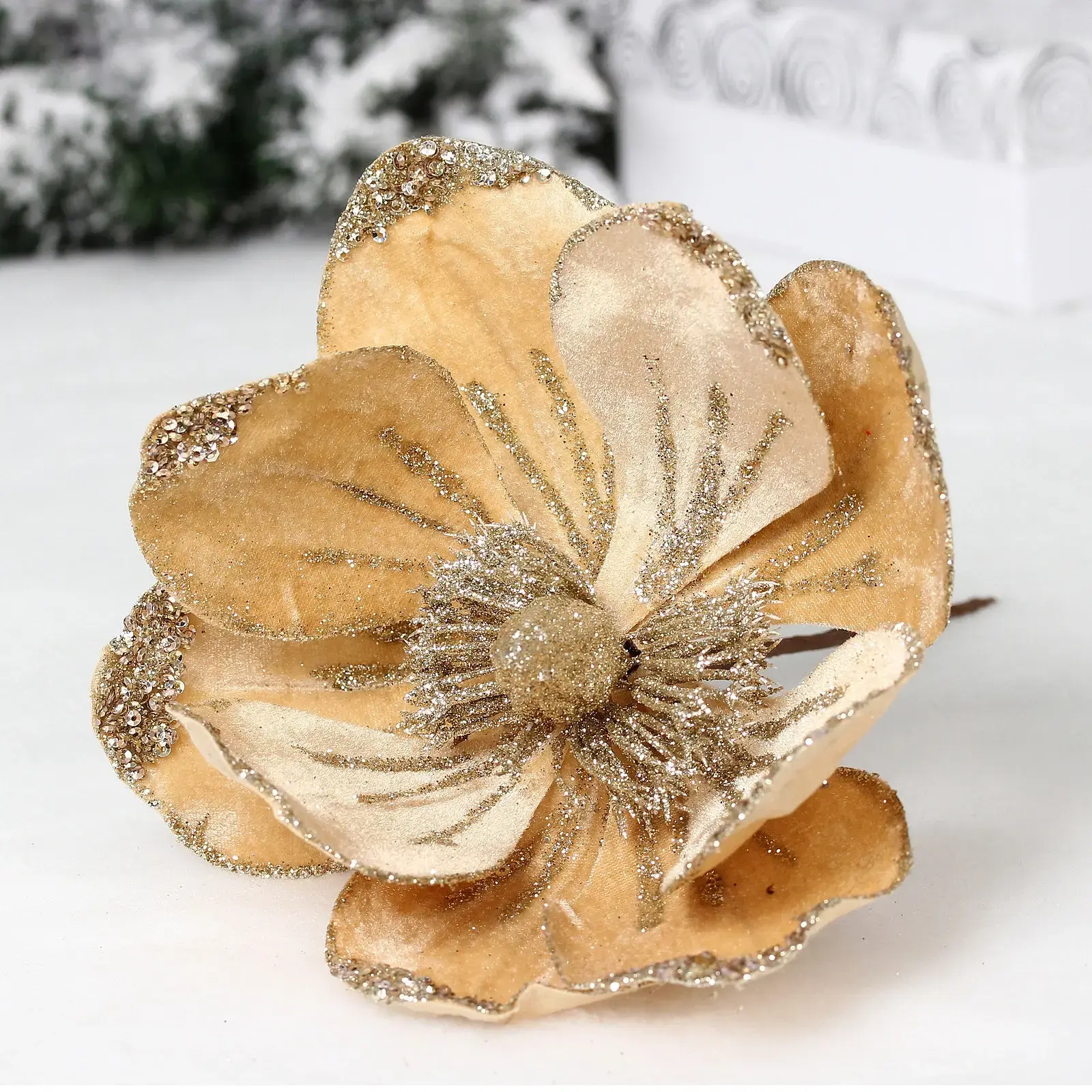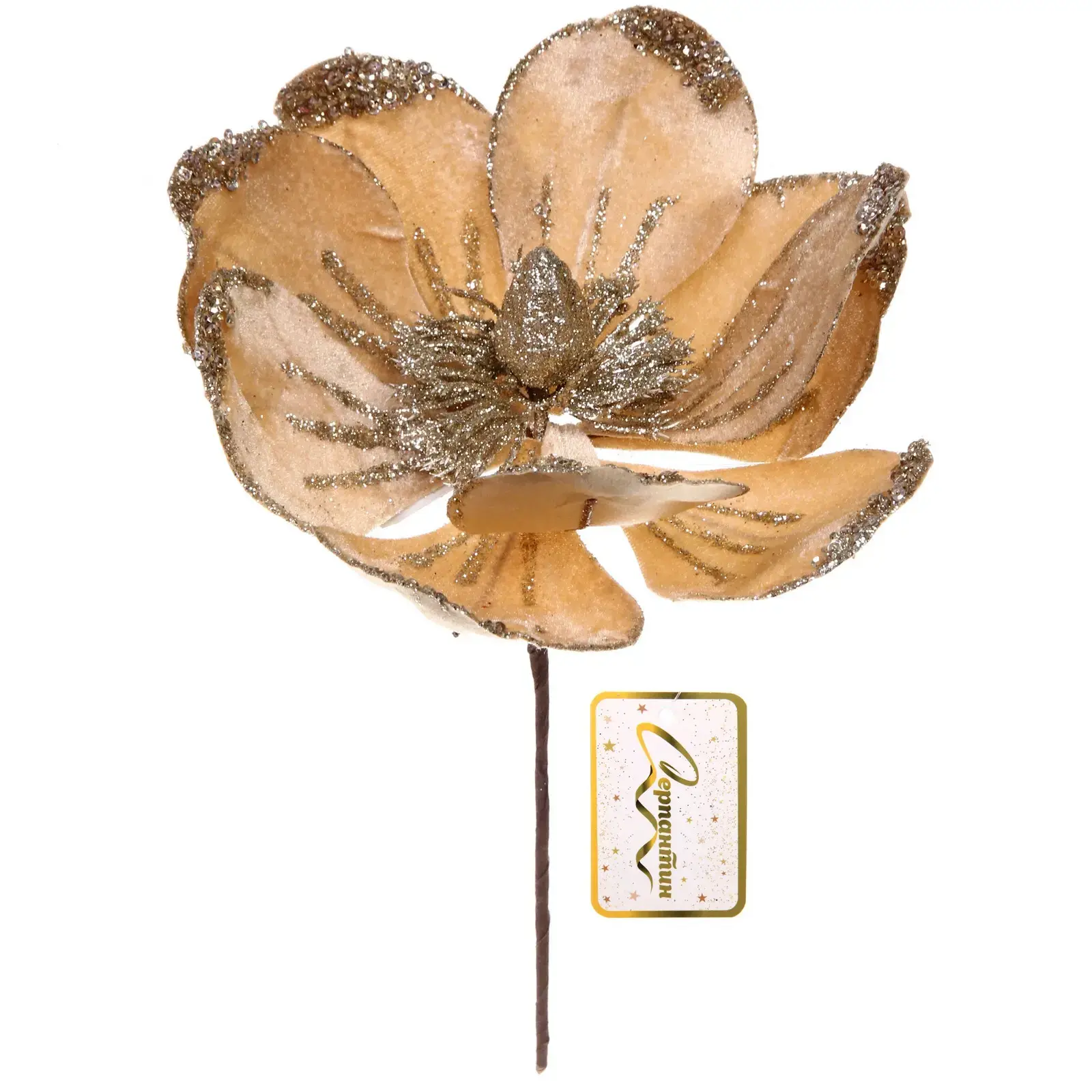 Искусственная пуансеттия в нежном оттенке шампань с мерцающими блестками станет изысканным акцентом вашего интерьера. Объемные лепестки с текстурными полосками и сияющим центром создают эффект роскошного зимнего цветка, который дополнит новогодний декор.