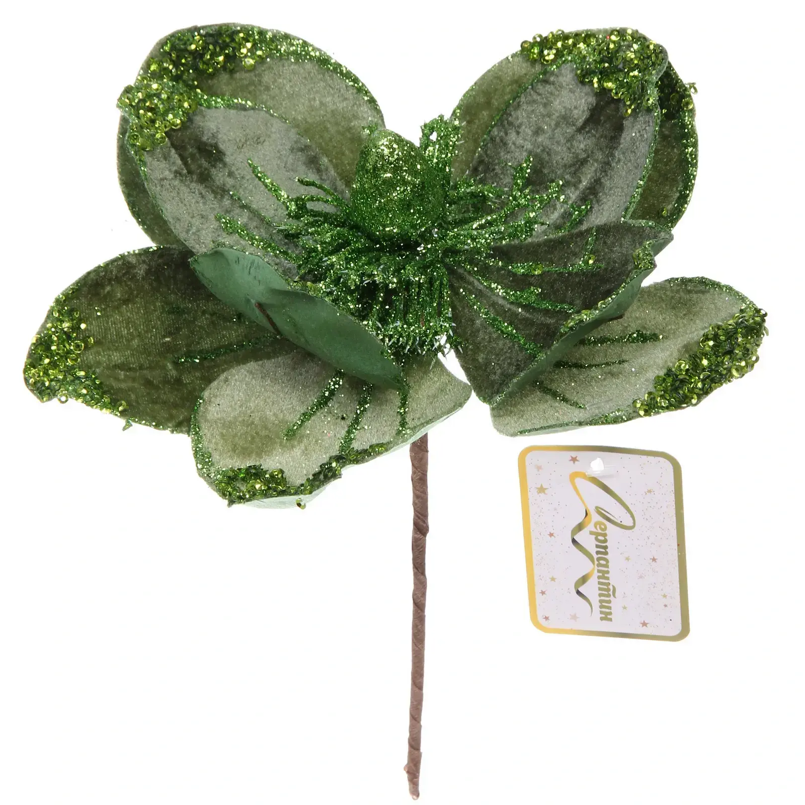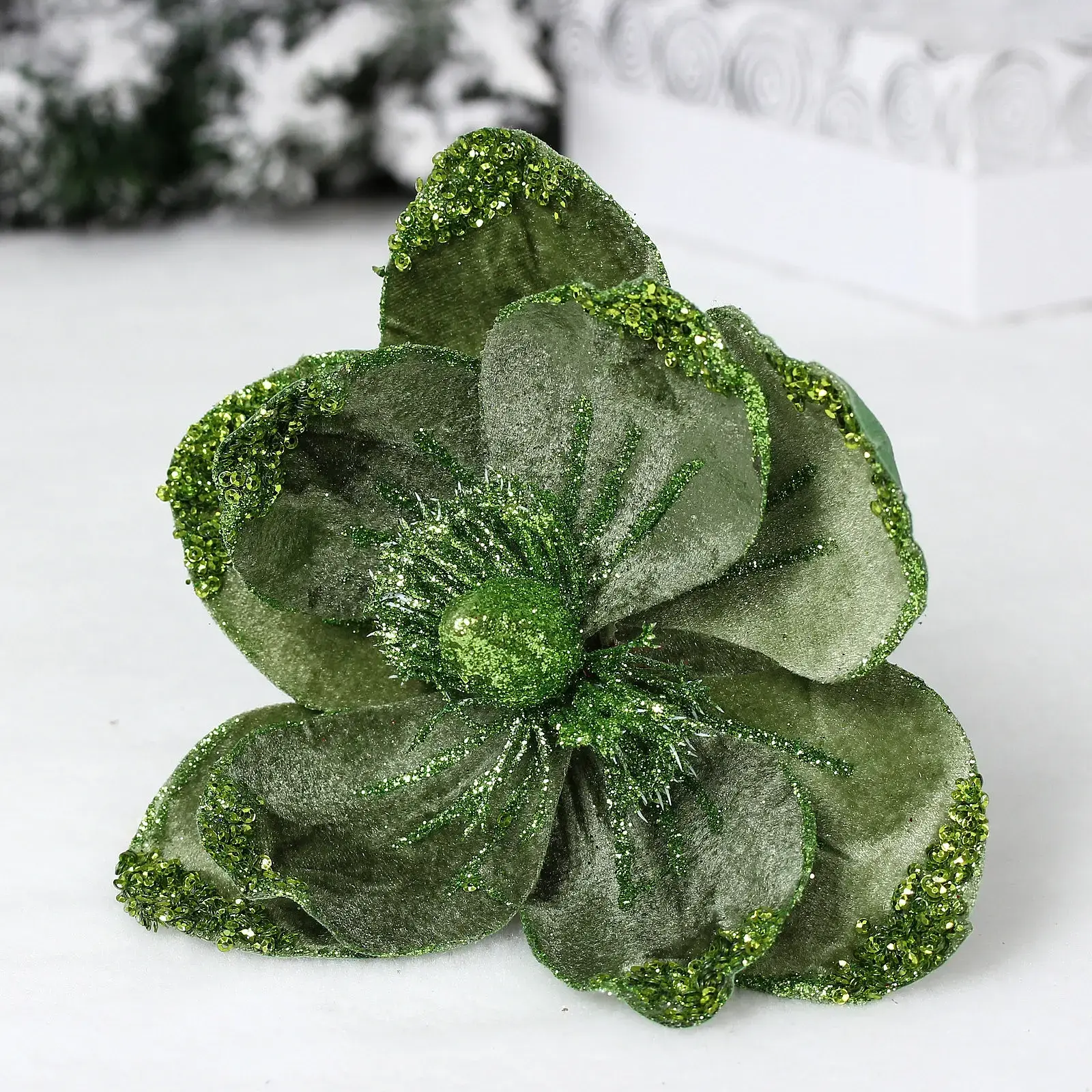 Декоративный цветок поставляется в травяном цветовом решении, которое символизирует жизненную силу и гармонично сочетается с традиционными новогодними оттенками. Мерцающие элементы создают праздничные блики при освещении, делая украшение центральным акцентом вашего интерьера.