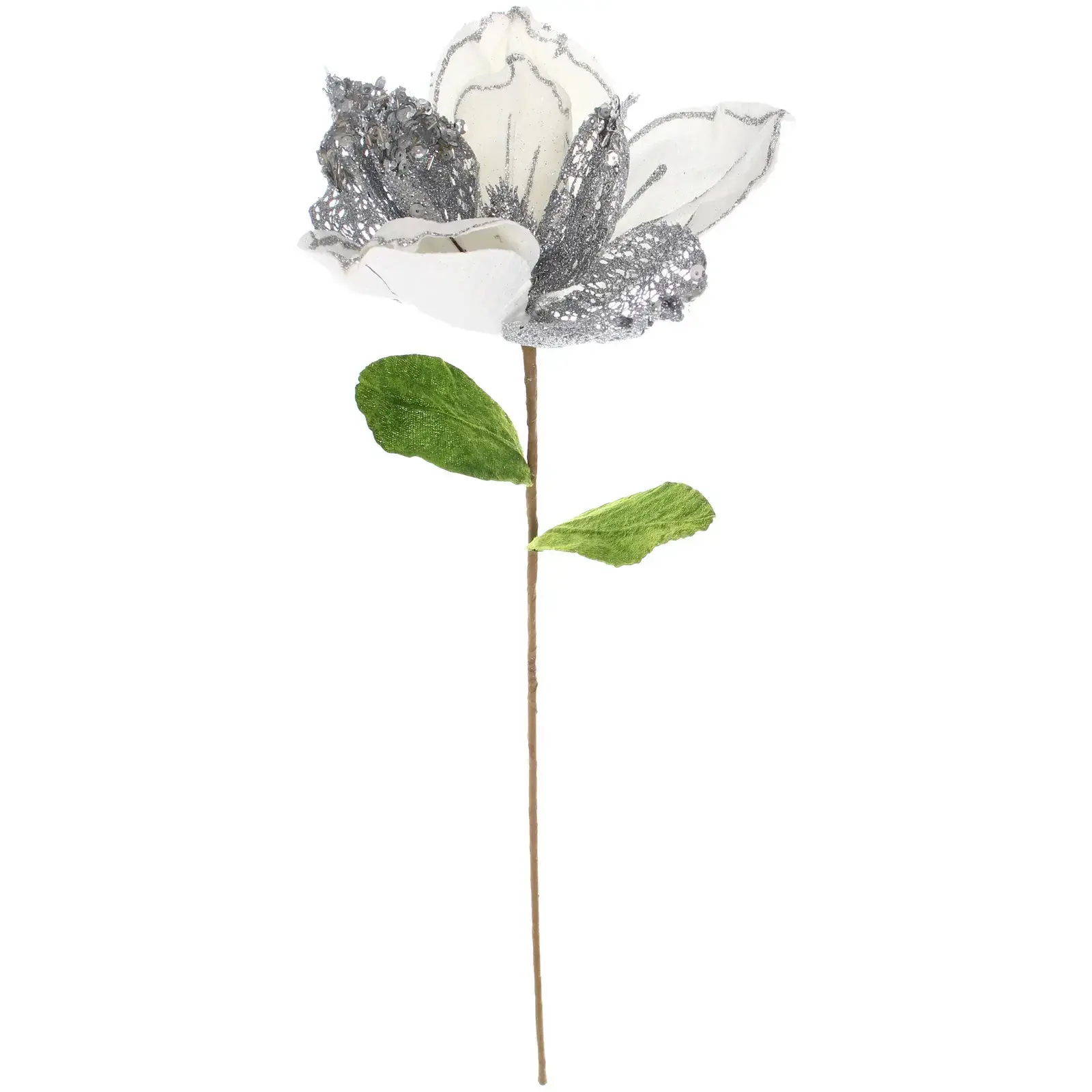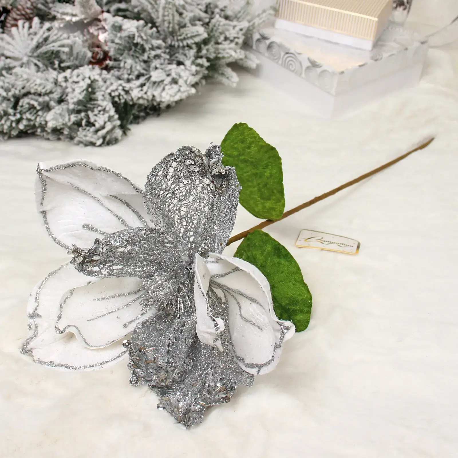 Декоративные элементы с блёстками и сетчатой текстурой лепестков создают эффект свежего зимнего инея. Зелёные листья с текстурной поверхностью добавляют натуралистичности, сохраняя праздничный шарм даже после окончания сезона.