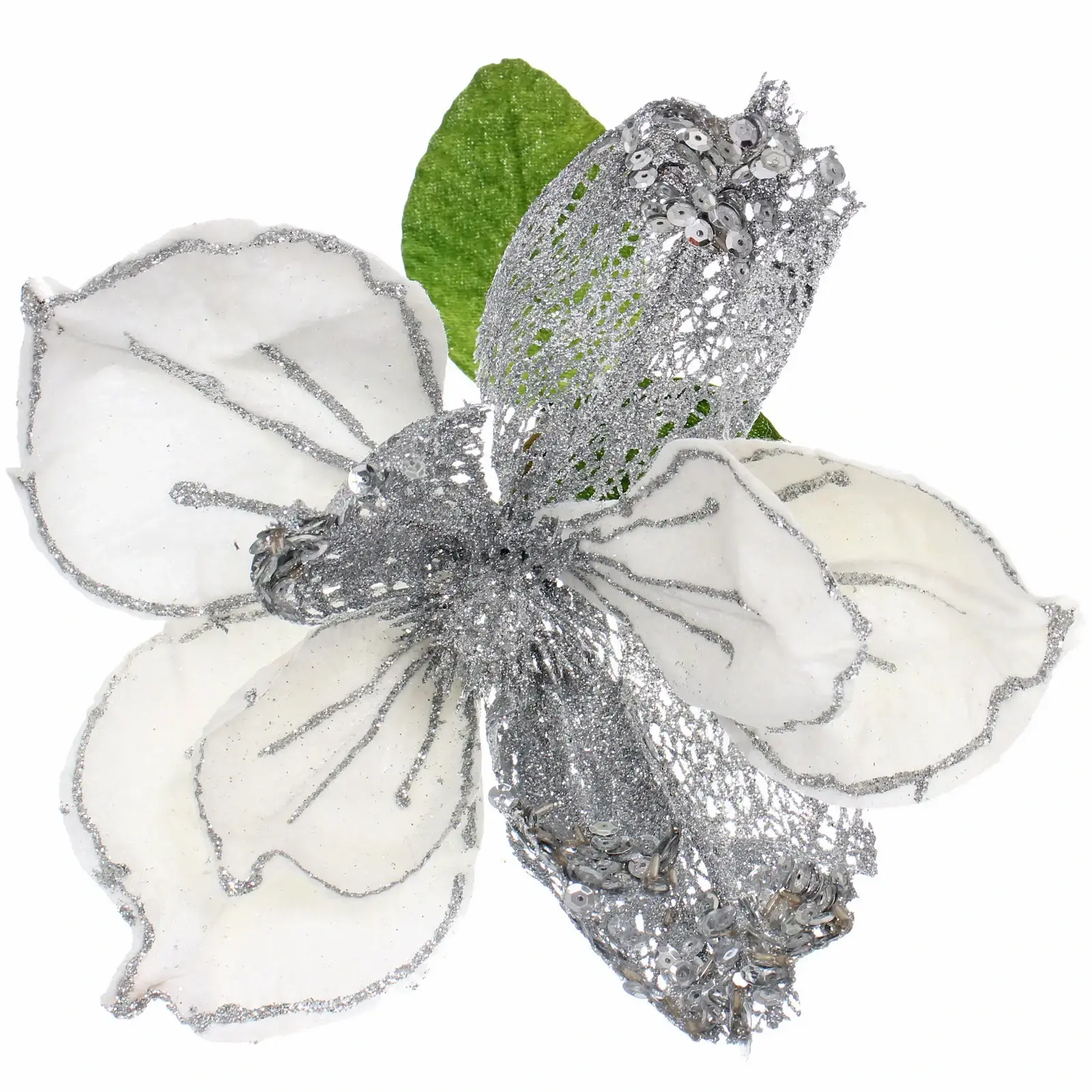 Новогоднее украшение «Пуансеттия» 23 см, текстиль, белый/серебро – праздничный декор для дома