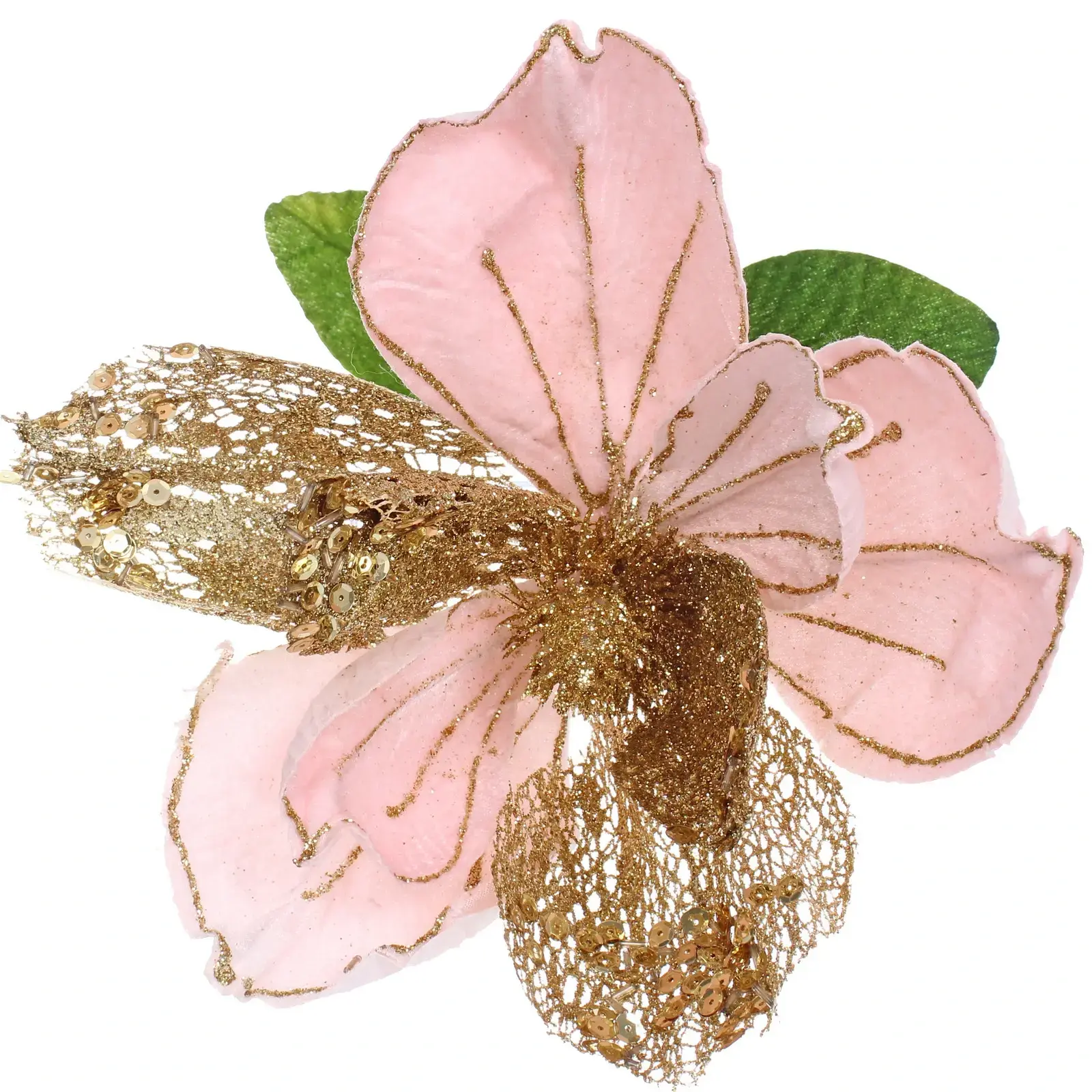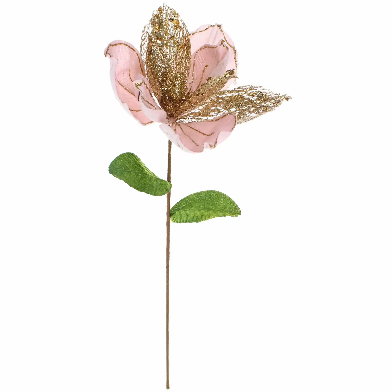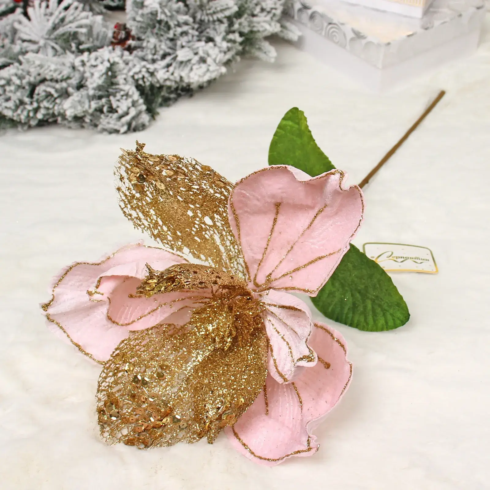 Это великолепное новогоднее украшение станет ярким акцентом в вашем интерьере. Сочетание нежного розового цвета с золотыми вкраплениями придаст вашему дому уют и праздничное настроение. Искусственный цветок высотой 23 см выполнен из текстиля, что обеспечивает долговечность и легкость в уходе. Он идеально подходит для декорирования как жилых помещений, так и офисов, создавая атмосферу тепла и уюта.