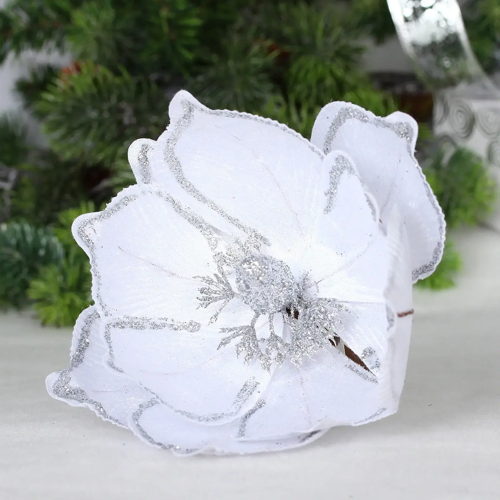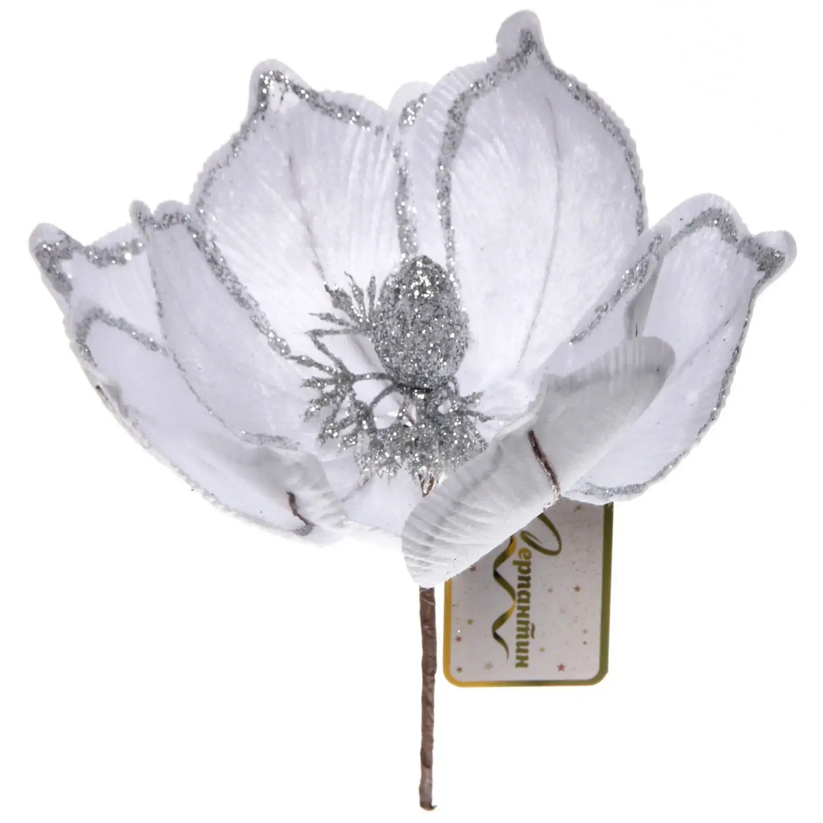 Украшение новогоднее 'Пуансеттия - Симфония' 21см, белый с серебром, текстиль/пластик