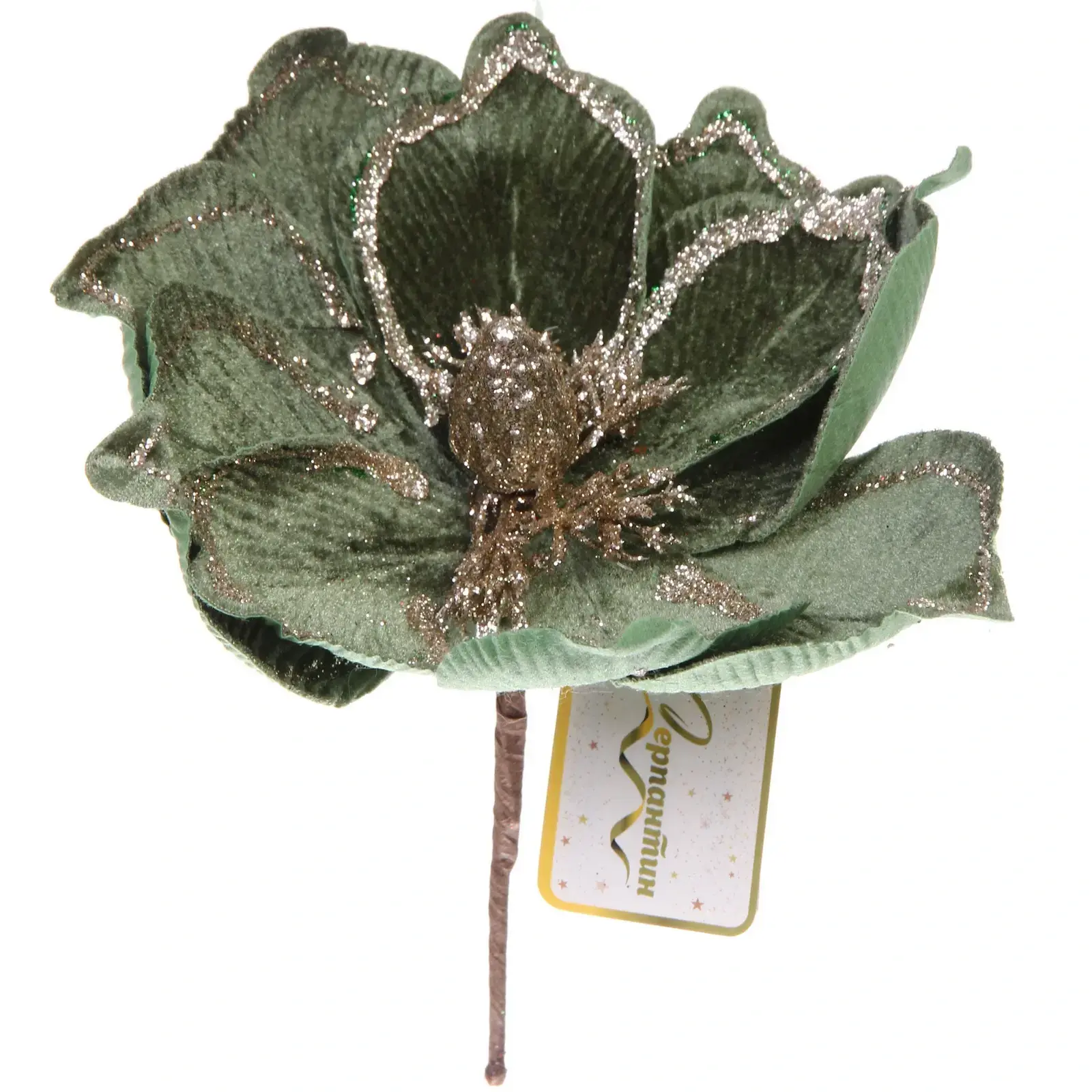 Искусственная пуансеттия с бархатистыми лепестками и золотыми акцентами создаст праздничное настроение в вашем интерьере. Изумрудный цвет в сочетании с мерцающими деталями добавляет композиции благородства и гармонии.