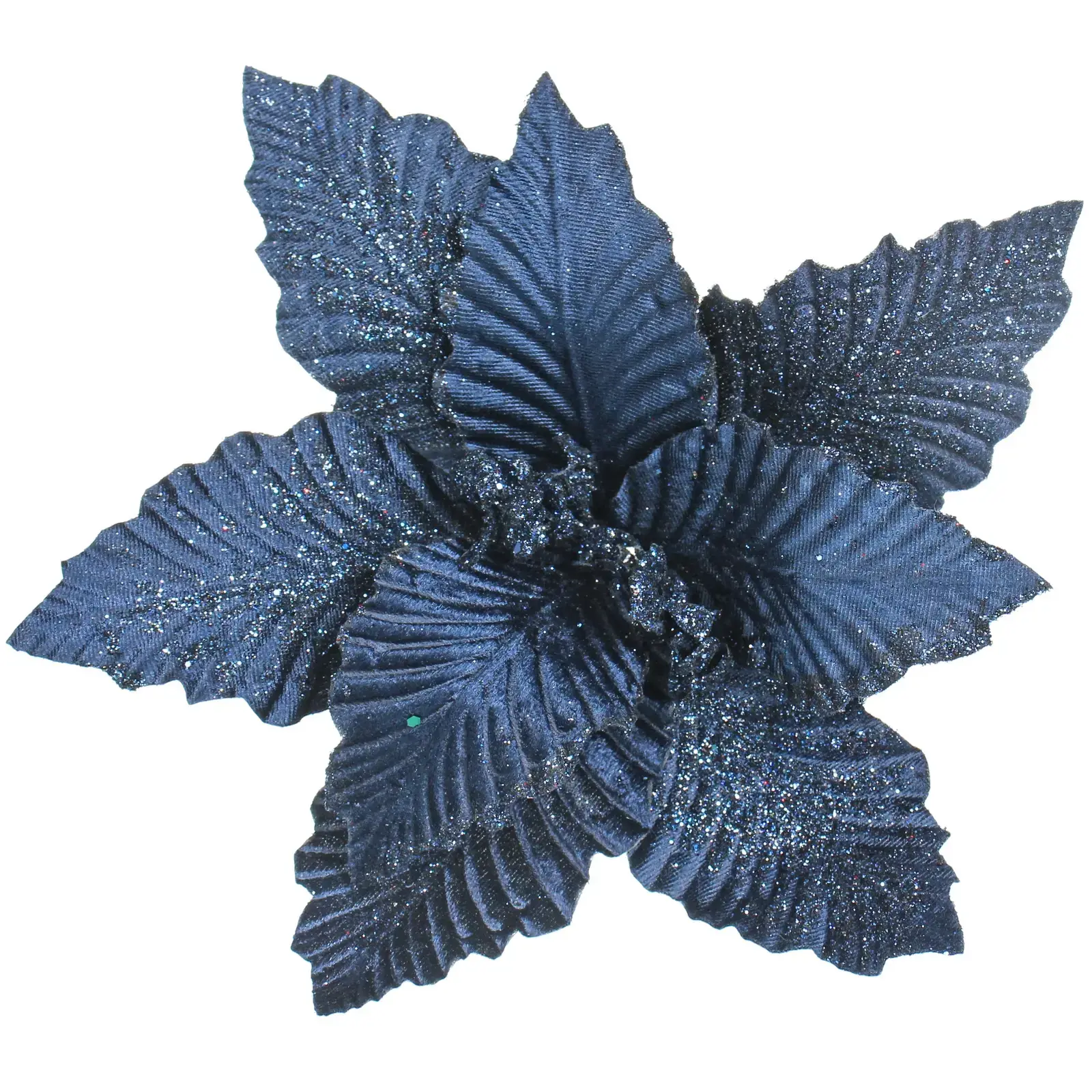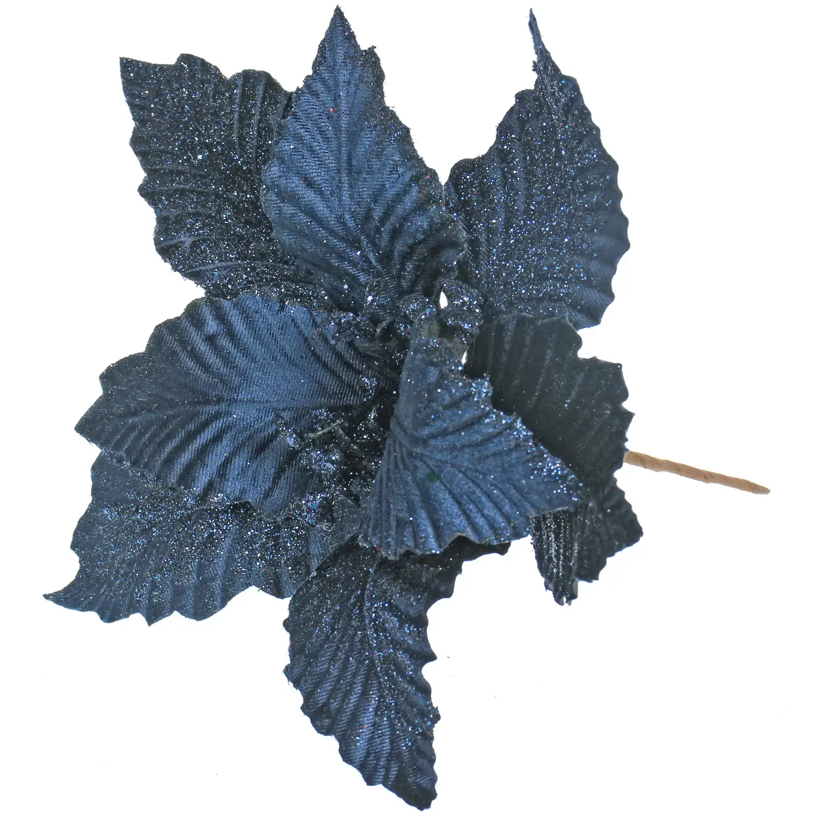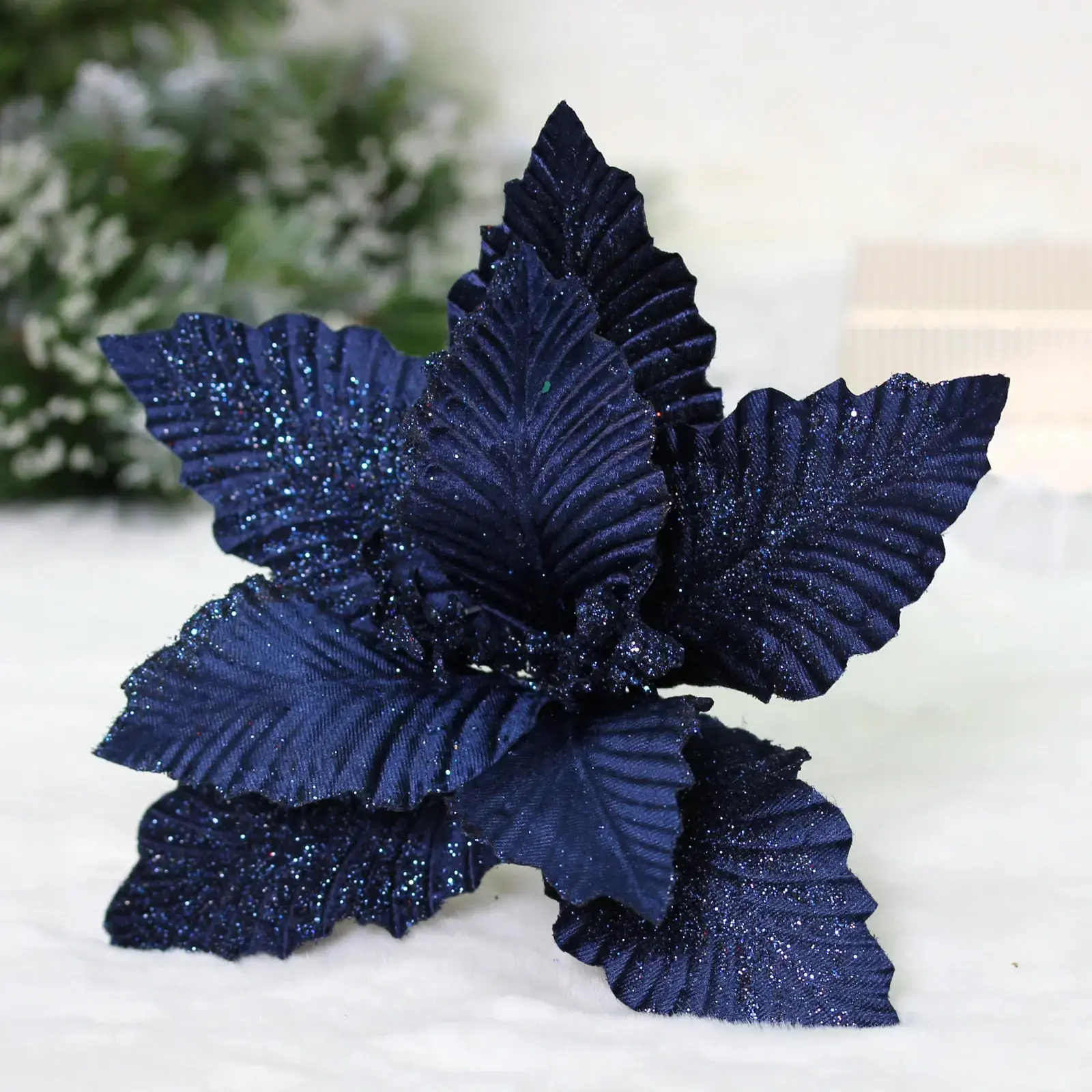 Искусственная пуансеттия с мерцающей поверхностью станет изысканным акцентом новогоднего декора. Глубокий сапфировый оттенок и реалистичная текстура листьев добавят интерьеру праздничного шика без необходимости ухода за живым растением.