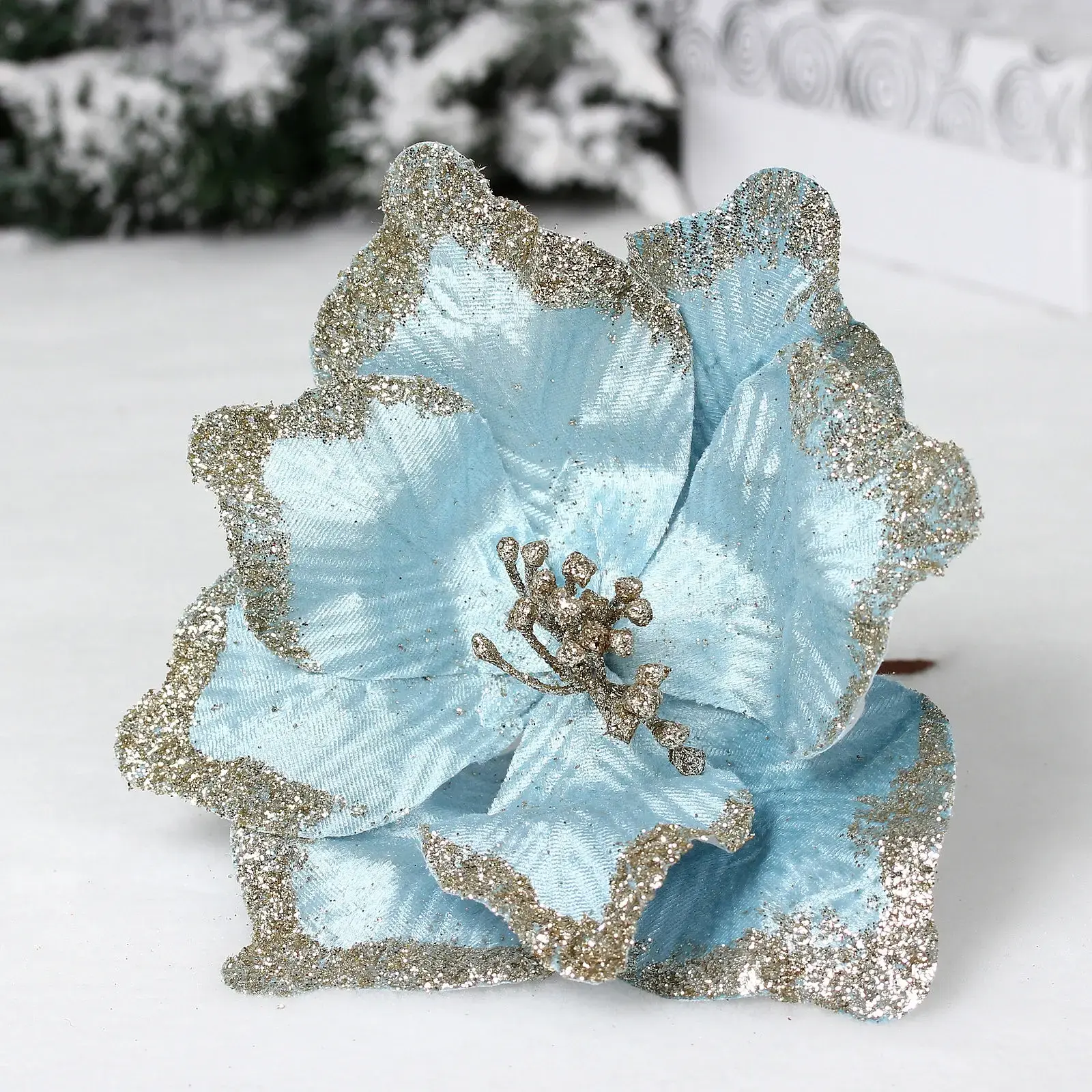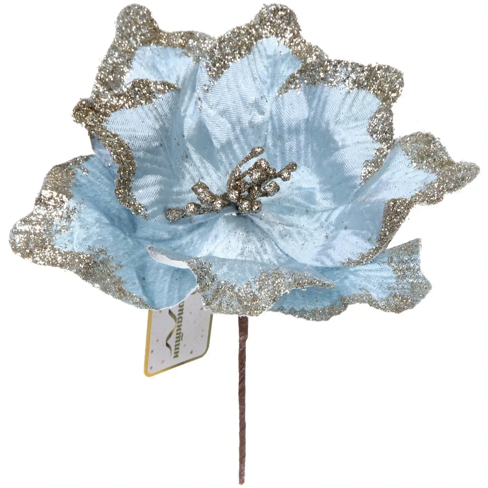 Цветок новогодний 'Пуансеттия - Волшебный день' 23см, голубой с глиттером