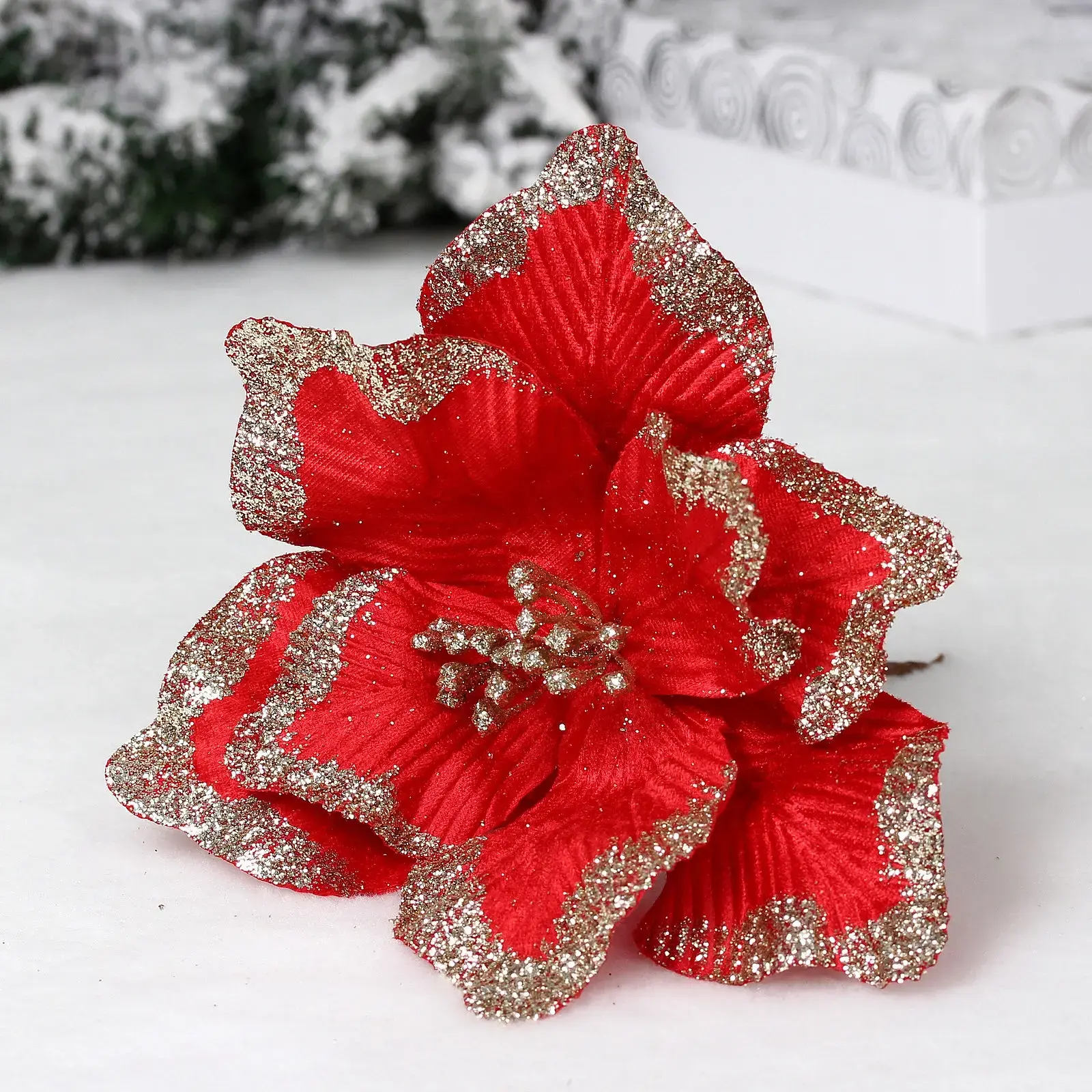 Искусственная пуансеттия с золотистыми акцентами создаст атмосферу зимней сказки в вашем доме. Идеально подходит для декора камина, праздничного стола или создания рождественского венка.