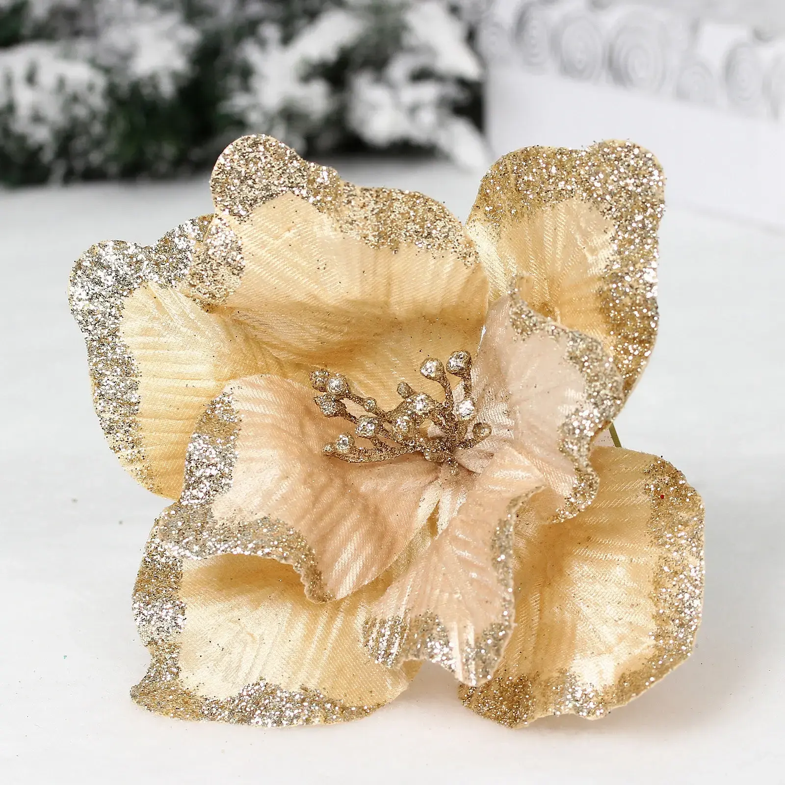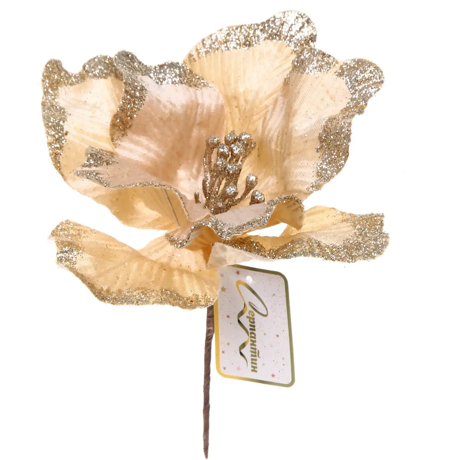 Новогоднее украшение "Пуансеттия - Волшебный день" станет идеальным акцентом в вашем праздничном декоре. Его нежный золотисто-бежевый оттенок и мерцающие края лепестков добавят особого шарма вашему интерьеру.