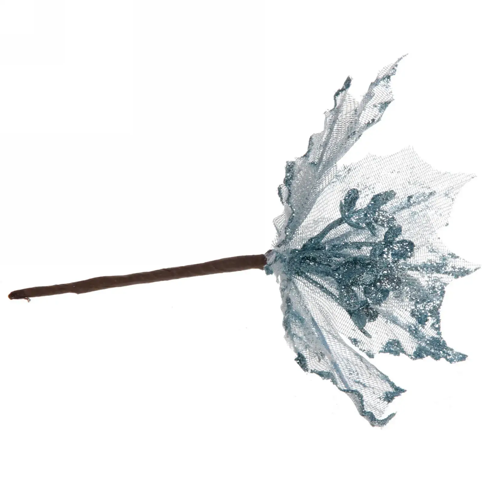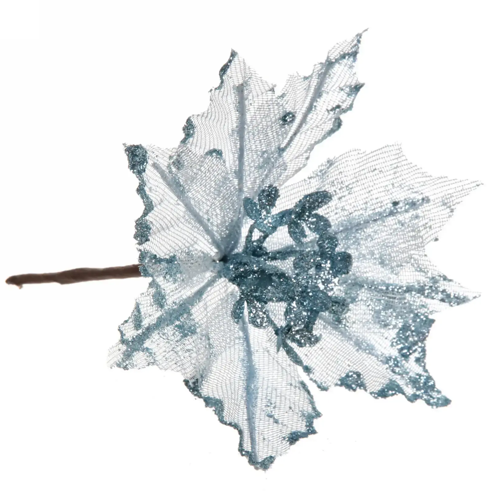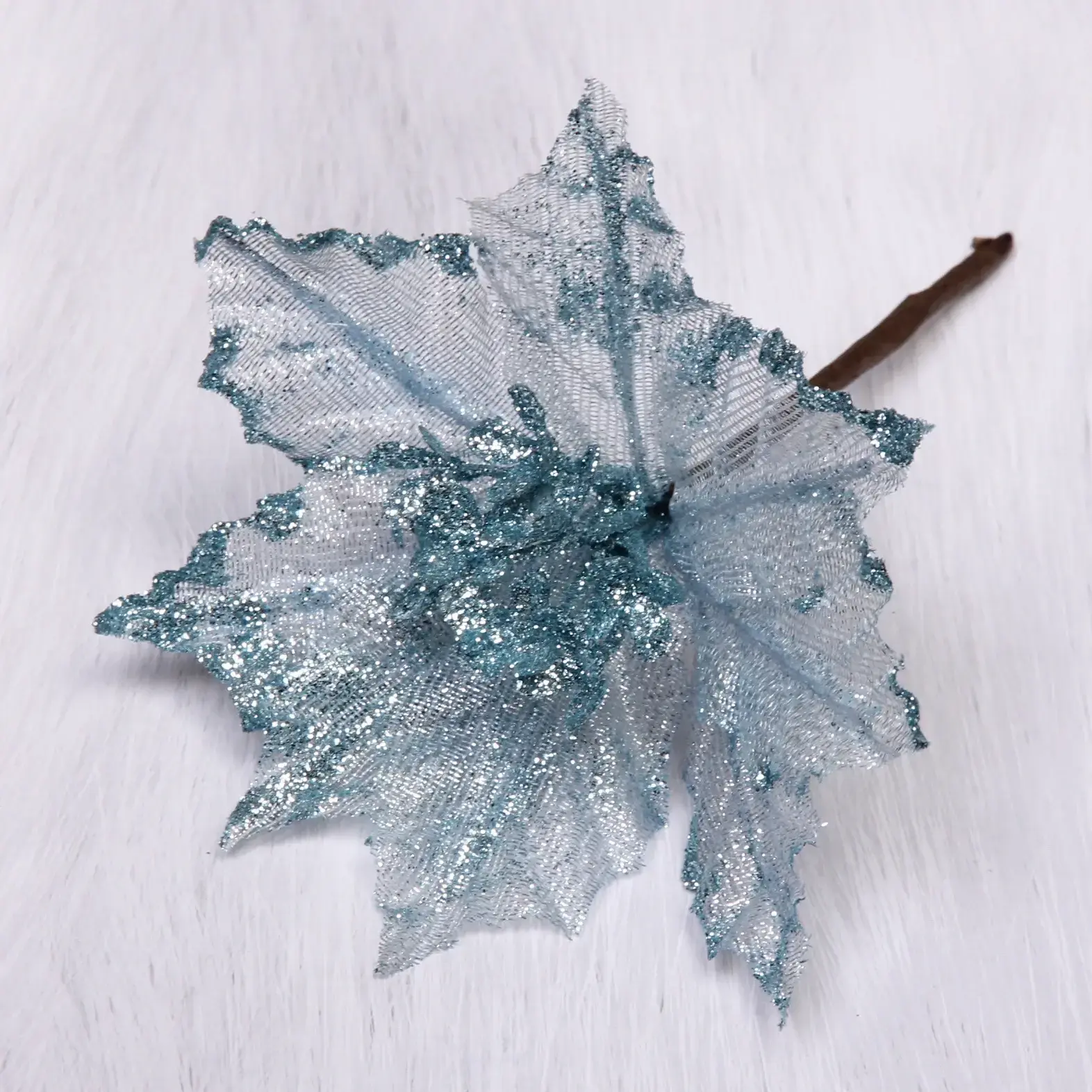 Новогоднее украшение «Пуансеттия-Вуаль» — это идеальный способ добавить волшебства в ваш дом. С его помощью вы сможете создать уютную и праздничную атмосферу, которая порадует вас и ваших близких. Это изделие выполнено из полупрозрачной сетчатой ткани светло-голубого цвета с блестящими элементами, что придаёт ему особую изысканность и элегантность.