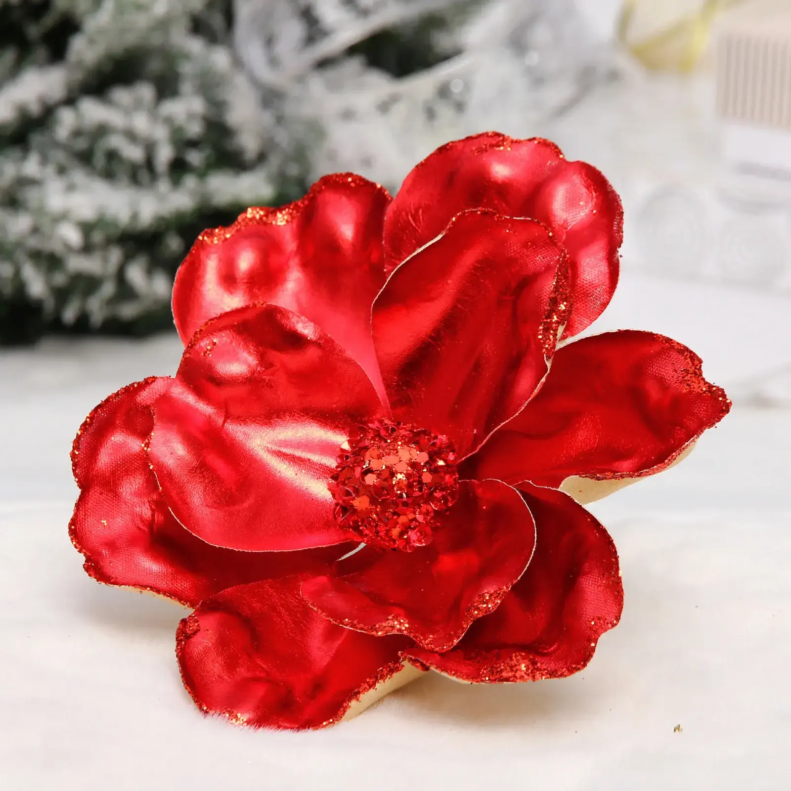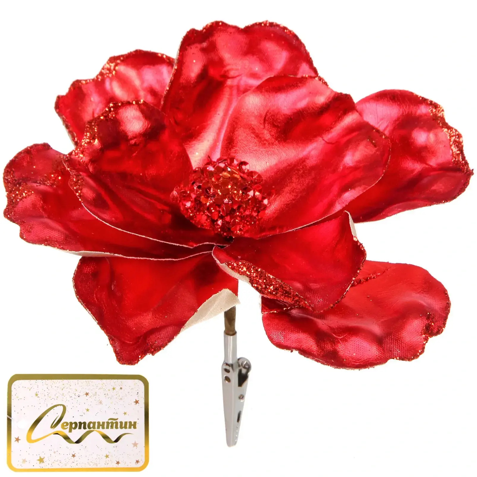 Декоративный цветок идеально подходит для украшения ёлки, гирлянд, праздничных композиций или подарочных упаковок. Металлический зажим-клипса позволяет легко закрепить его на ветках, тканевых поверхностях или других элементах интерьера, не повреждая основу.
