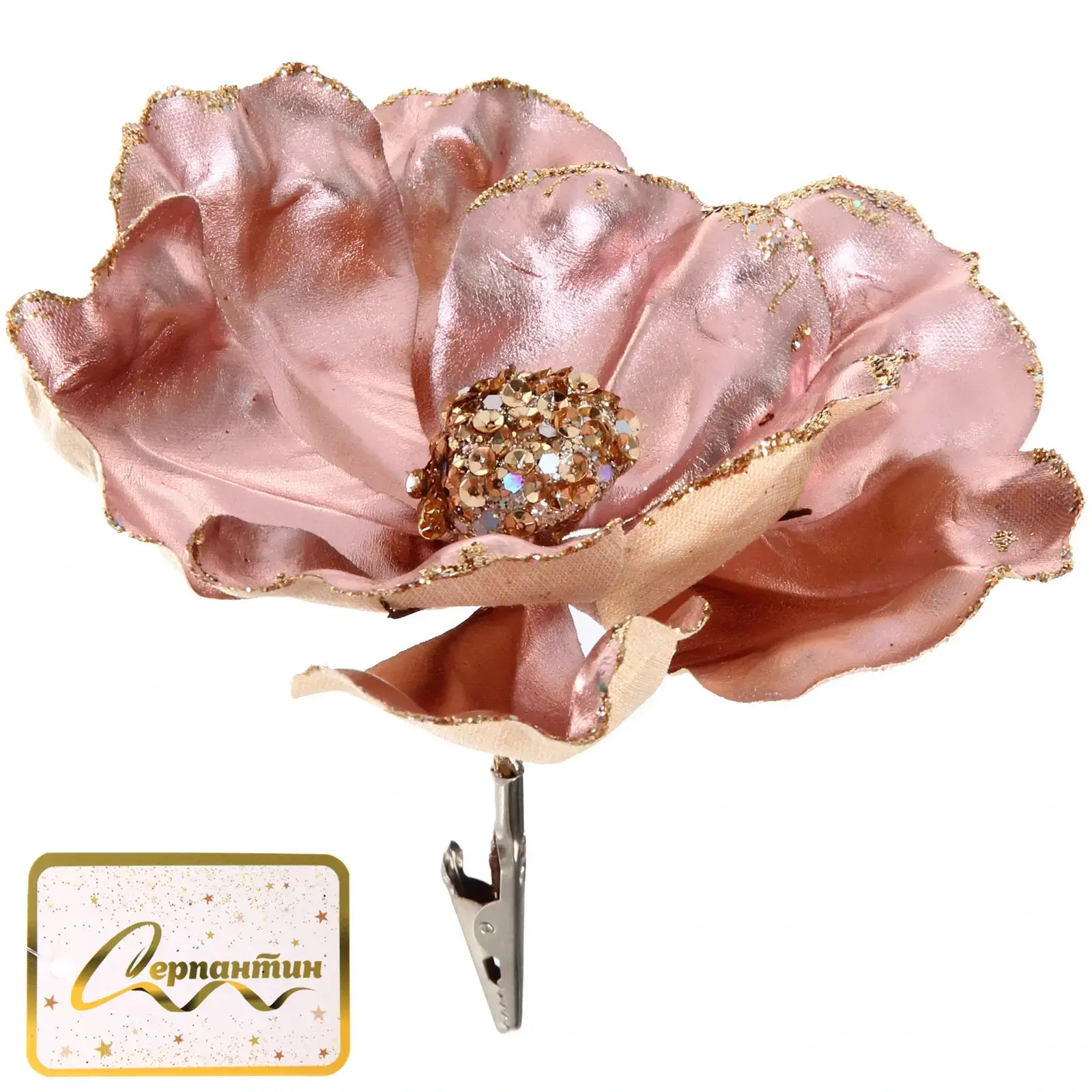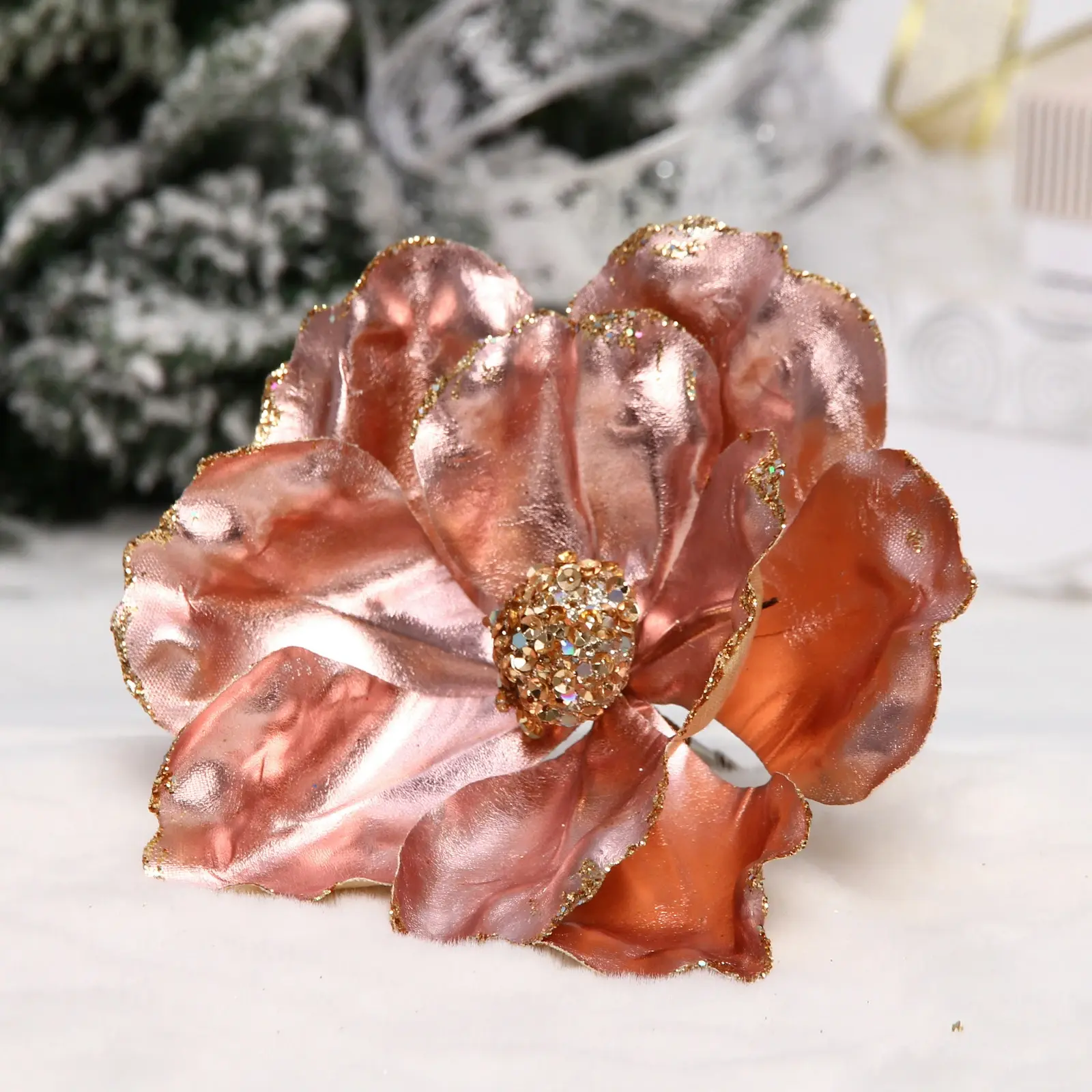 Создайте атмосферу зимней сказки в вашем доме с помощью изысканного декоративного цветка в оттенке розового золота. Элегантные лепестки с золотистым кантованием и мерцающими блёстками отражают свет гирлянд и свечей, создавая теплое сияние и праздничное настроение.