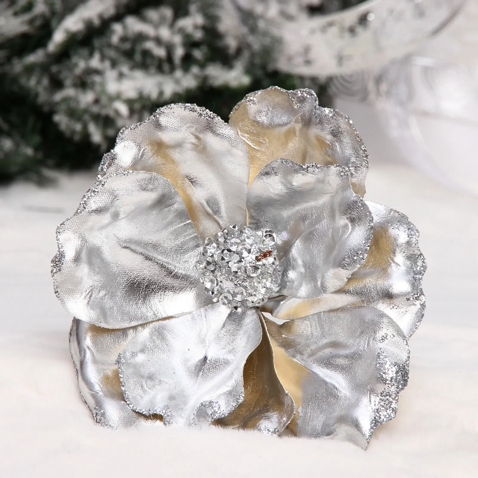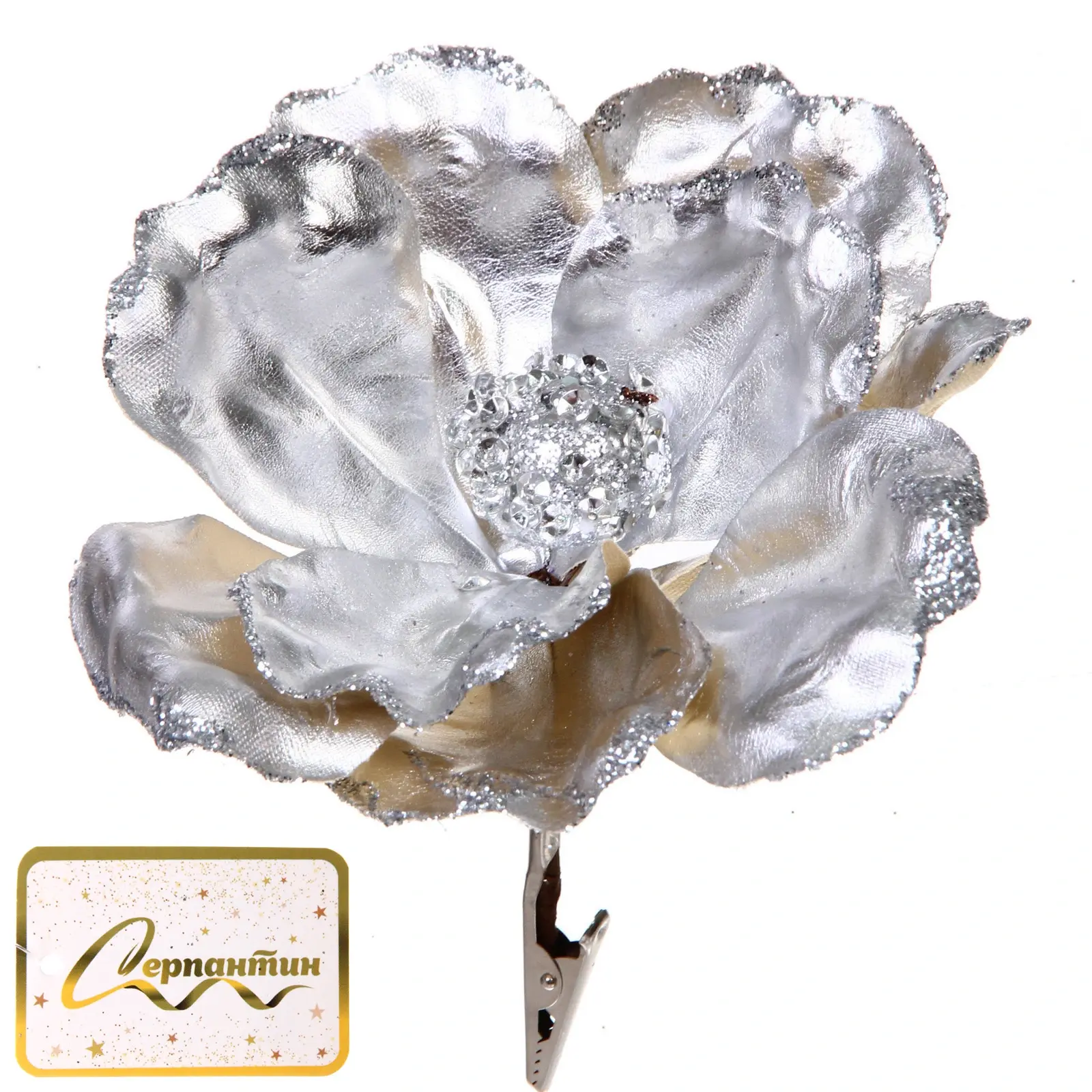 Создайте атмосферу зимней сказки с изысканным декоративным цветком, который сразу привлечёт внимание своим утонченным блеском. Серебристые лепестки с лёгким золотистым отливом и кромкой, украшенной мерцающими блёстками, придают интерьеру праздничный, но при этом сдержанный шарм.