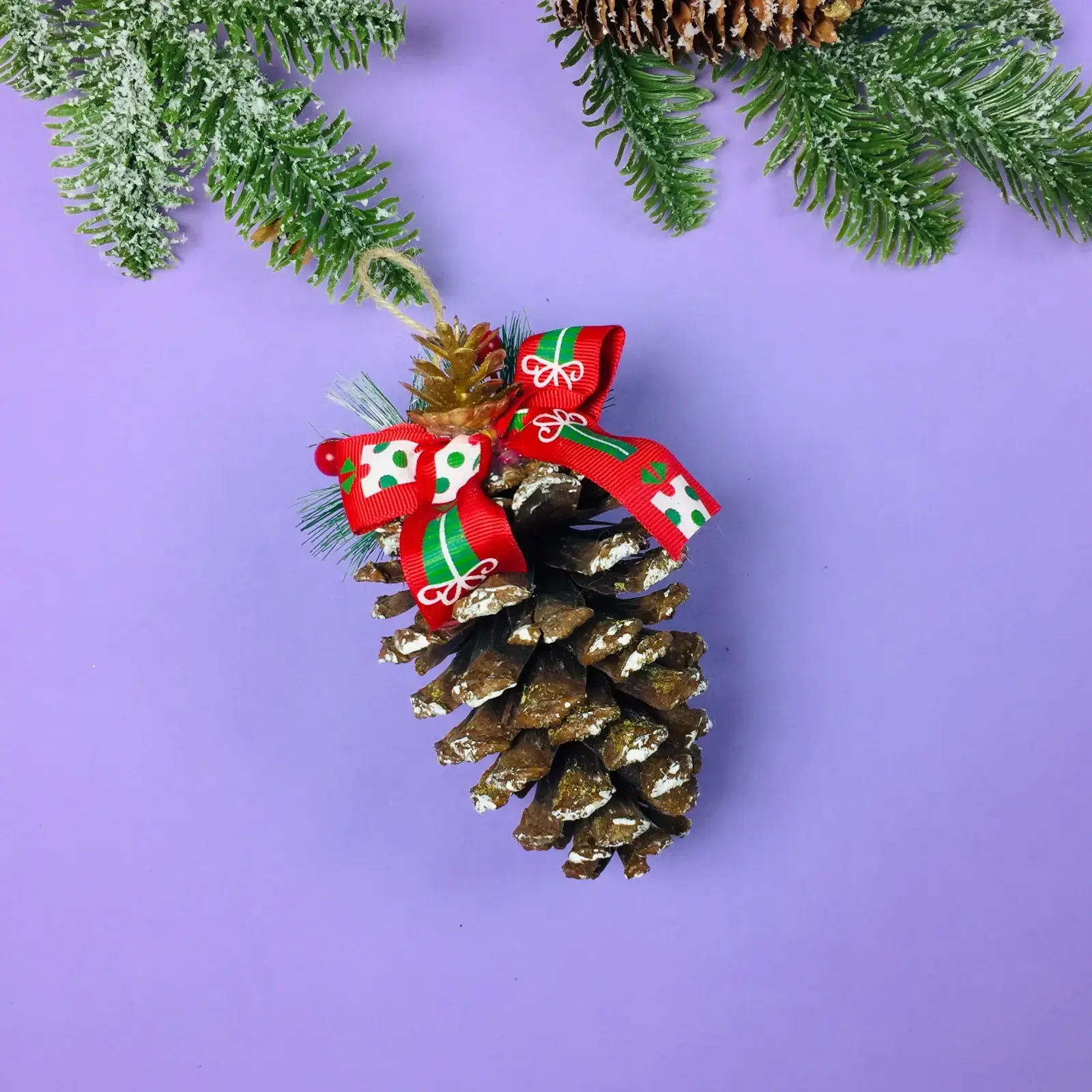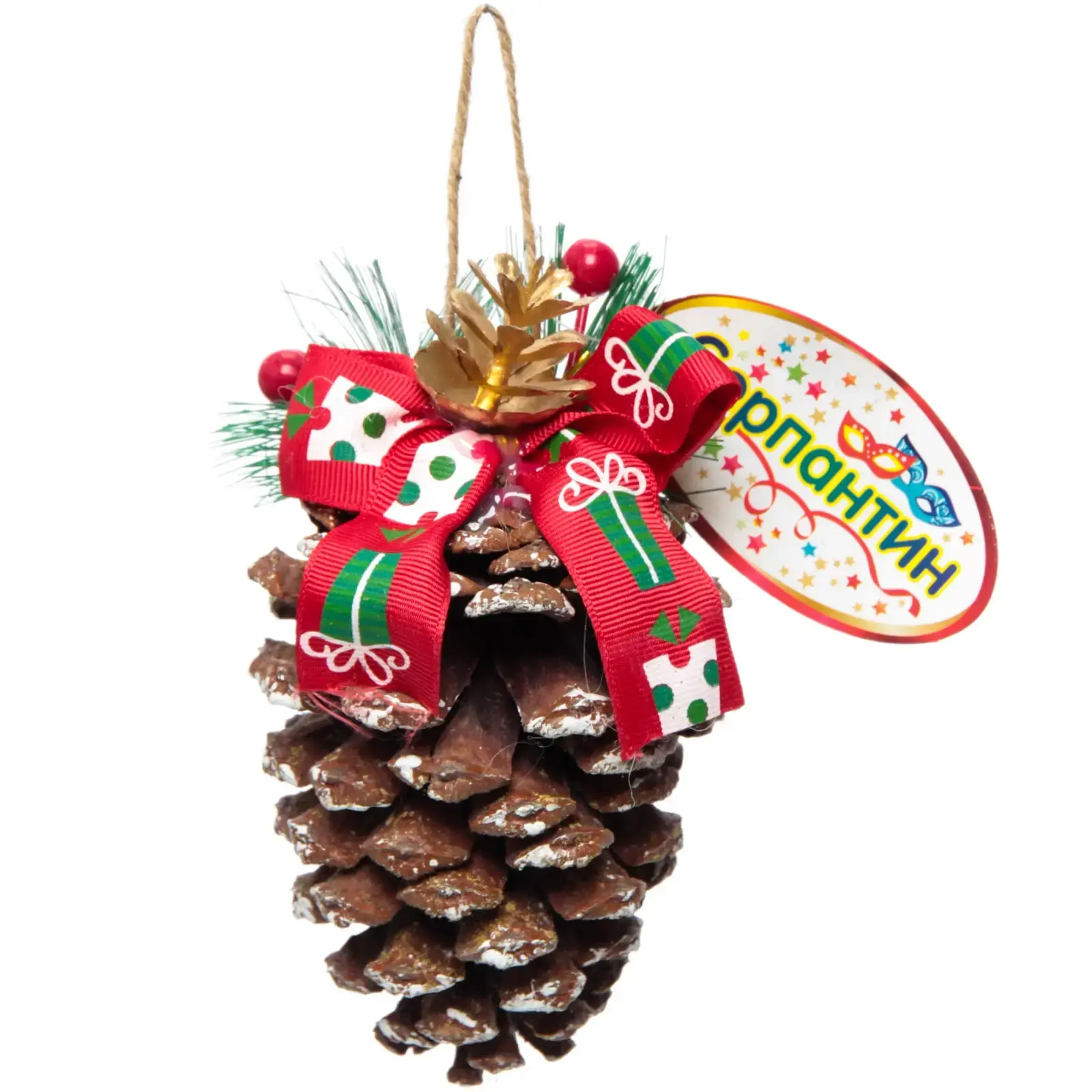 Это украшение выделяется своим качественным исполнением и детализированным дизайном. Оно выполнено из прочного пластика, что обеспечивает долговечность и устойчивость к внешним воздействиям. Коричневый цвет шишки с легкими белыми вкраплениями создает эффект инея, а яркая красная лента с узорами добавляет праздничного настроения. Декоративные элементы, такие как зеленые иголки и красные шарики, делают это украшение по-настоящему уникальным.