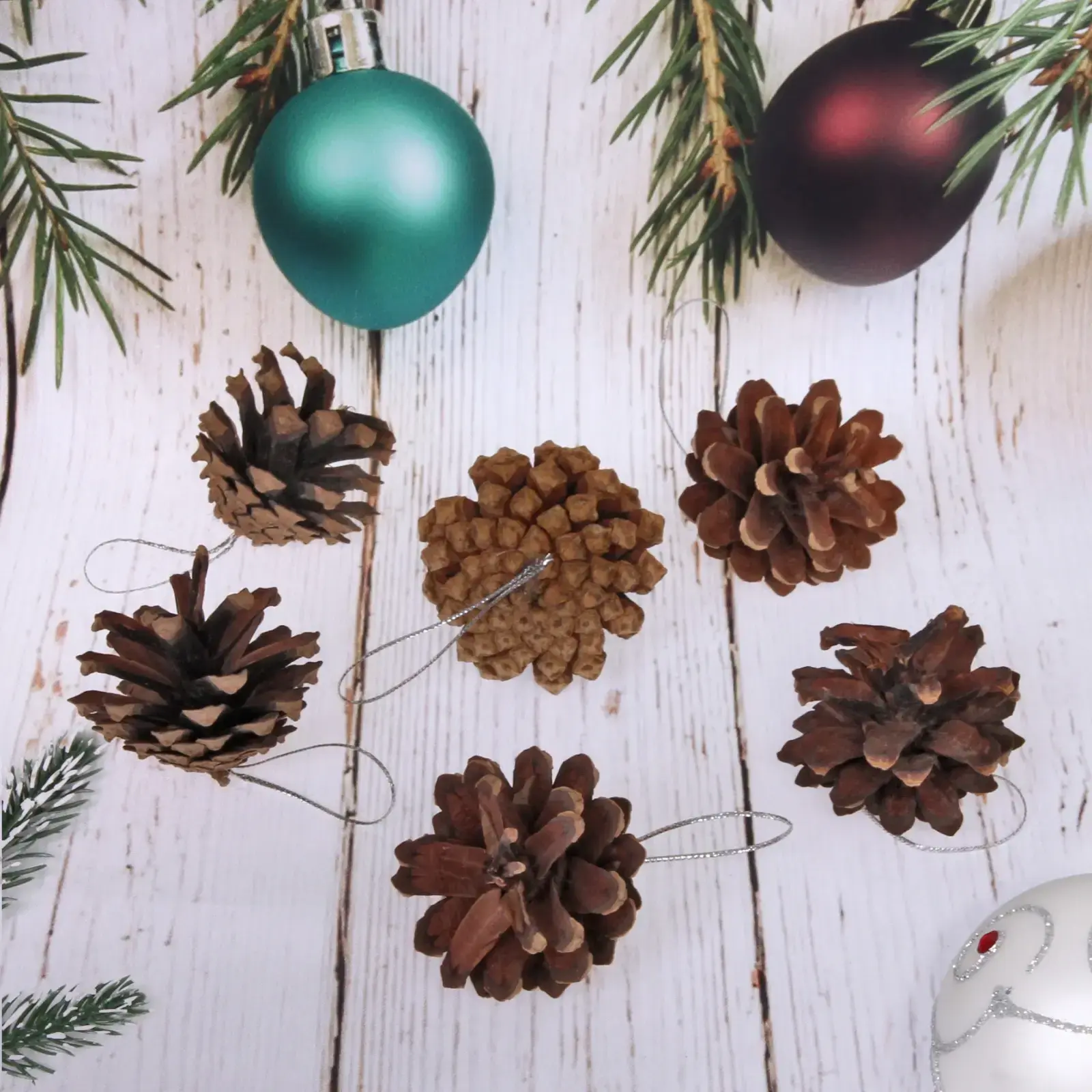 Шишки легко подвешиваются благодаря тонкой металлической проволоке, что позволяет вам использовать их в различных декорациях. Они идеально подходят для украшения елки, создания венков или использования в качестве элементов новогоднего декора на столе. Эти шишки подойдут как для домашнего использования, так и для оформления общественных пространств, таких как кафе или магазины.