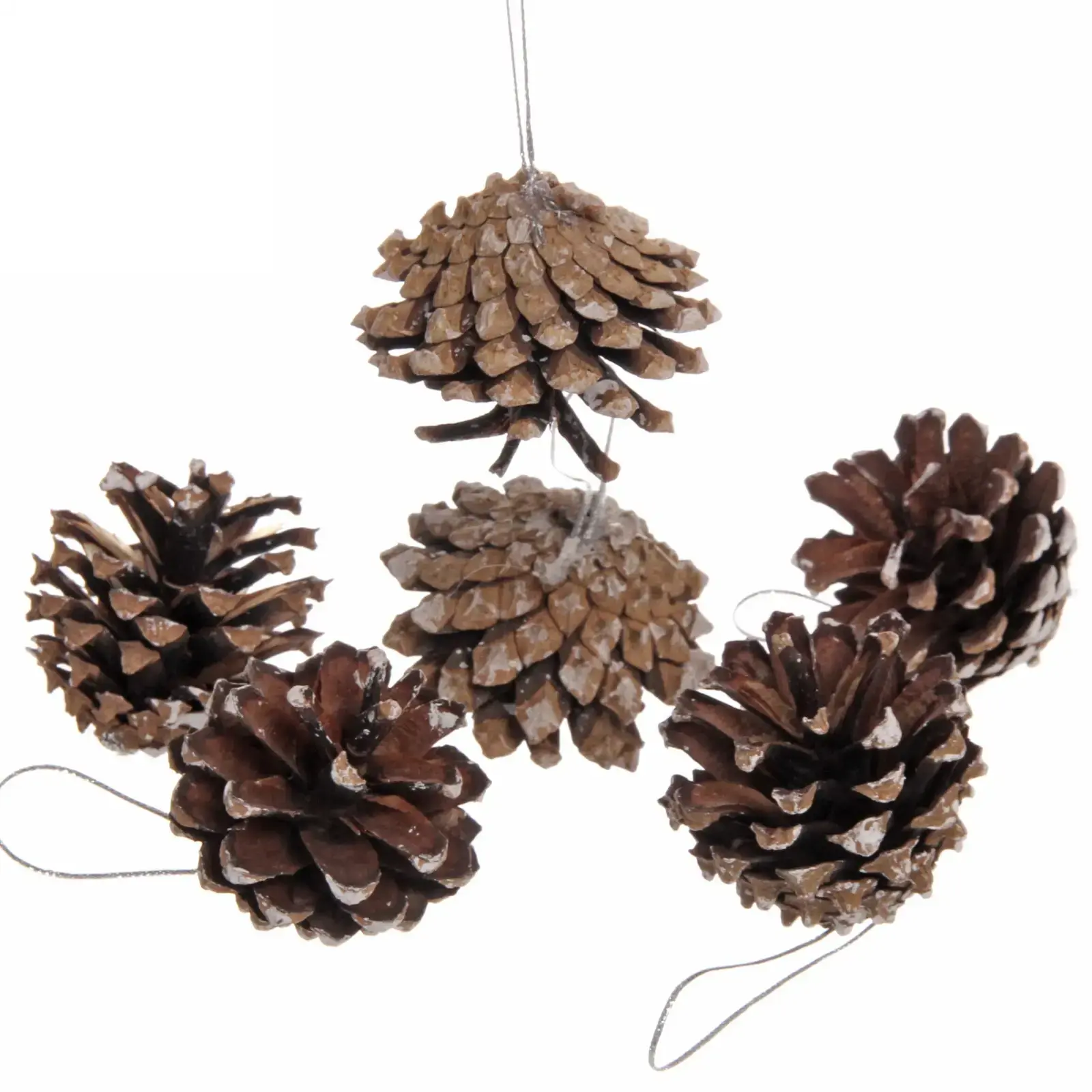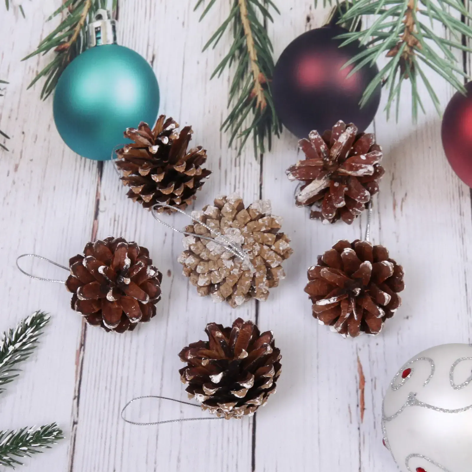 Шишки имеют размер 5,5 см и поставляются в наборе из 6 штук. Каждая шишка оснащена петлей из тонкой нити, что позволяет легко подвешивать их в любом месте. Эти украшения идеально подходят для создания праздничного настроения как в доме, так и на улице. Вы можете использовать их для декорирования елки, создания гирлянд или в качестве элементов для праздничного стола.