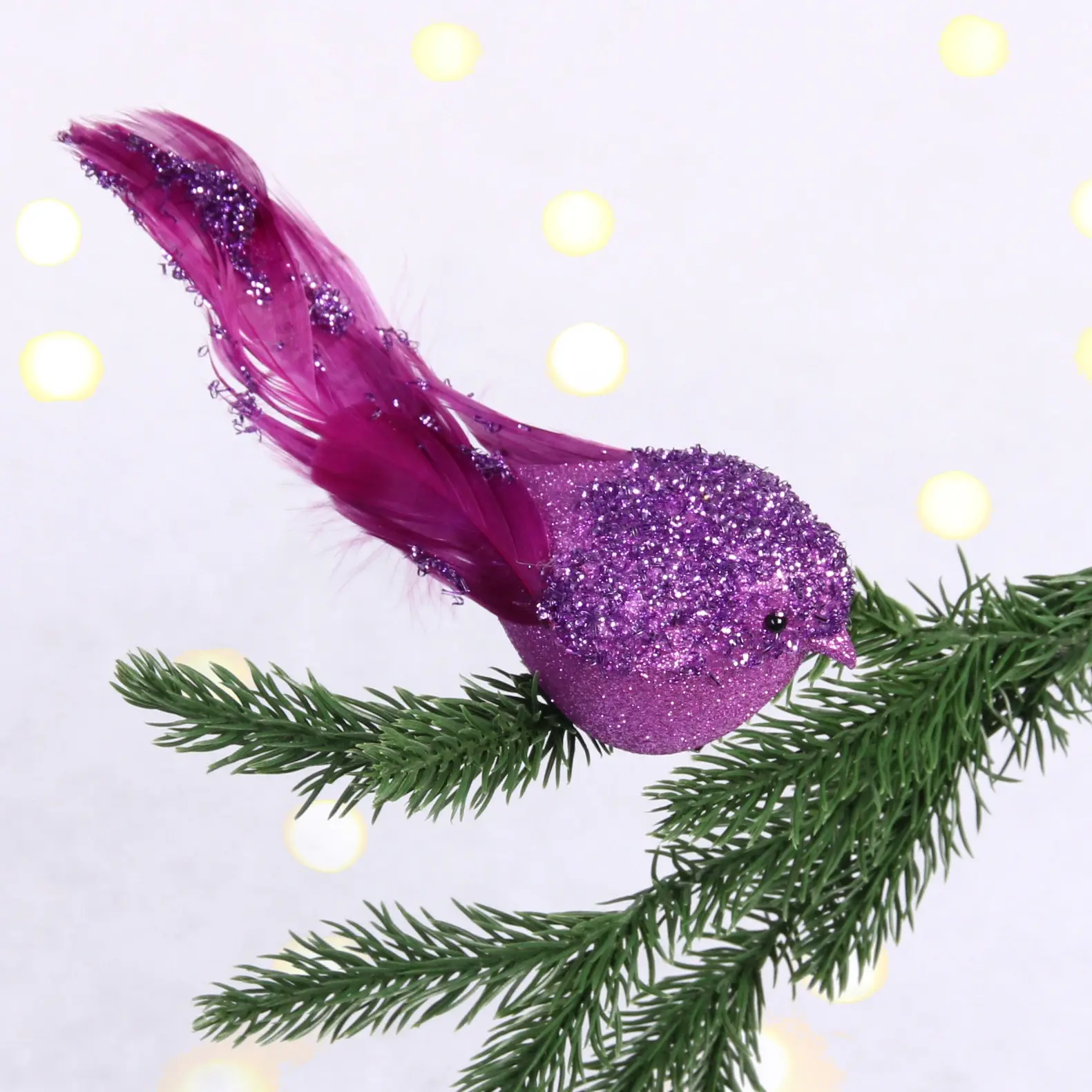 Декоративная птица "Сказочная птица" станет изысканным акцентом вашего праздничного декора. Её фиолетовый цвет с мерцающими блестками создаст атмосферу волшебства и радости.