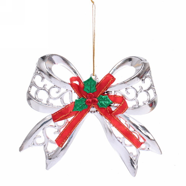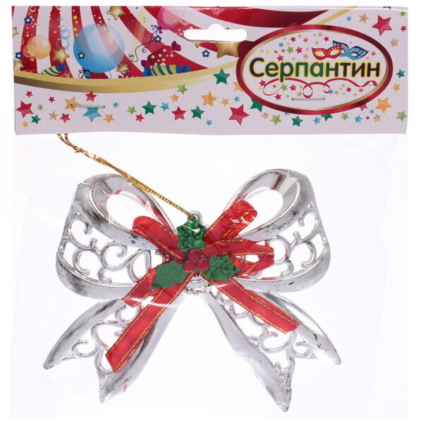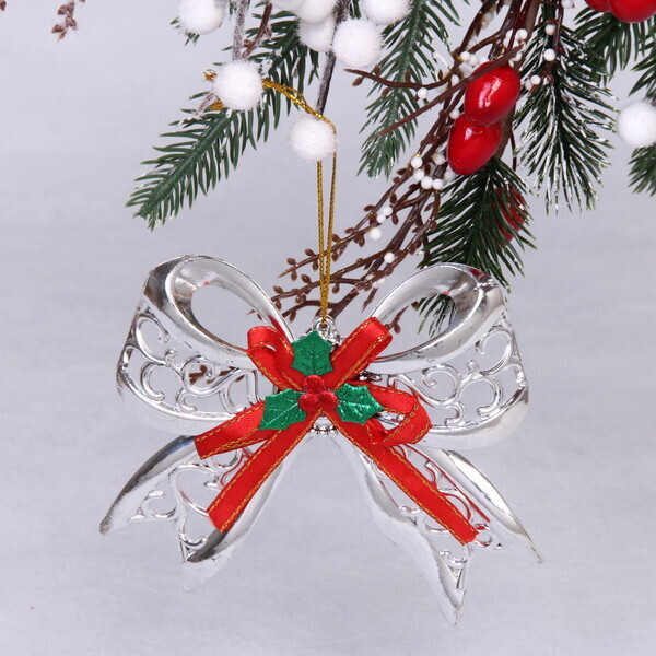 Размеры украшения составляют 10*12 см, что делает его достаточно заметным, но не слишком громоздким. Бант выполнен из пластика, что обеспечивает легкость и устойчивость к повреждениям. Серебристый цвет в сочетании с красной лентой и зелеными элементами придаст вашему празднику яркость и оригинальность.